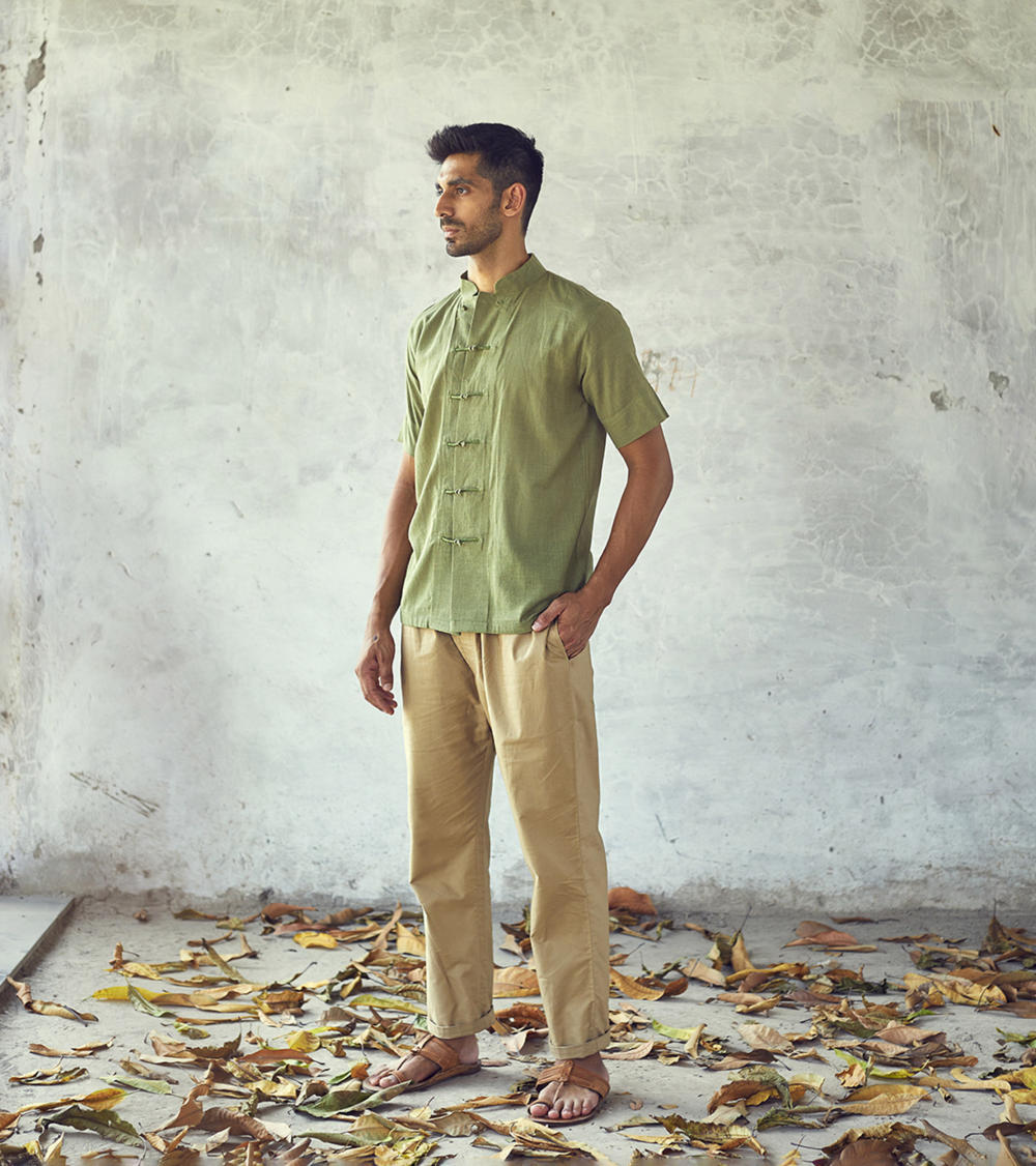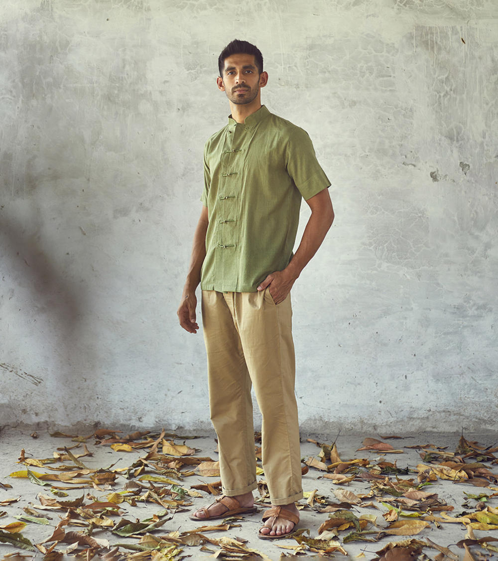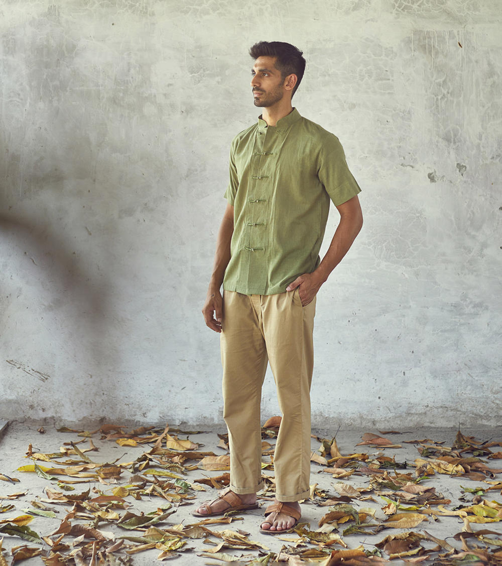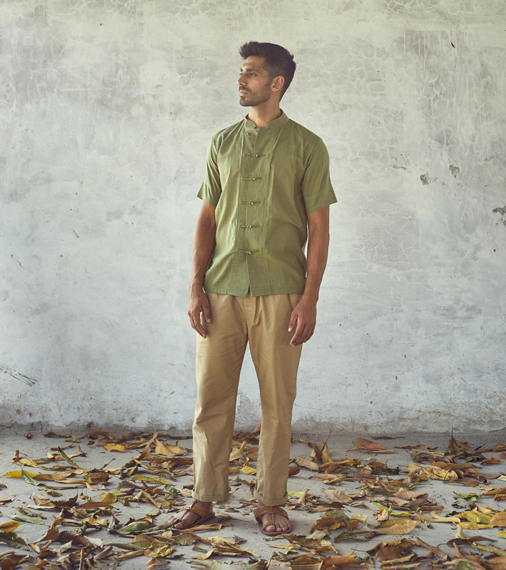 A regular fit, bottle green shirt in khadi cotton with a mandarin collar and frog button closure.