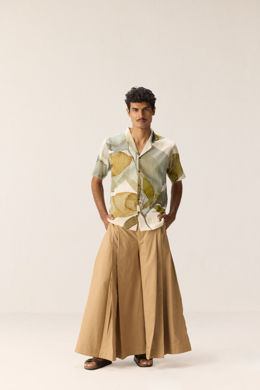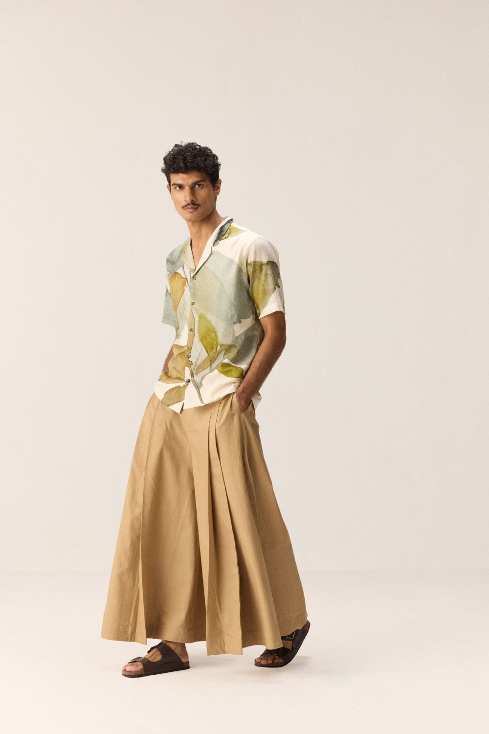 A fresh white cotton mul shirt adorned with earthy green and brown floral prints, featuring a single front pocket for understated utility. Lightweight and breathable, it’s a perfect balance of natural tones and relaxed style for effortless daywear.