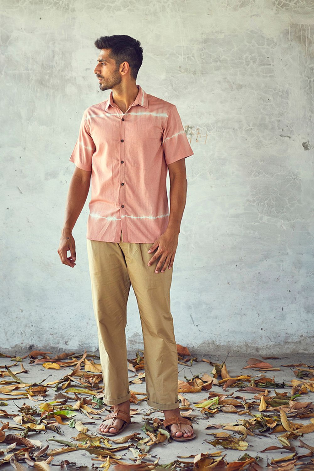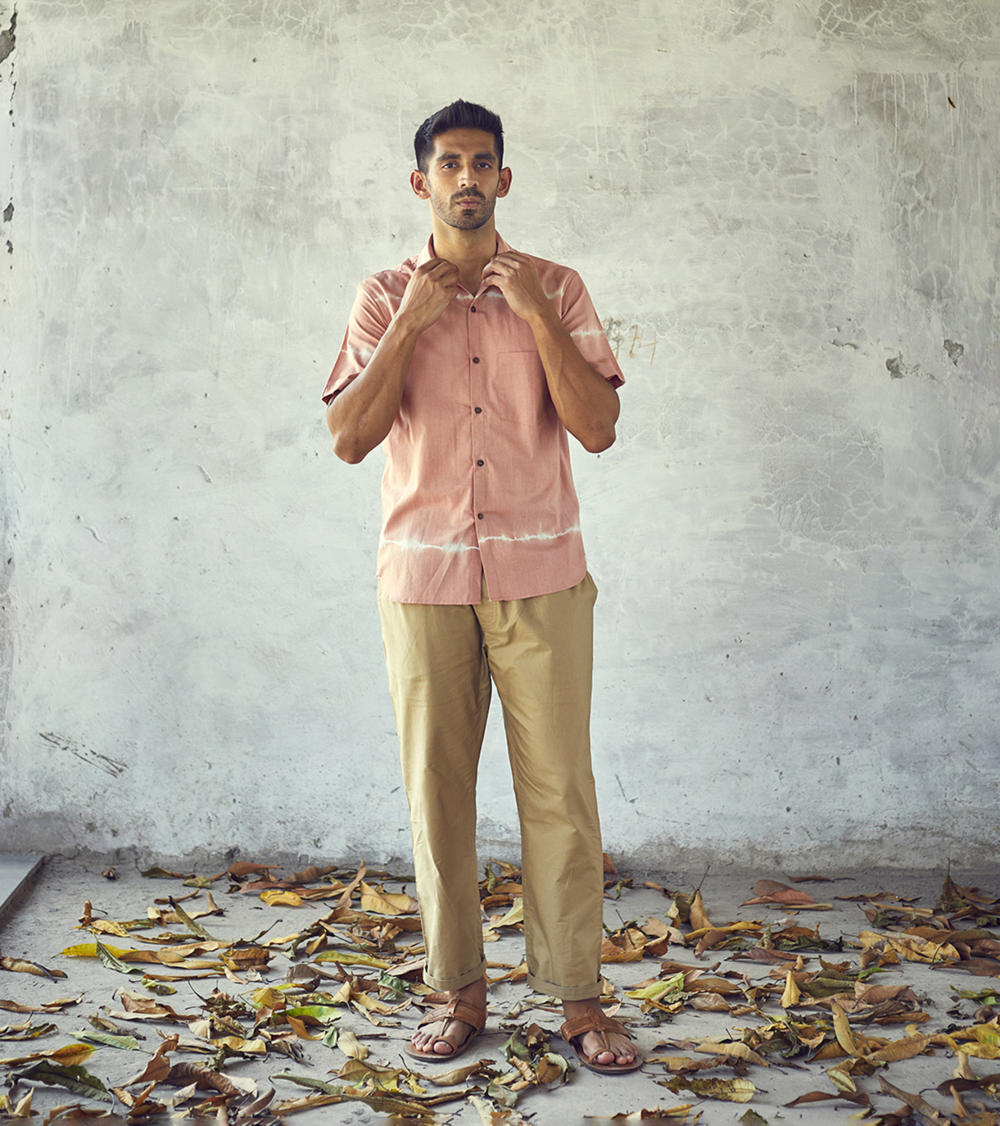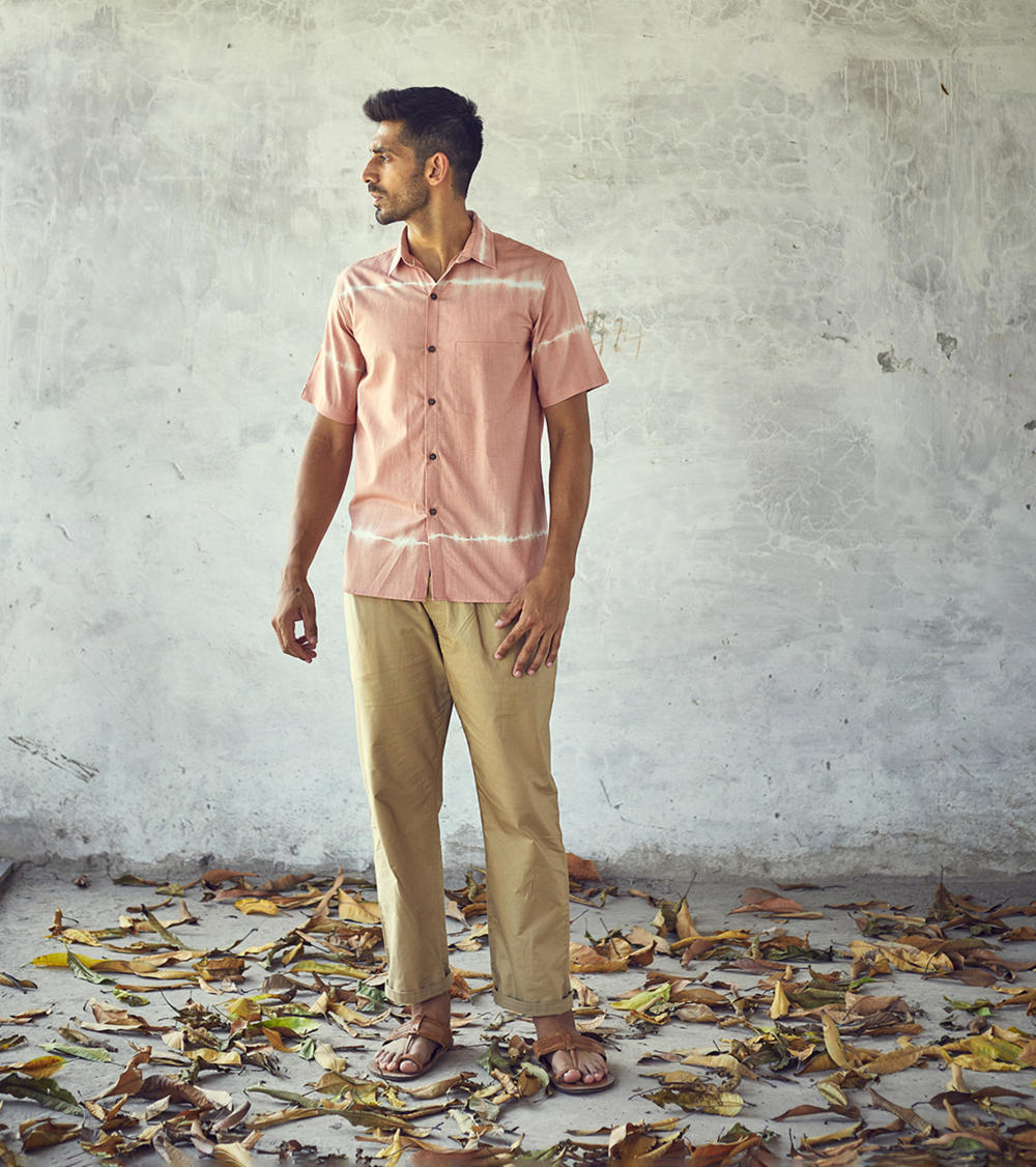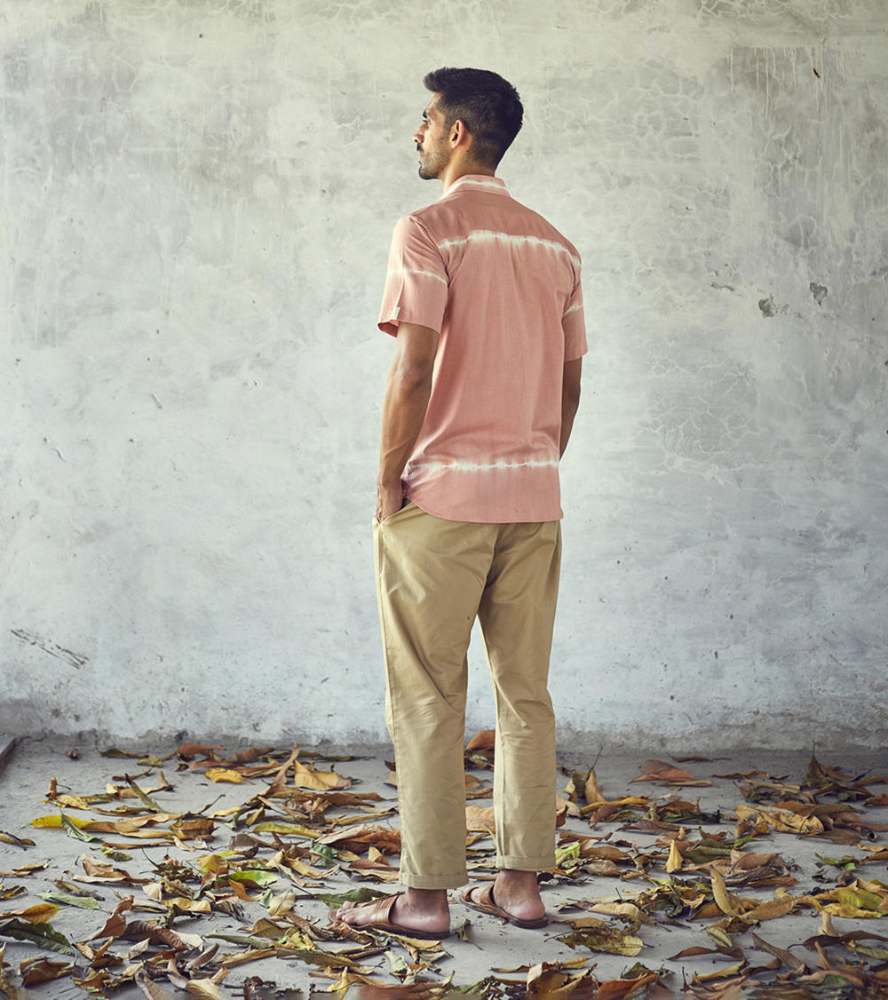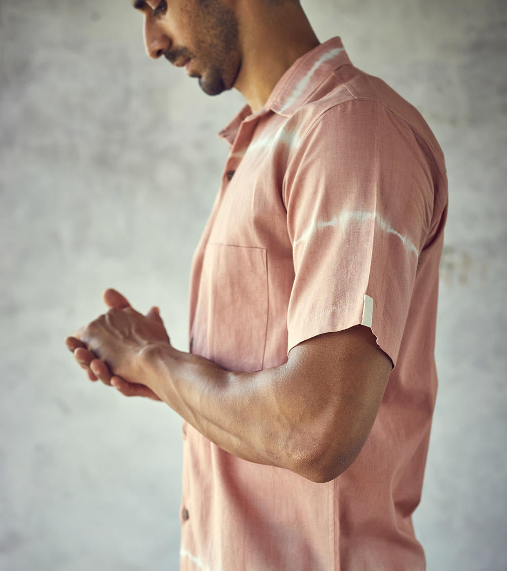 A shibori dyed salmon pink shirt in khadi cotton with spread collar and an up front patch pocket. A perfect match for any occasion.