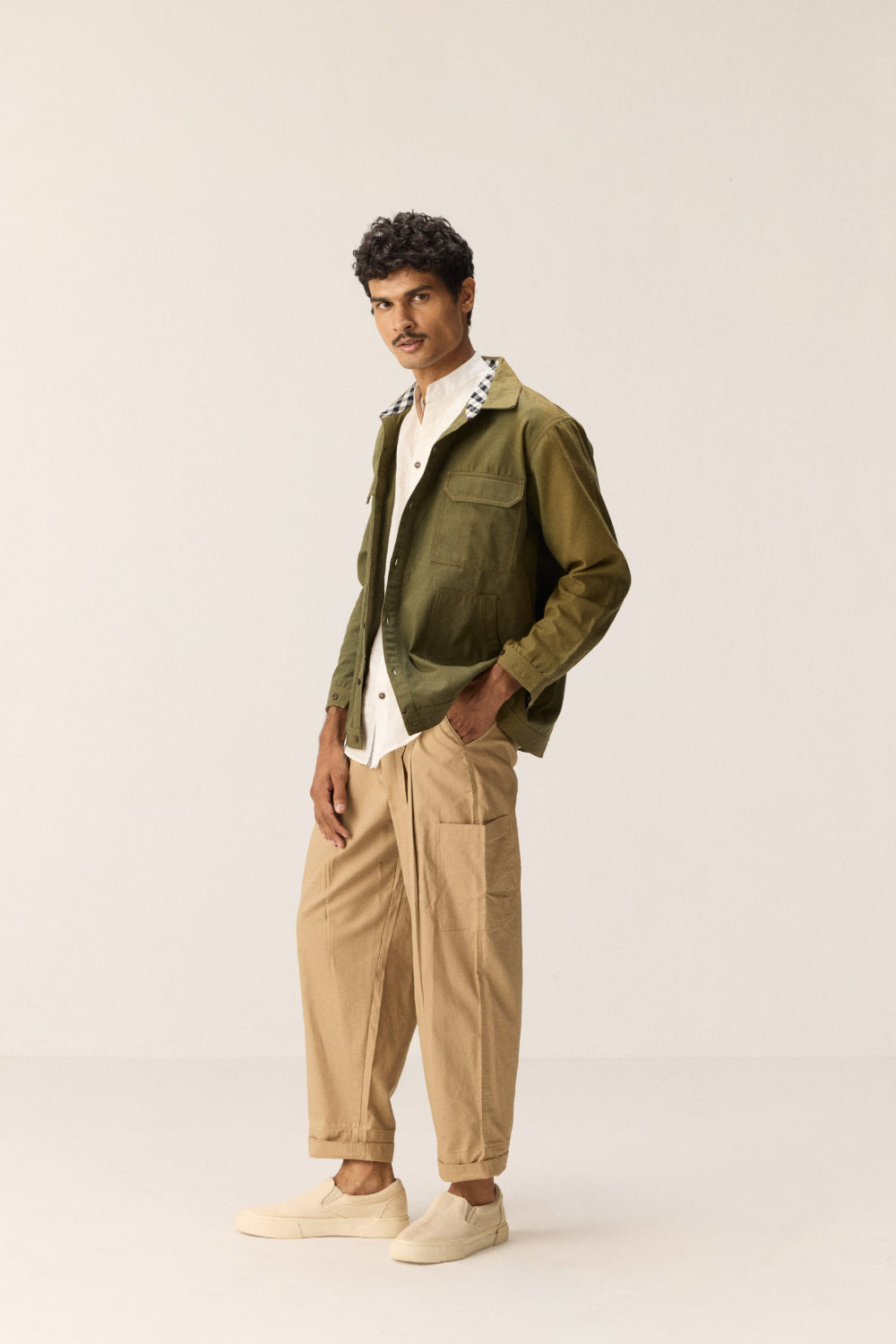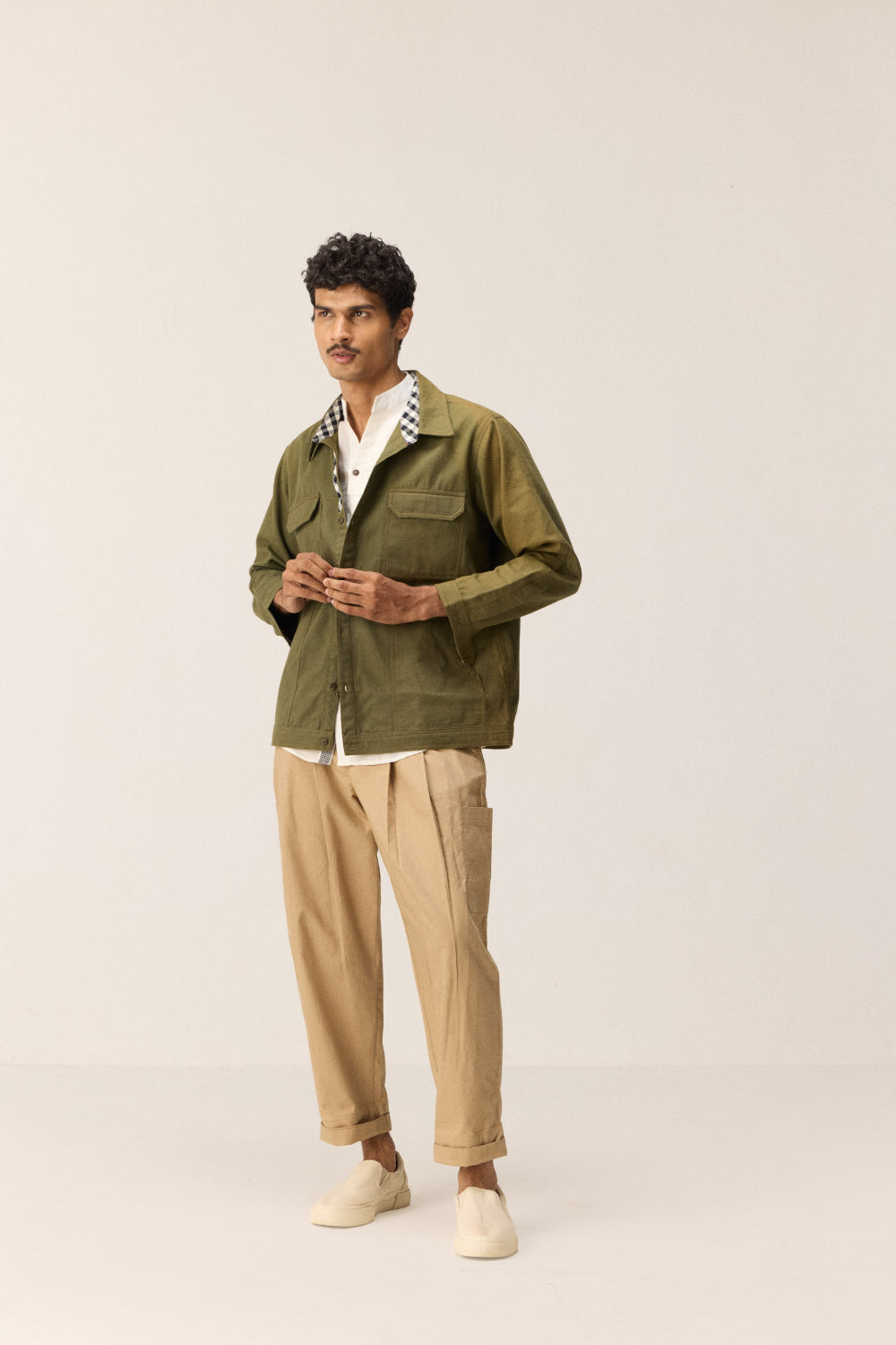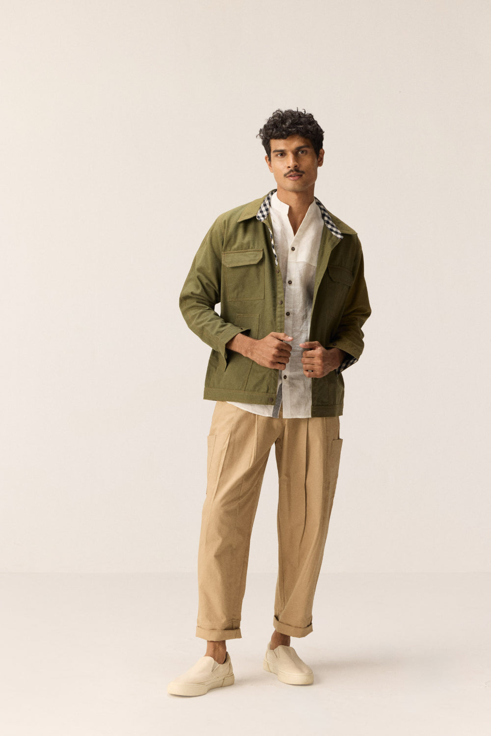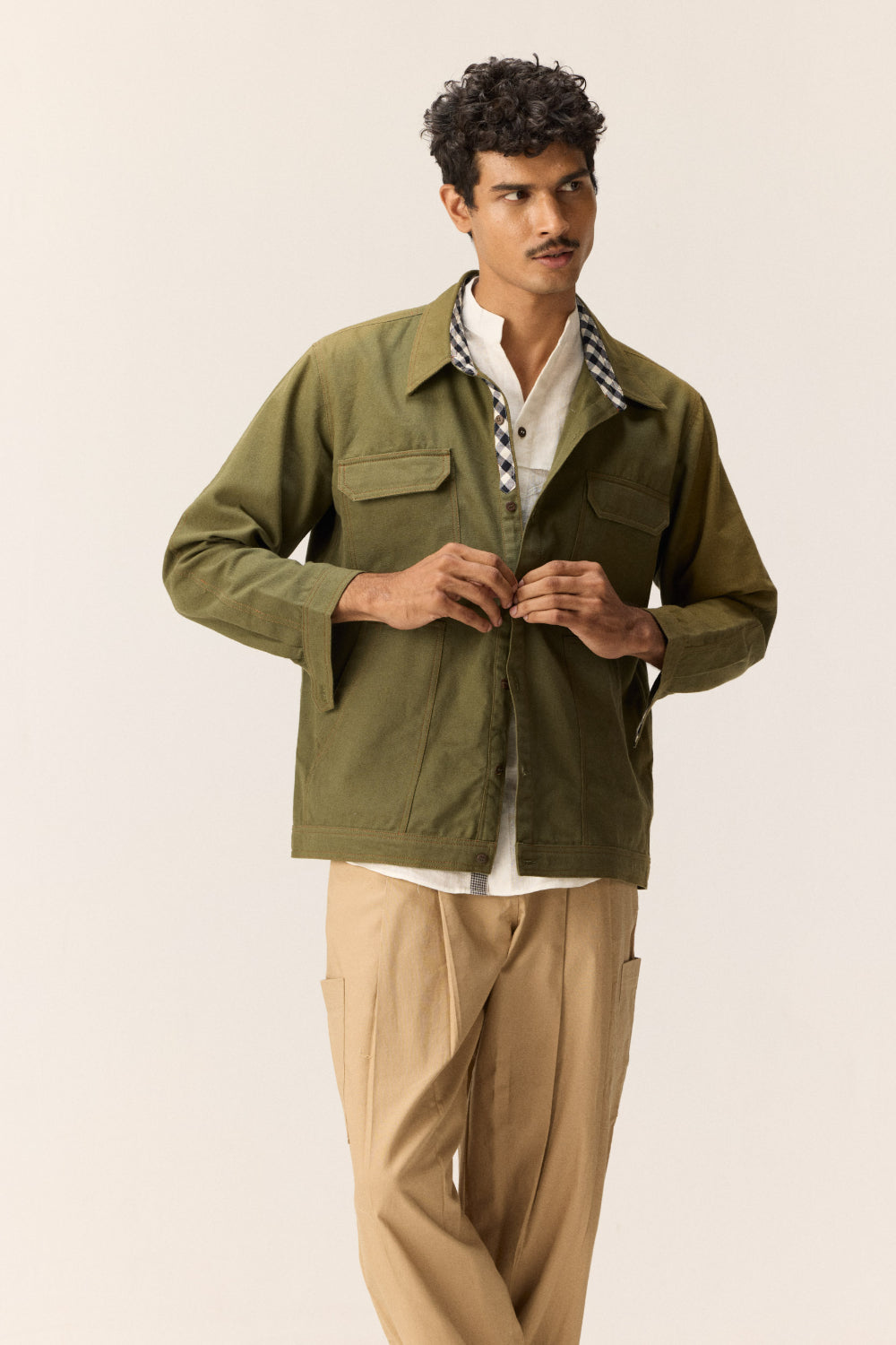 A functional olive green shacket crafted in oxford cotton, designed for versatile wear — whether layered or styled solo. It features a full front button opening, four patch pockets, and black-and-white checked detailing on the neck and collar for added contrast. Subtle thread accents add a refined finish.