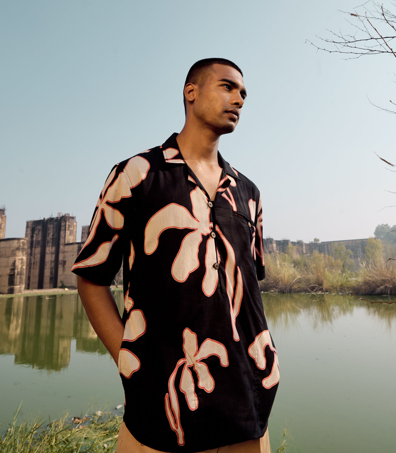 A black lino printed mul shirt with lapel collars and one welt pocket with button detailing.