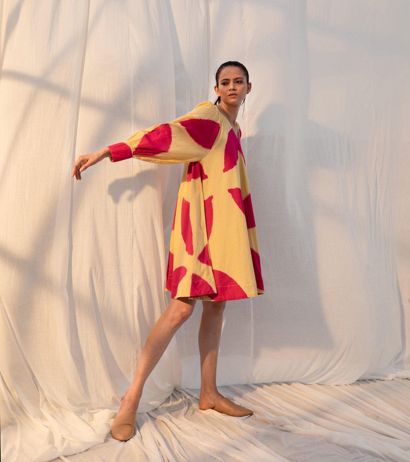 A wholesome Shibori-dyed tent dress made with Mulmul featuring semi-long, cuffed sleeves. Althea is a healer with rani pink and muted yellows coming together in symbiosis. Comes with an attached lining and a V-neckline. Hazy Ikat detailing on inside.