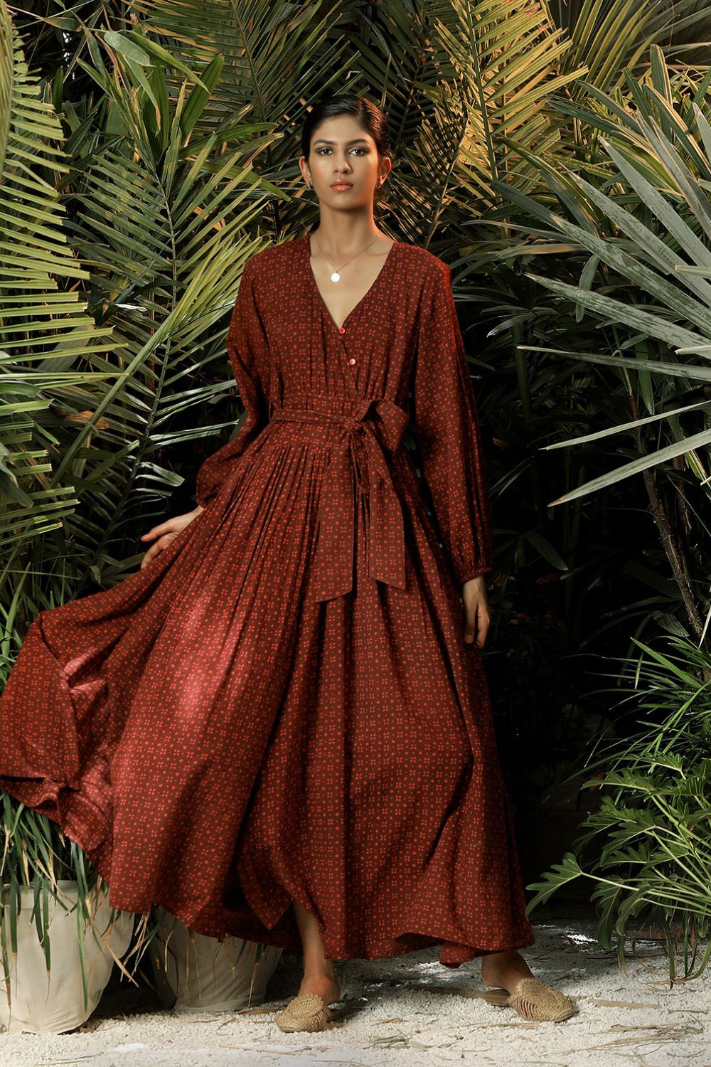 One time I looked into a flower and the scrutiny alone led me to her. A printed slit dress with an empire yoke, gather details, full sleeves with elasticated hem and a surplice neck. Comes with a button opening on front and fabric belt around the waist.