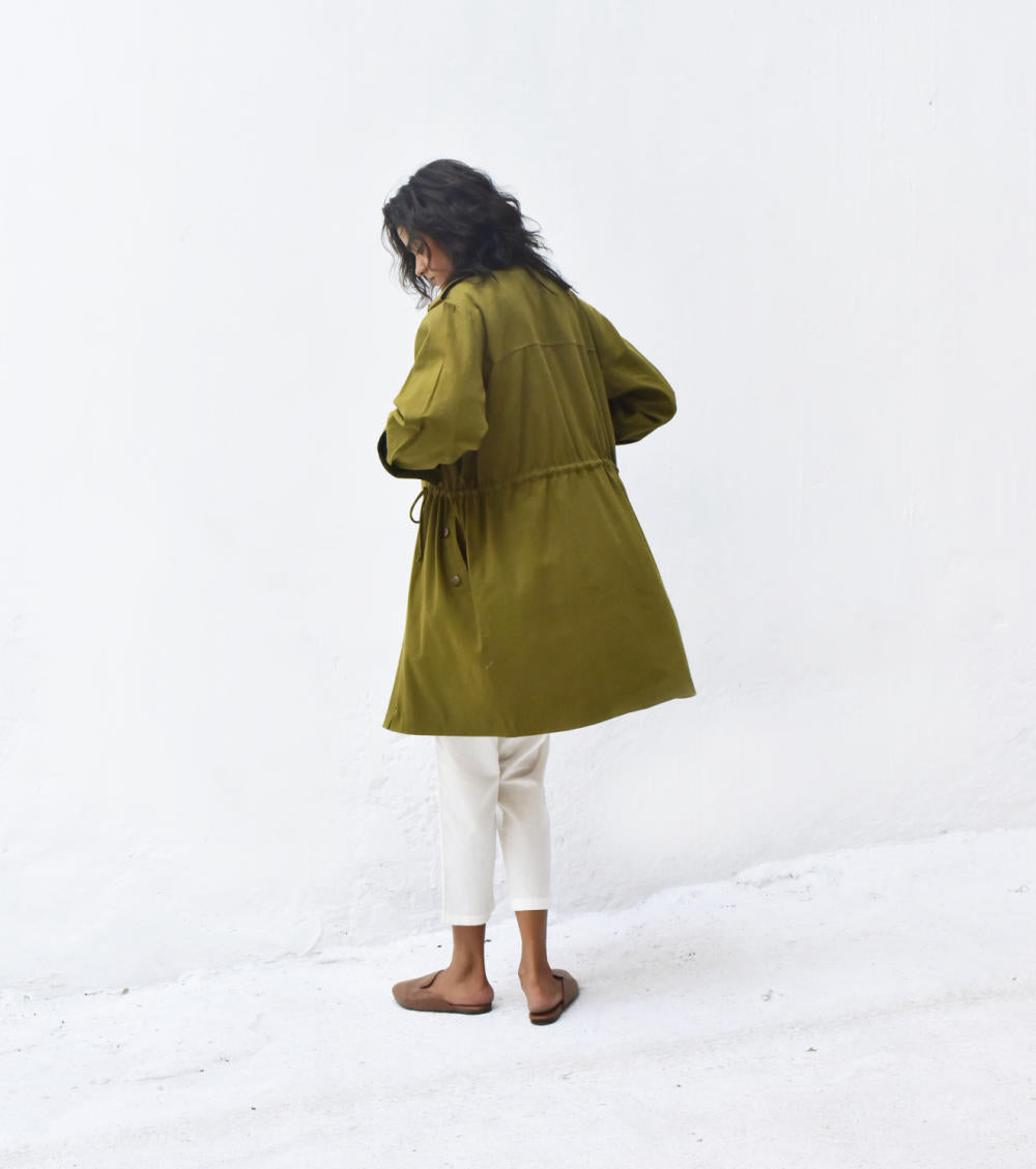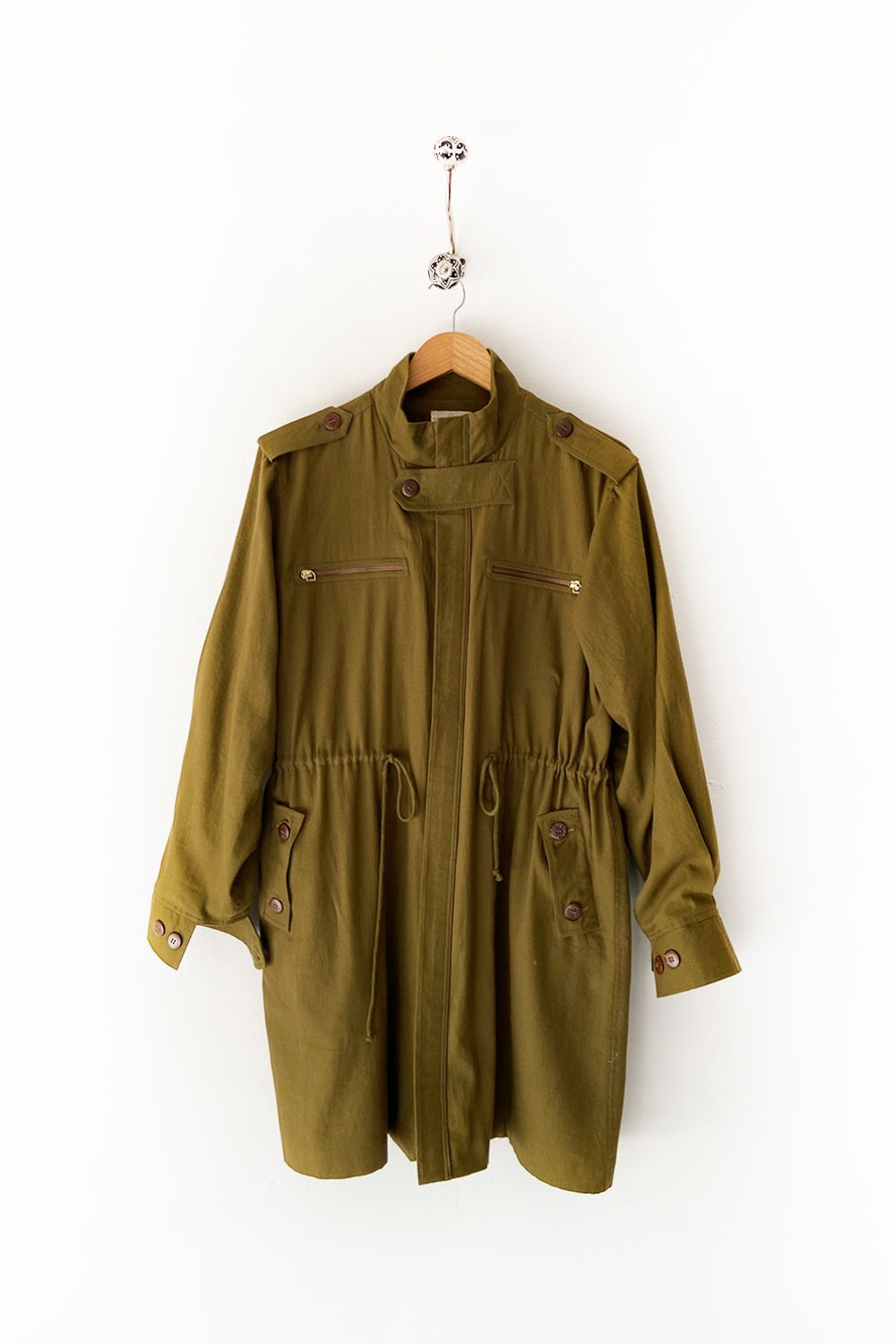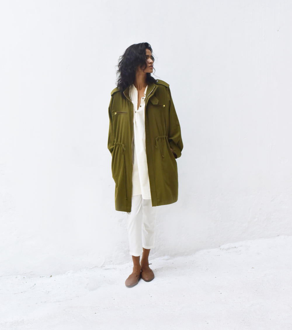 A parka jacket with drawstring at waist, slant flap buttoned pockets, cuffed buttons sleeve, front zip opening, buttoned epaulettes and two front zipper pockets. It comes with a red and white chequered cotton fabric detailing inside as the lining.