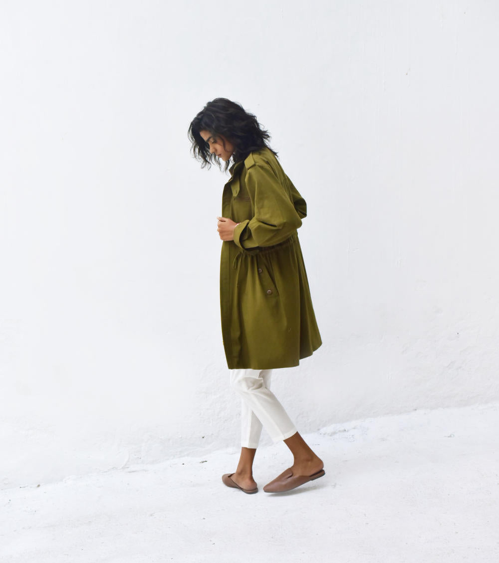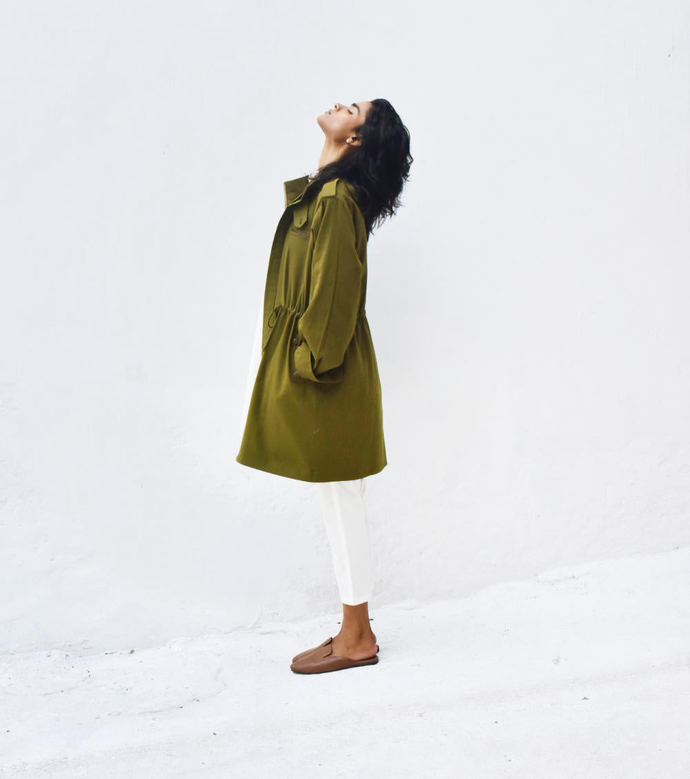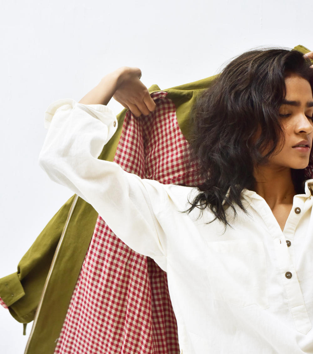 A parka jacket with drawstring at waist, slant flap buttoned pockets, cuffed buttons sleeve, front zip opening, buttoned epaulettes and two front zipper pockets. It comes with a red and white chequered cotton fabric detailing inside as the lining.