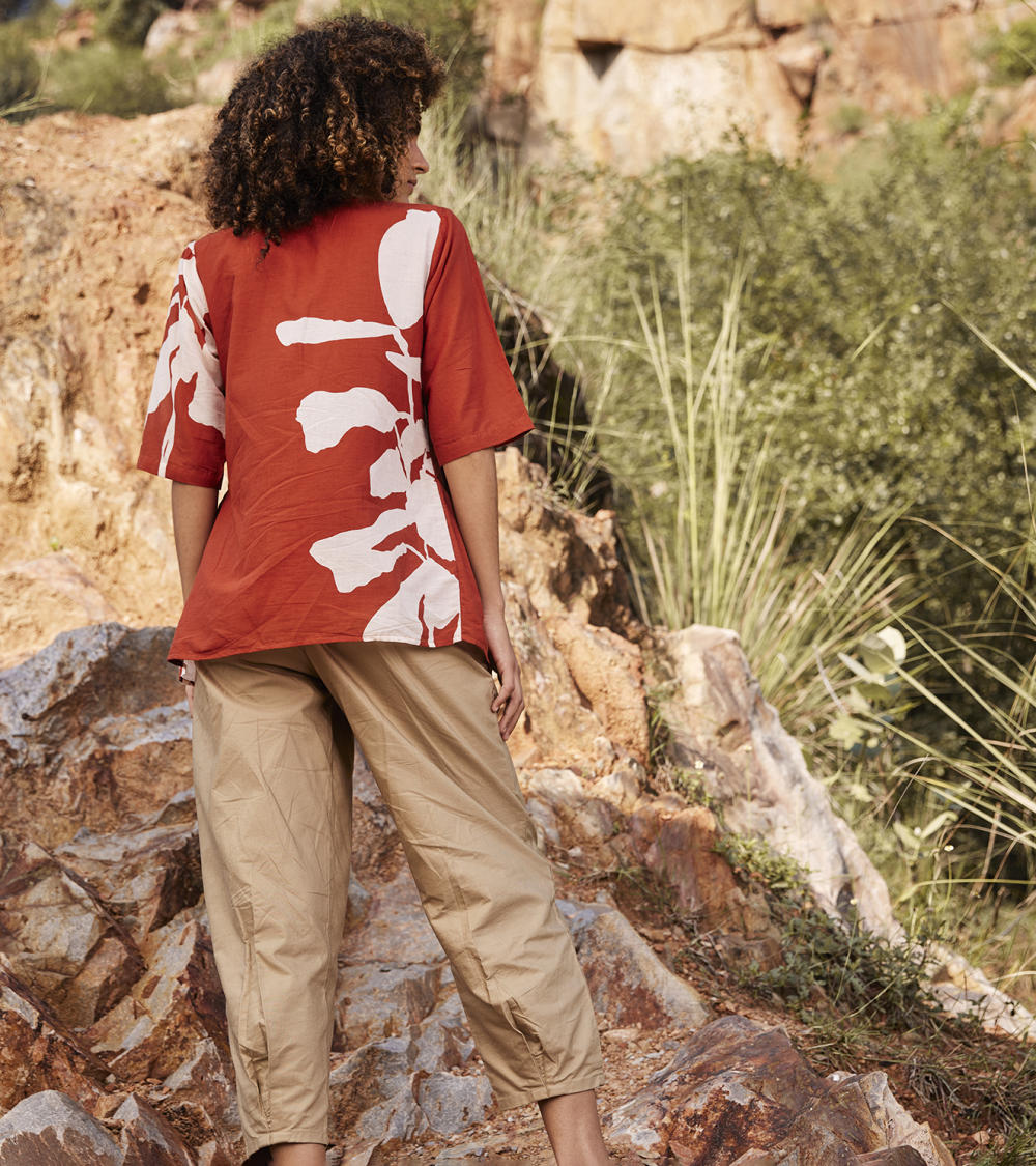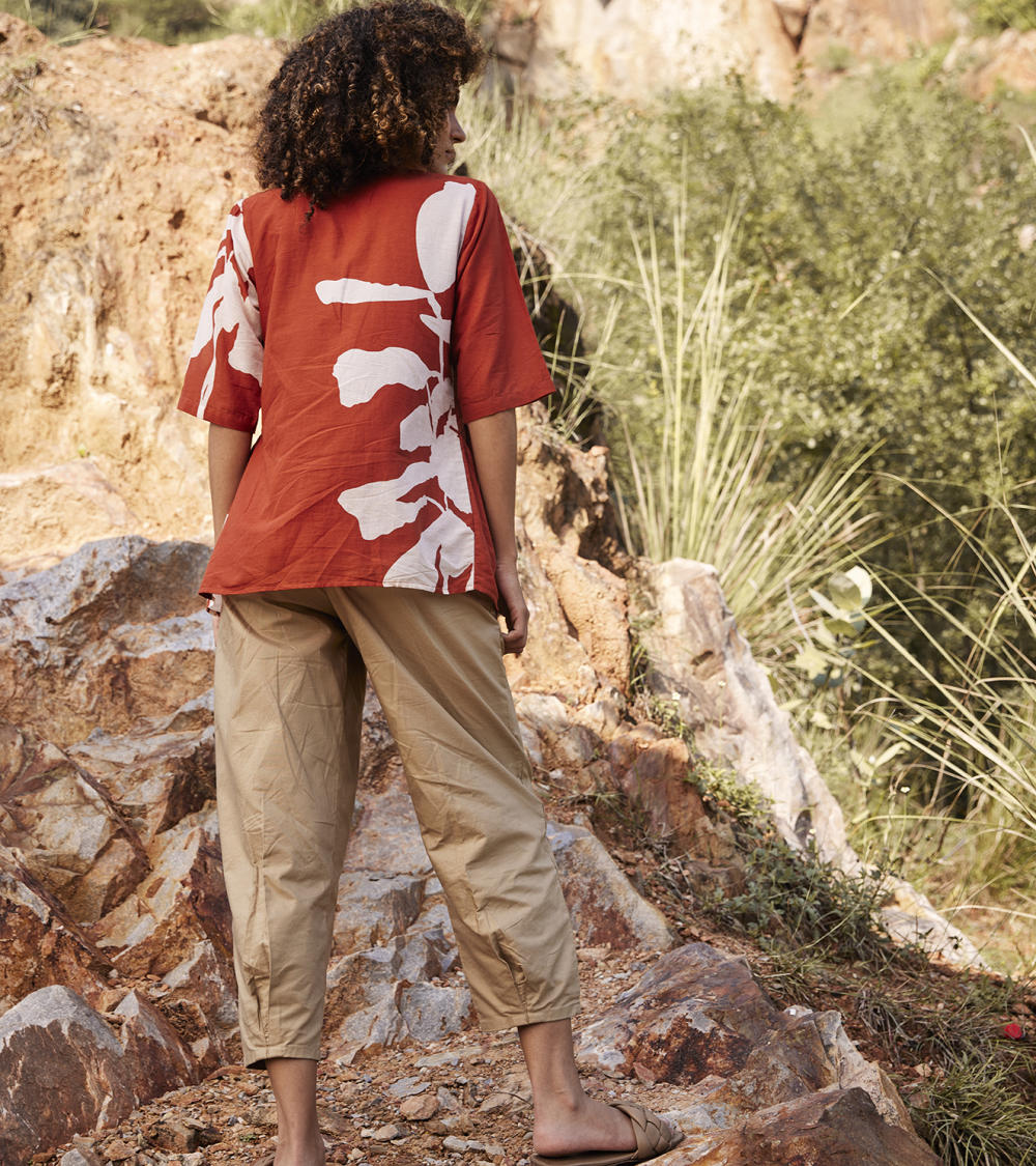 A brick red floral lino print top featuring an empire yoke and ruffle detailing. It comes with half sleeves in a relaxed fit and a V neckline. tton.