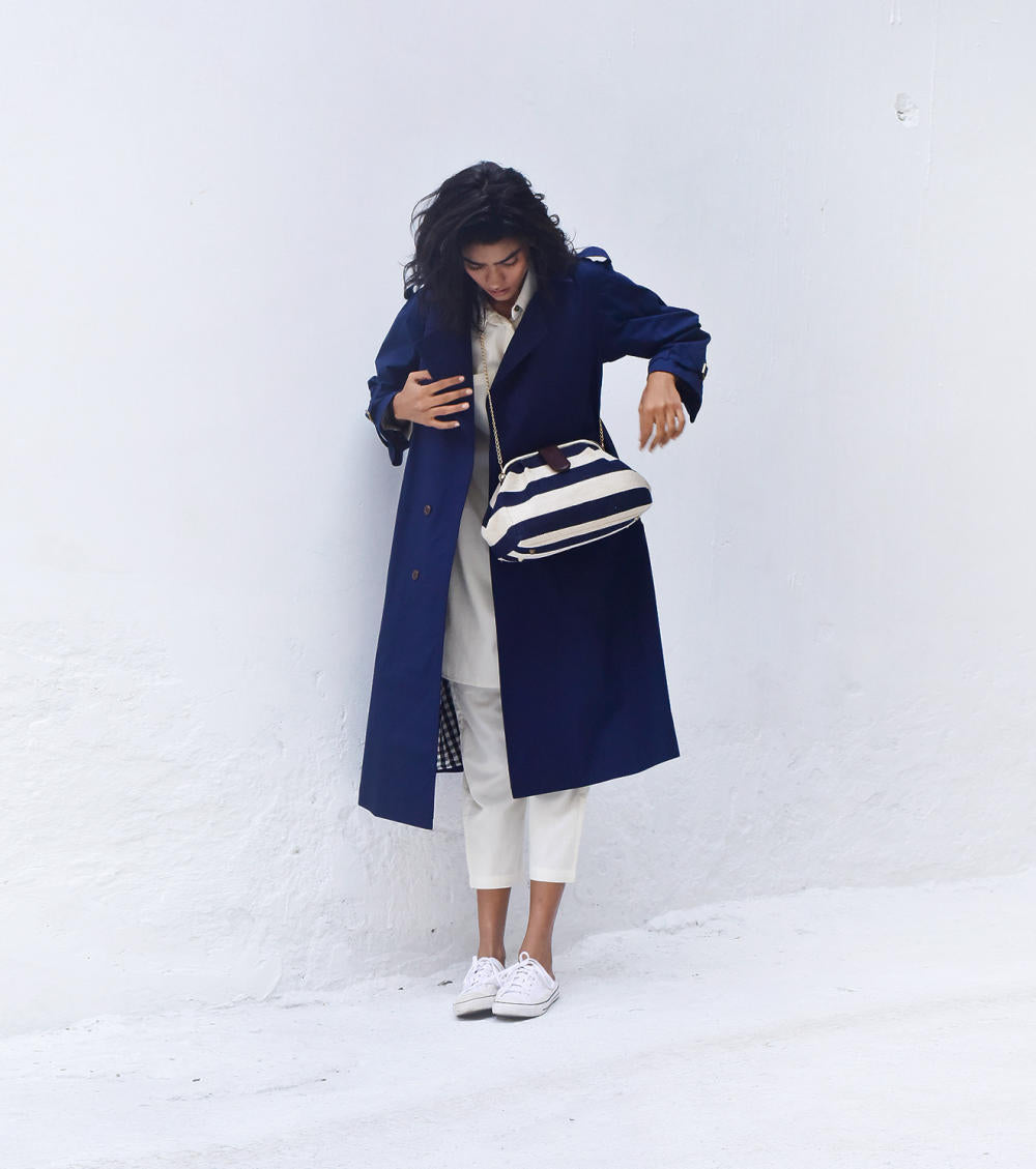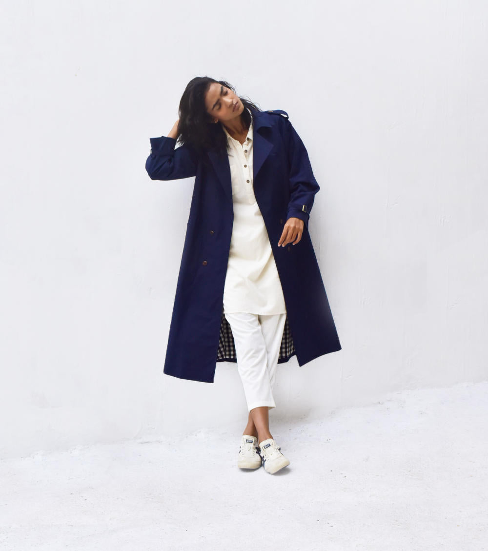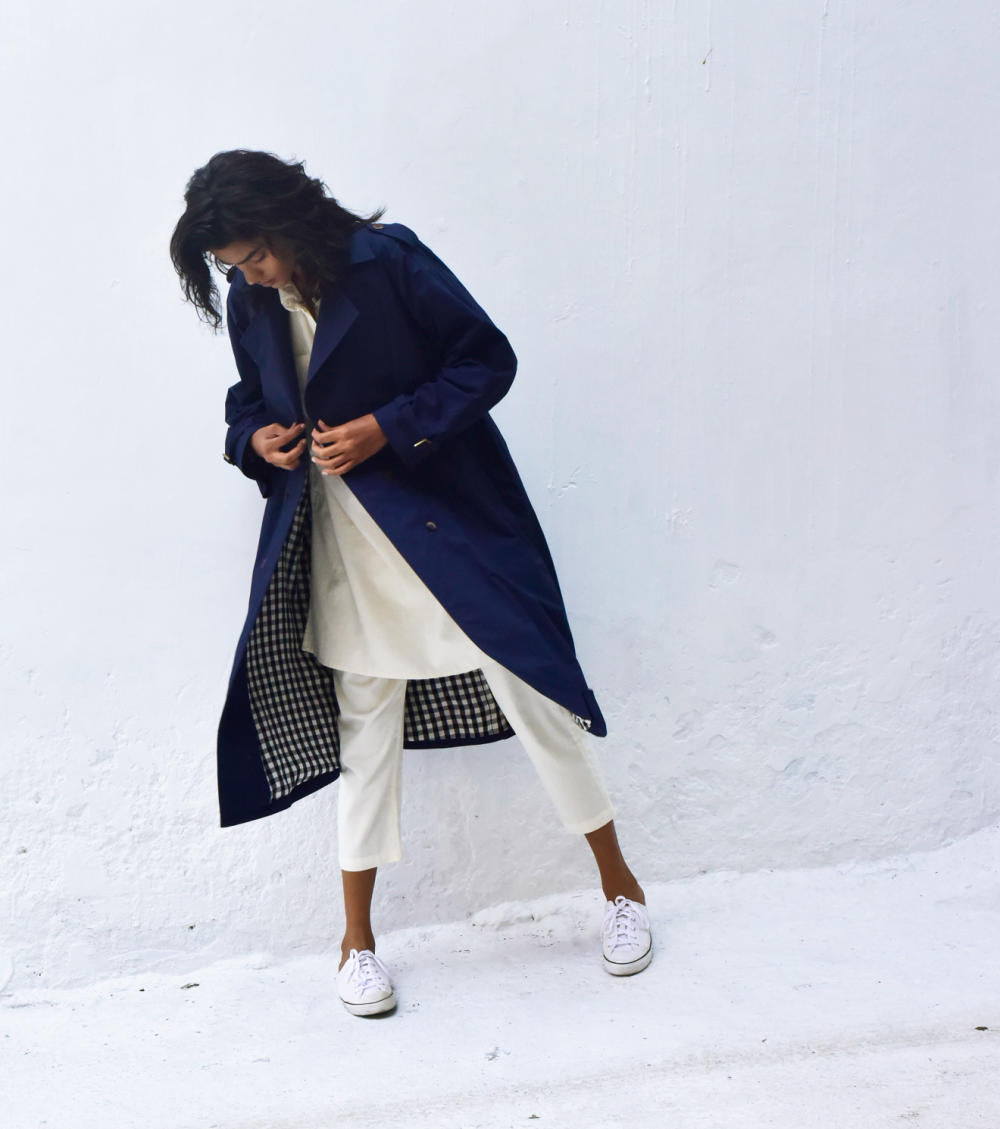 A double-breasted classic trench coat with buttoned epaulettes, bracelet cuffs, an adjustable belt and button pockets. It comes with a black and white chequered cotton fabric detailing inside as the lining.