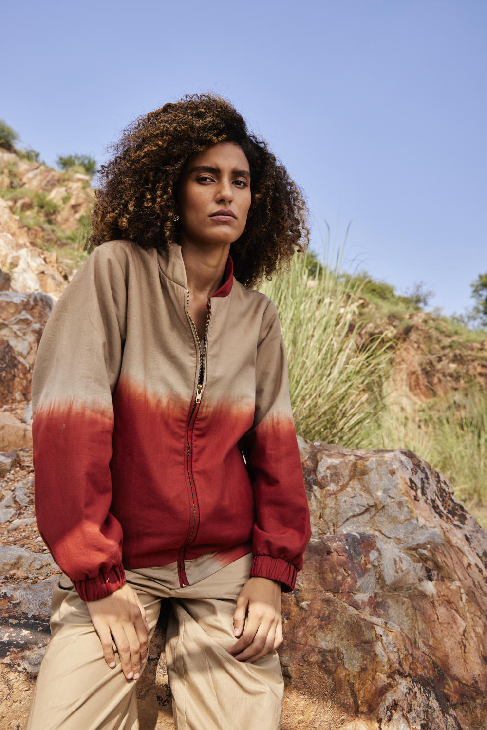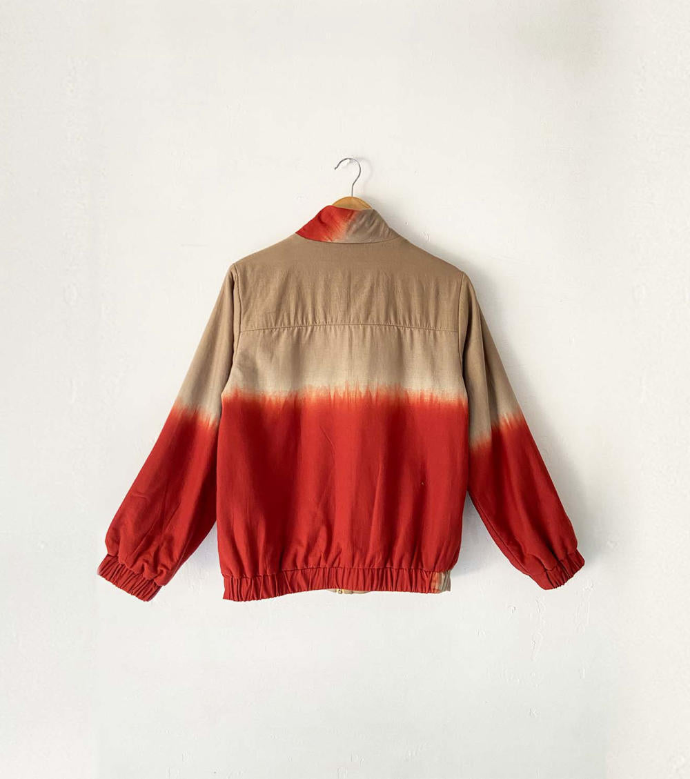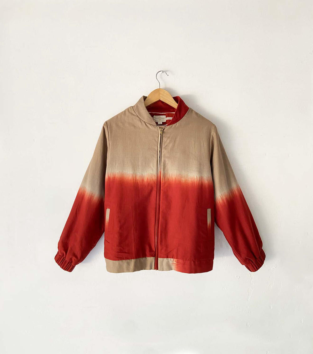 Two style one jacket, A hip length handcrafted jacket made in cotton with warm sandwich fabric. This dyed bomber is reversable with brick red and Beige shibori dye on one side and classic red white stripes on the other side. It has front zipper opening and two slash pockets. A perfect match for everyday comfort and style.