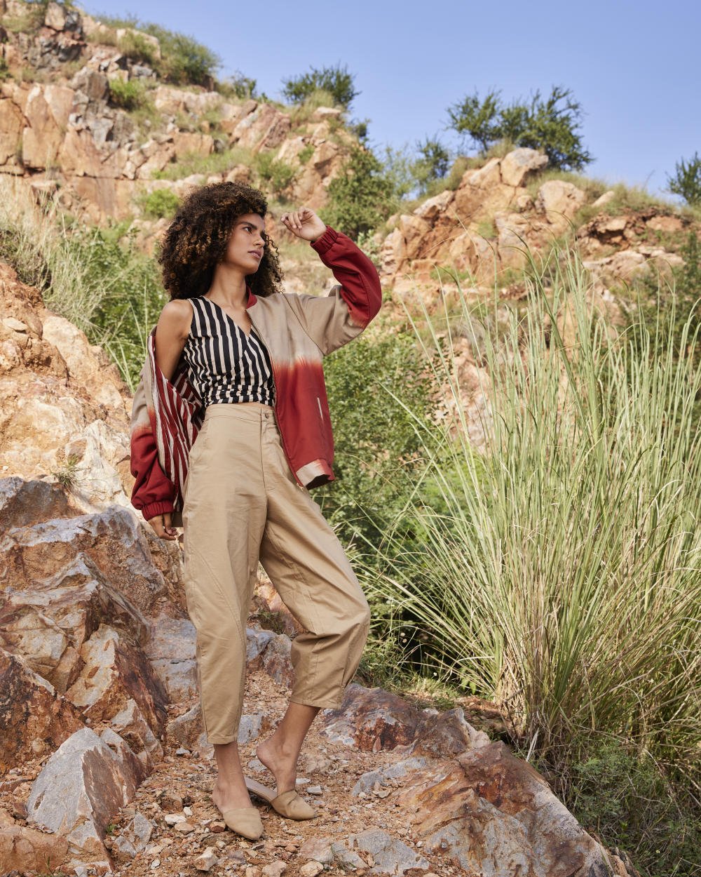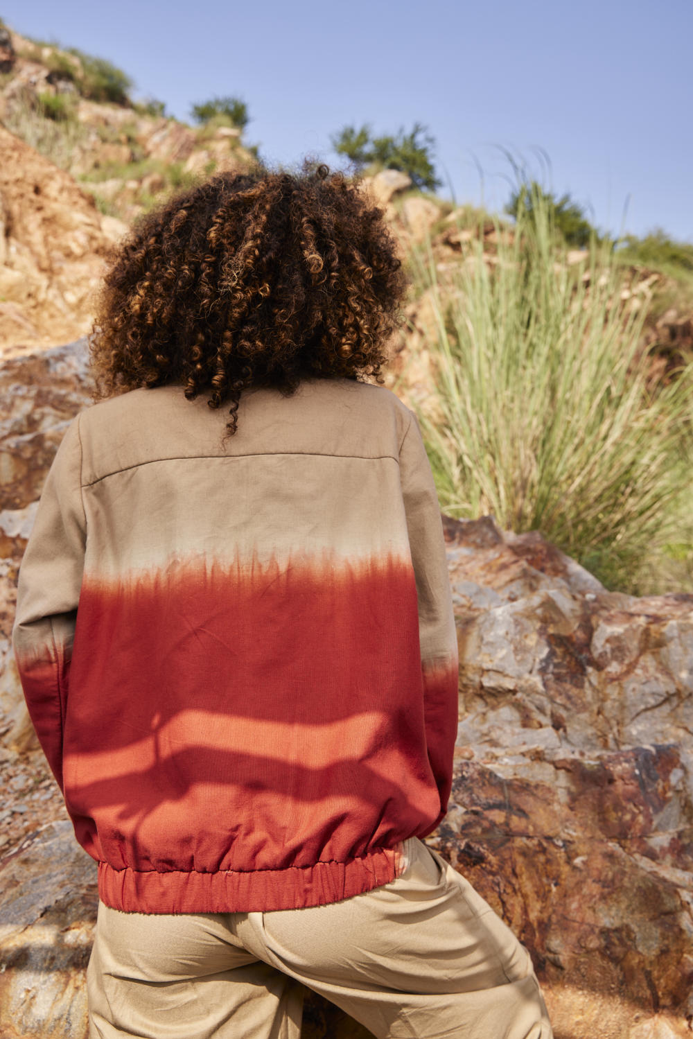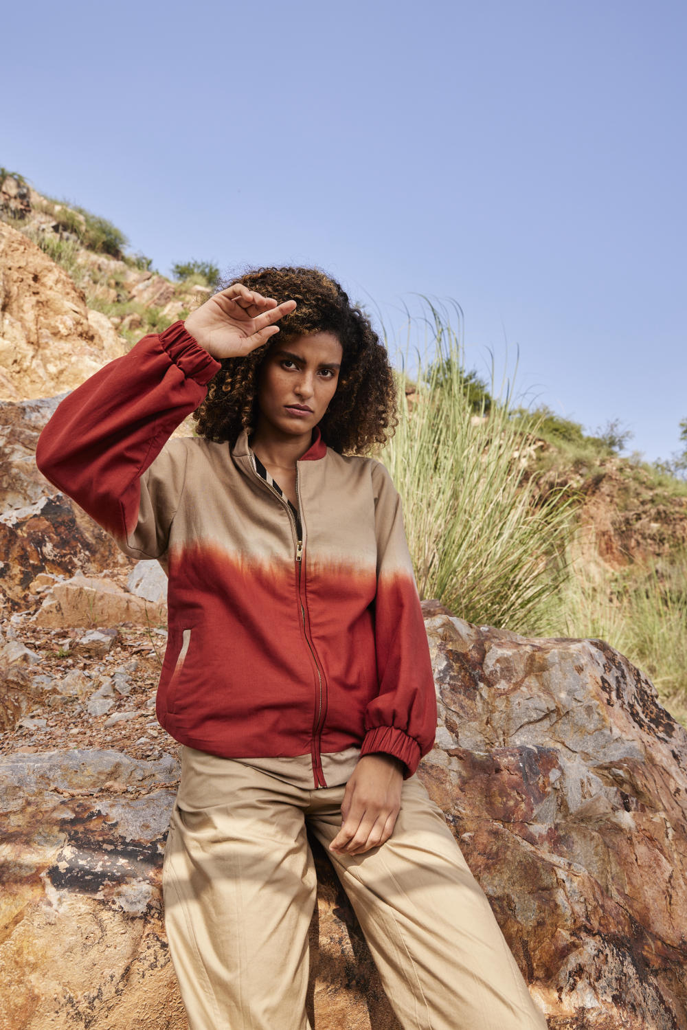 Two style one jacket, A hip length handcrafted jacket made in cotton with warm sandwich fabric. This dyed bomber is reversable with brick red and Beige shibori dye on one side and classic red white stripes on the other side. It has front zipper opening and two slash pockets. A perfect match for everyday comfort and style.