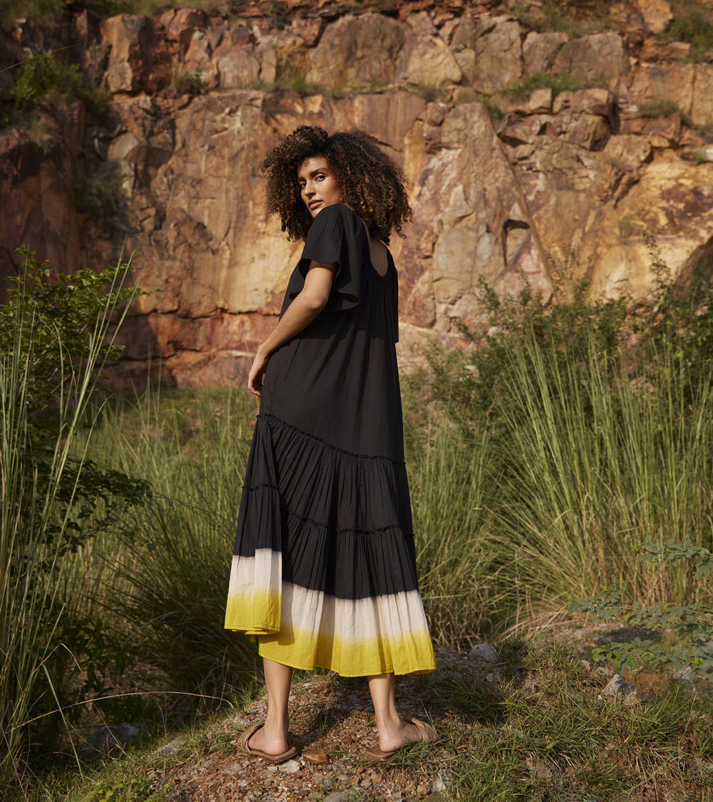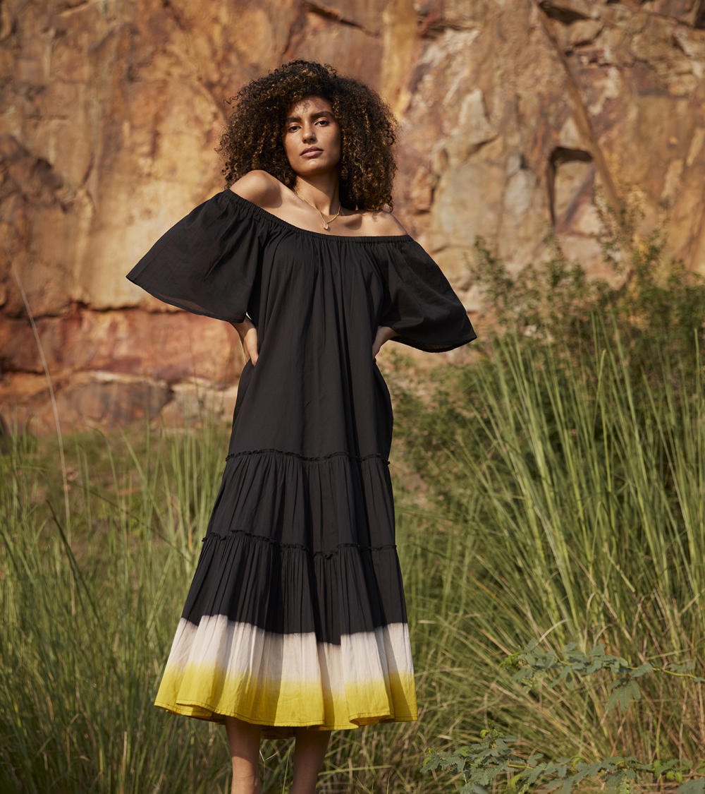 A midi tiered dress with an elasticated neckline that can also be worn as an off-shoulder dress and a hemline that is dip-dyed.
