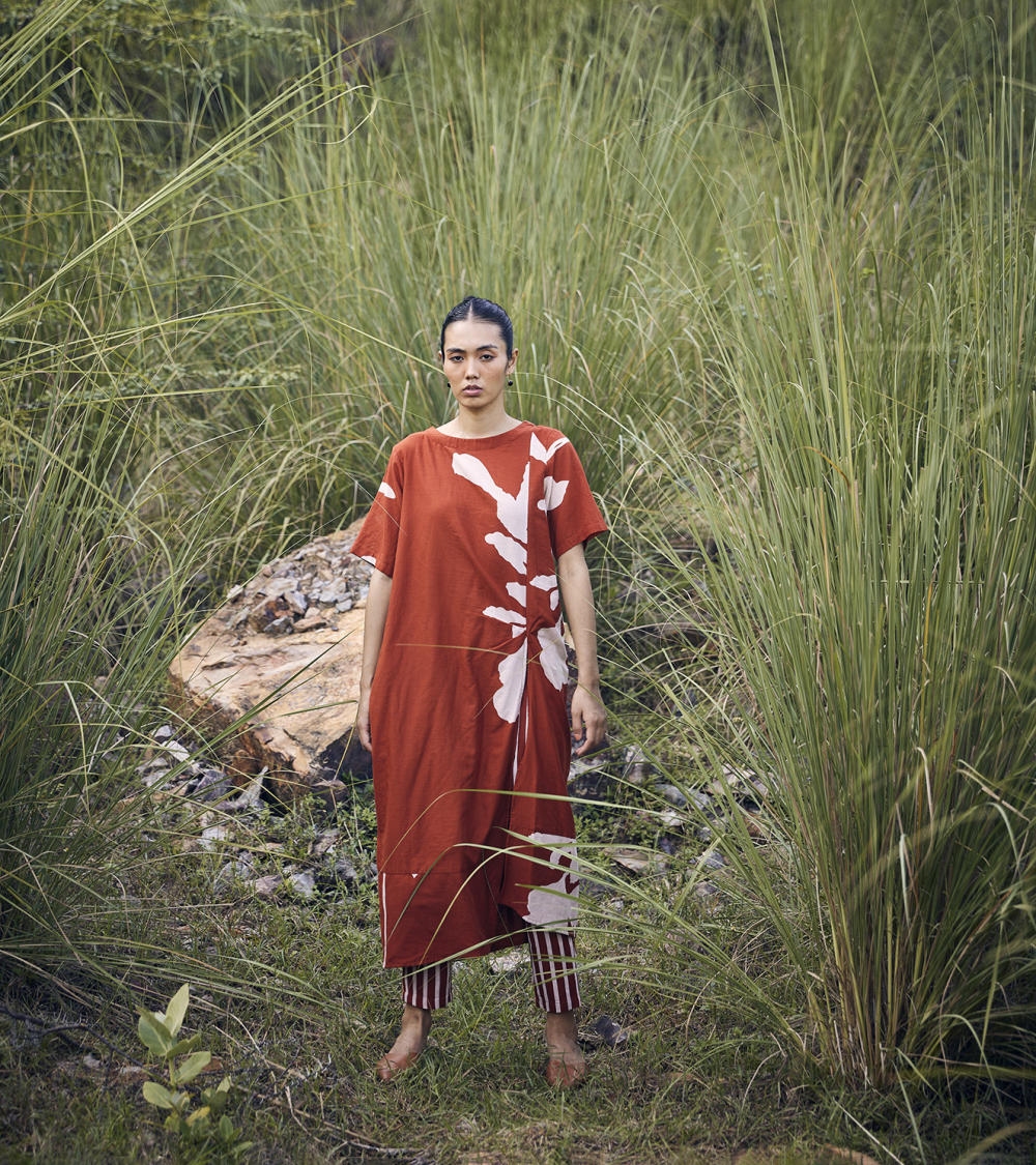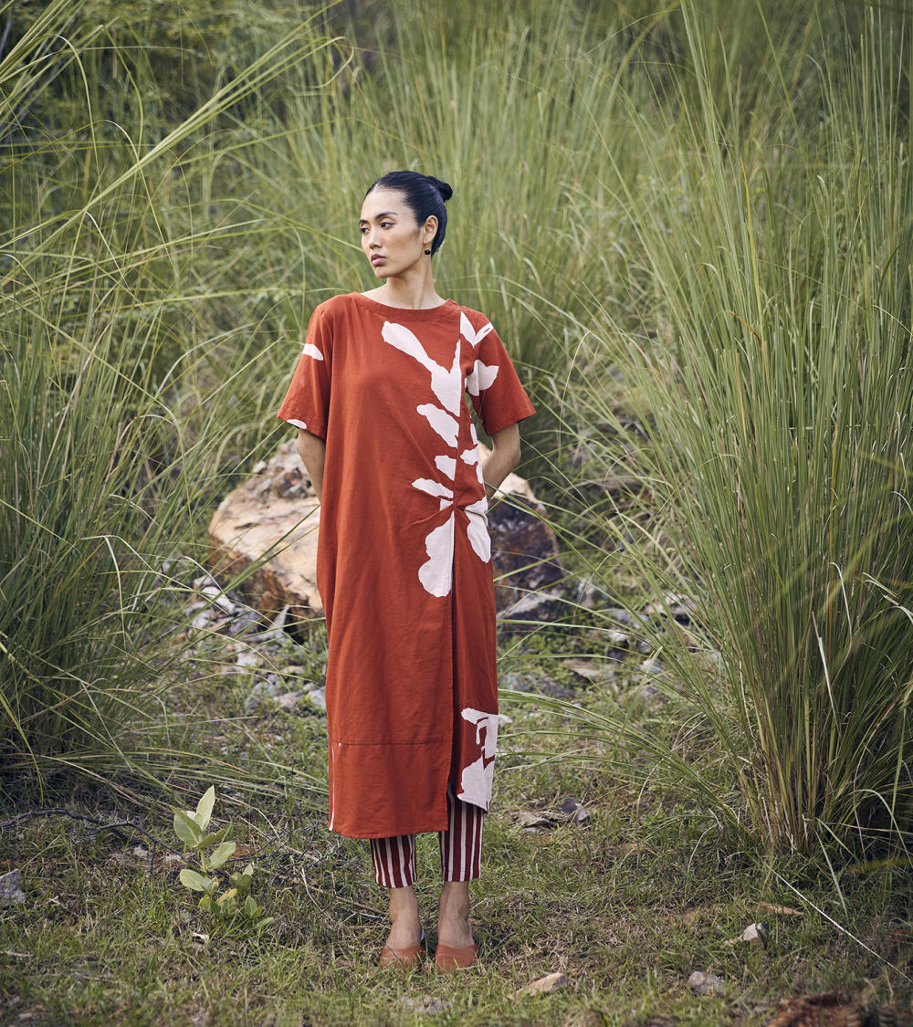 A brick red floral lino print, anti-fit tunic dress with a boat neck and side slit, comes with full lining.
