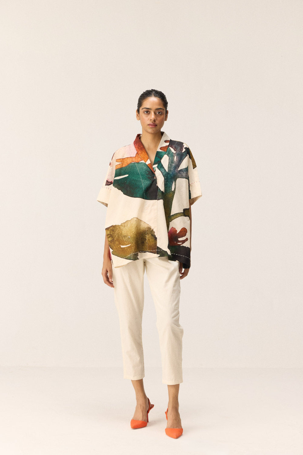 An off-white anti-fit floral print mul tunic comes with shawl collar, side slits and hand running stitches at the hemline of the tunic and the sleeves. One of a kind, this print is a part of water colour series in florals.