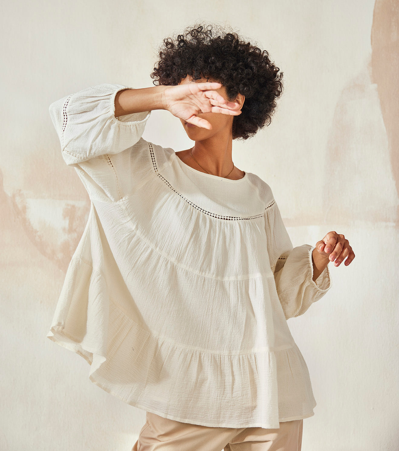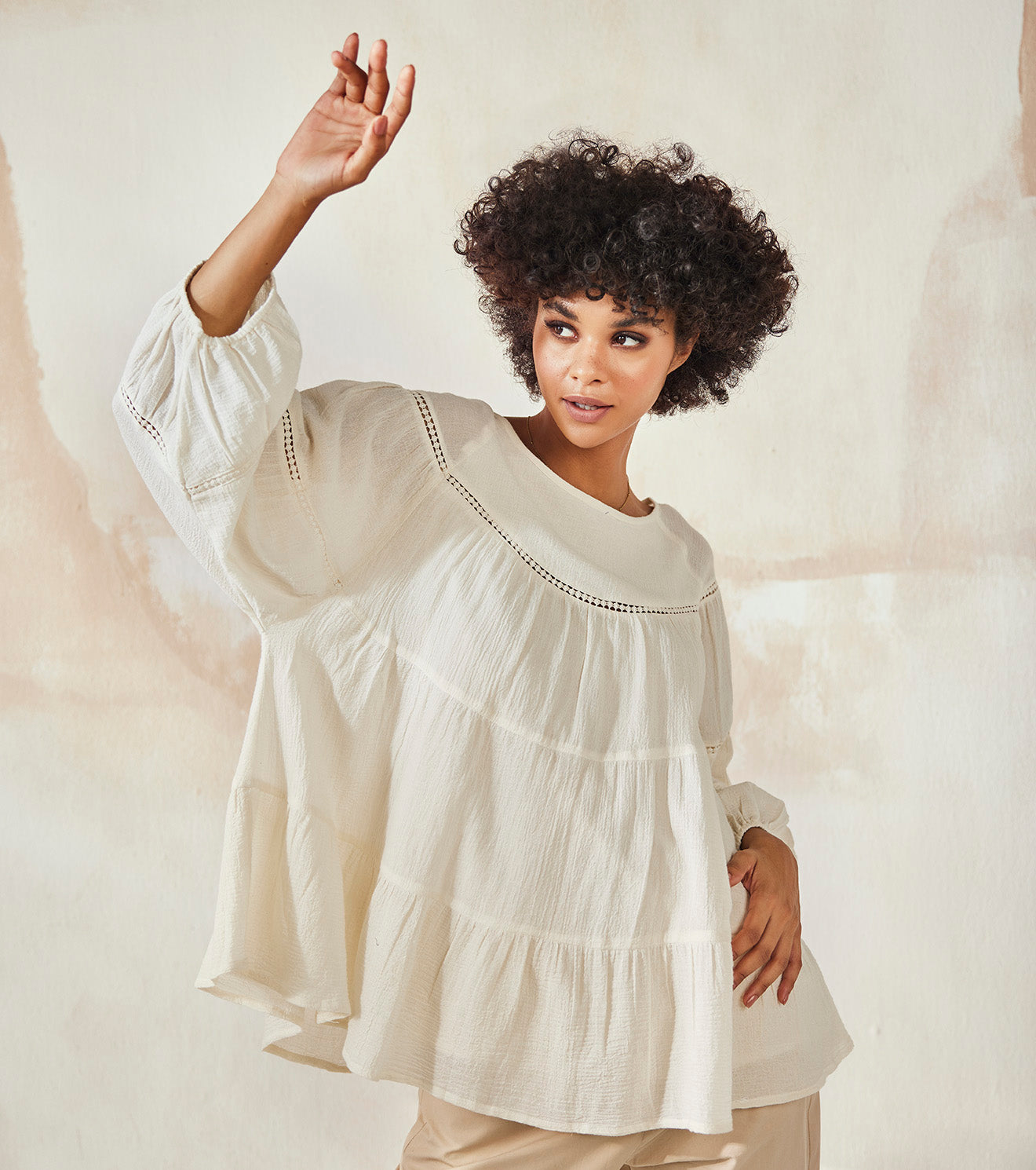 An off-white anti-fit relaxed top with flared hem, lace detailing and full sleeve with elasticated hem.