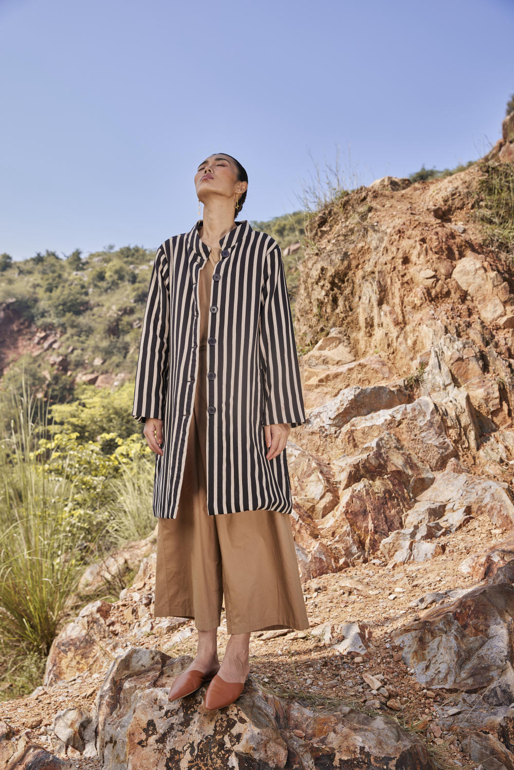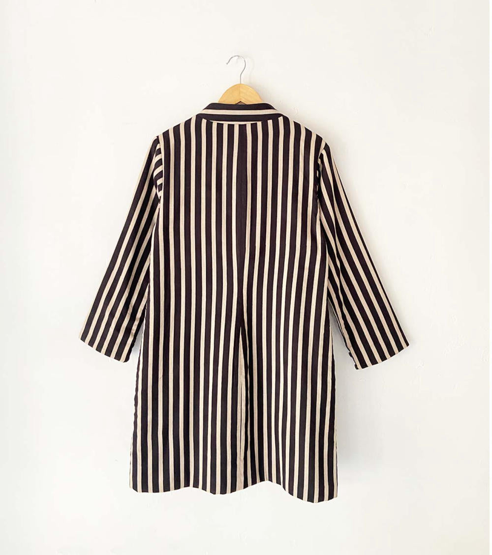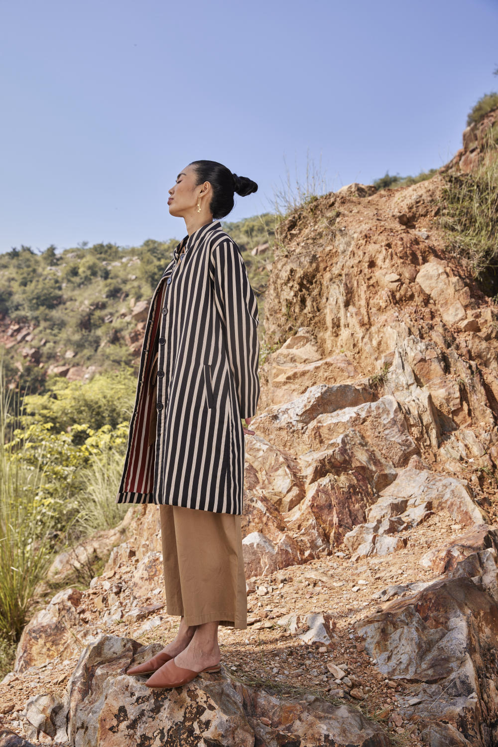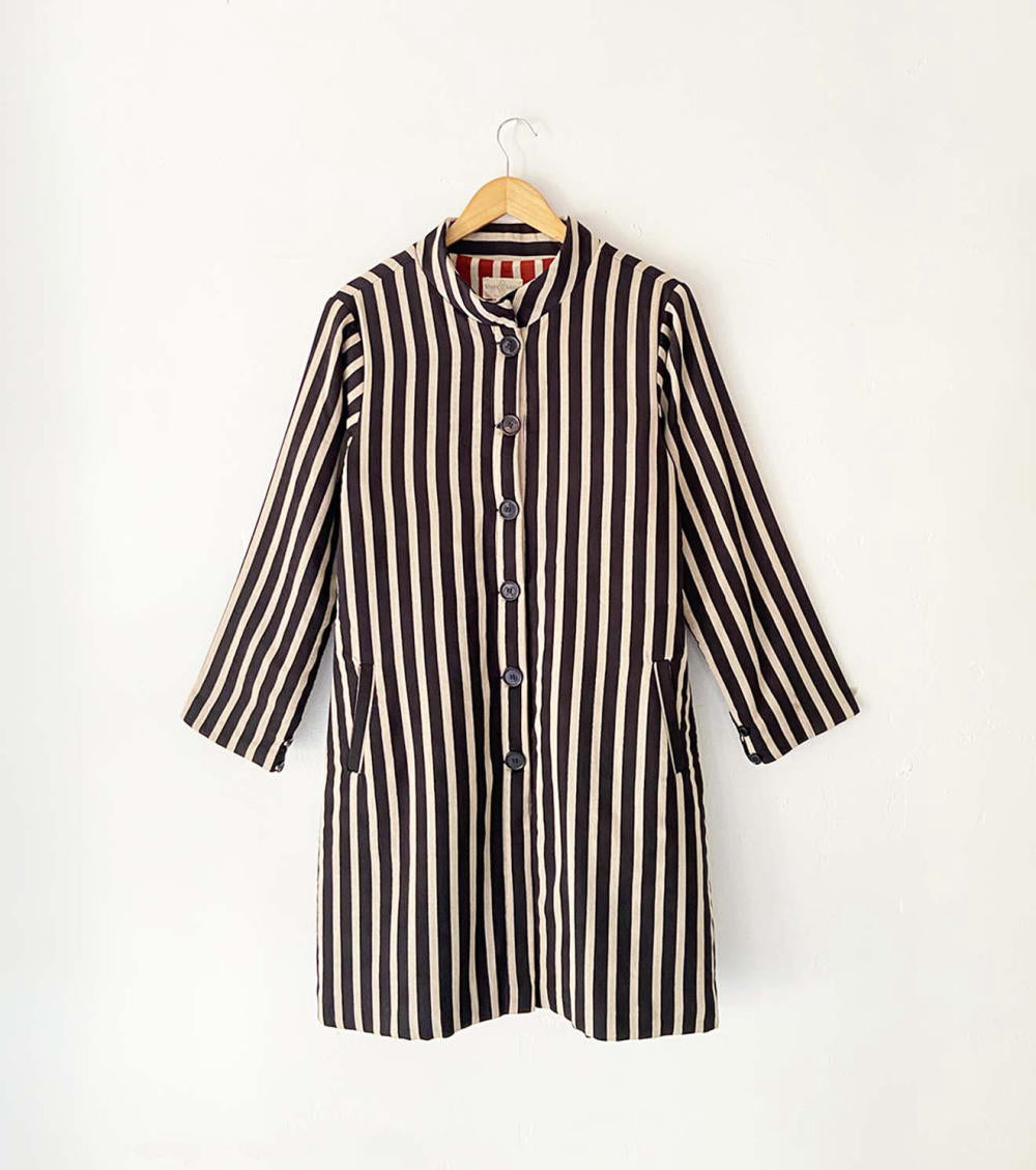 A knee length handcrafted black and white stripe jacket made in cotton with warm sandwich fabric. It has front opening and two slash pockets. This timeless and versatile outerwear comes with a red and white stripe contrast fabric which is perfect for the cozy days.
