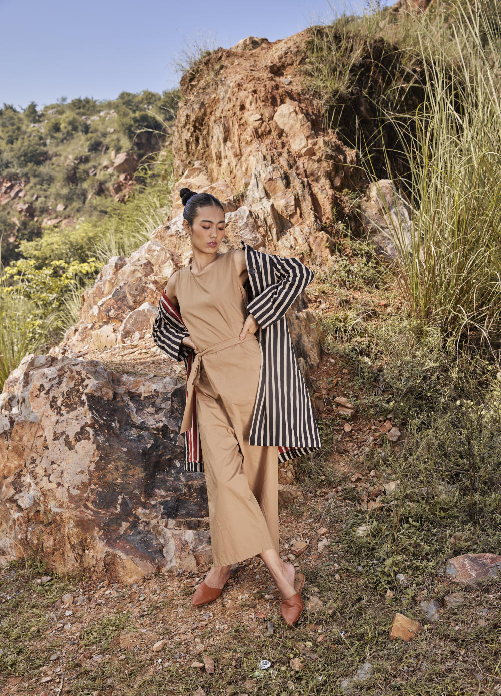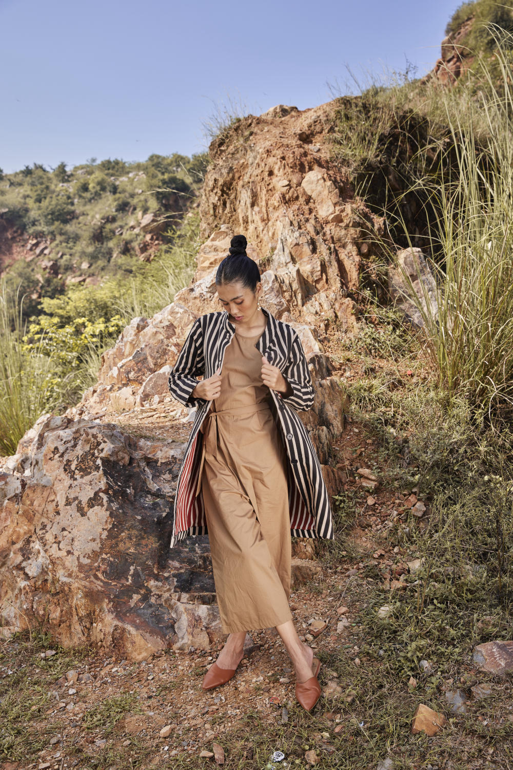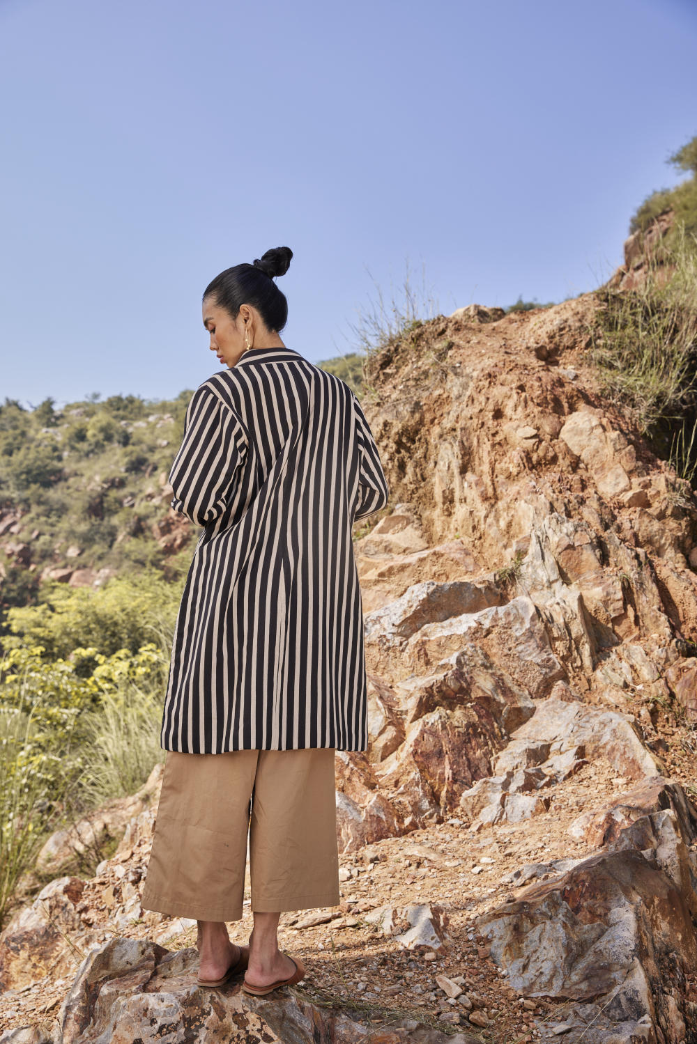A knee length handcrafted black and white stripe jacket made in cotton with warm sandwich fabric. It has front opening and two slash pockets. This timeless and versatile outerwear comes with a red and white stripe contrast fabric which is perfect for the cozy days.