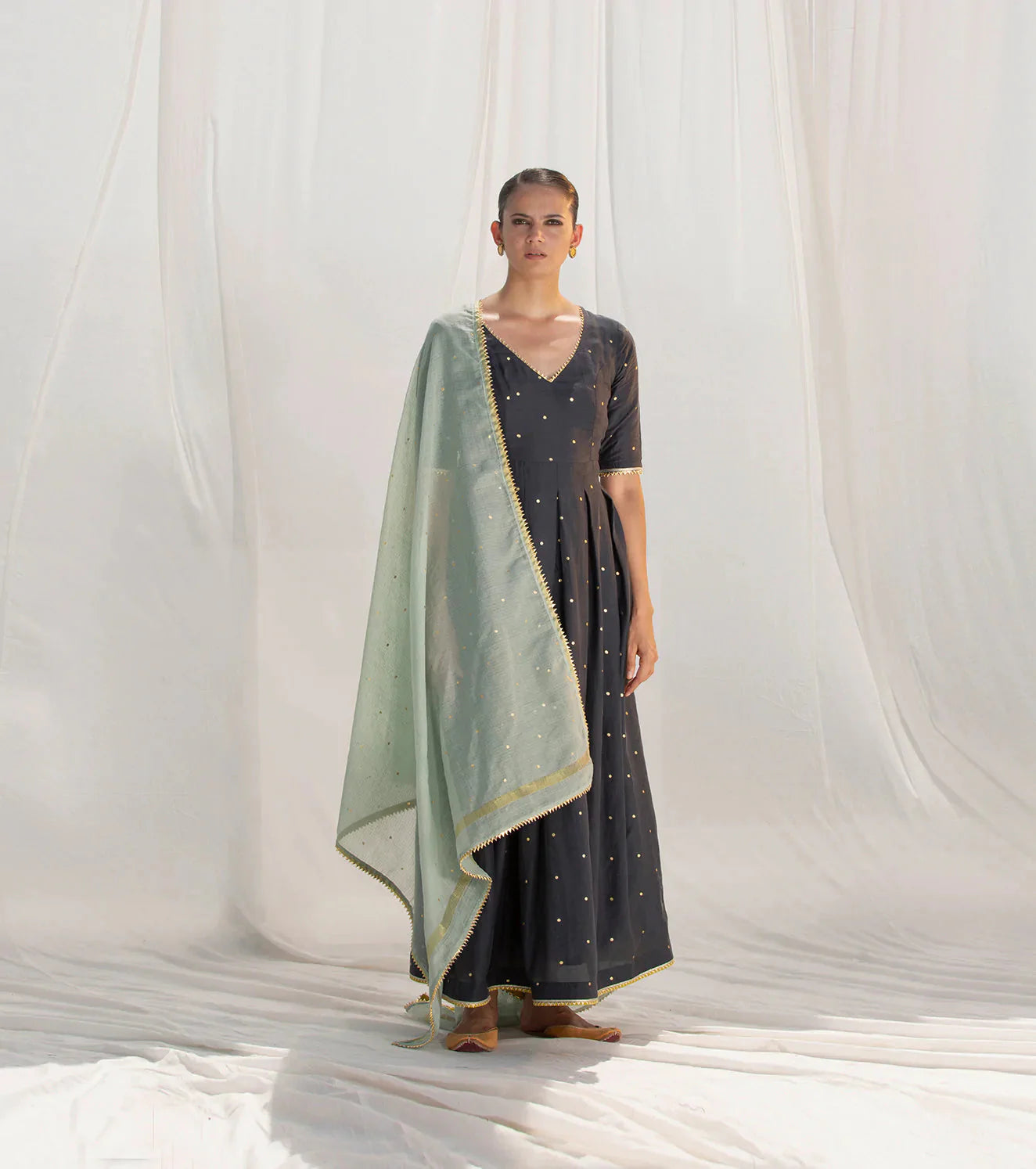Box-pleated evening gown, handcrafted in cotton silk and adorned with gold foil polkas and gota. Cut in a fit and flare silhouette with a V-neckline and short sleeves.