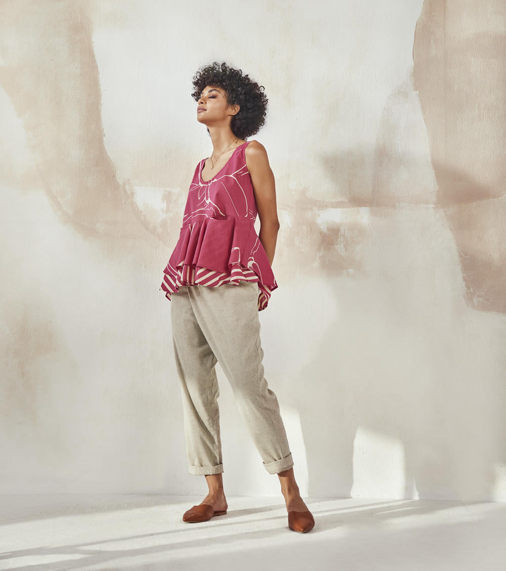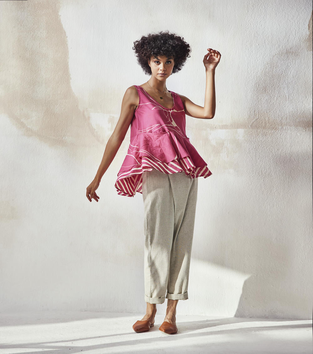 Hot pink flounce top with flared bottom half and front pocket. It comes with detailing of stripe and the hem.