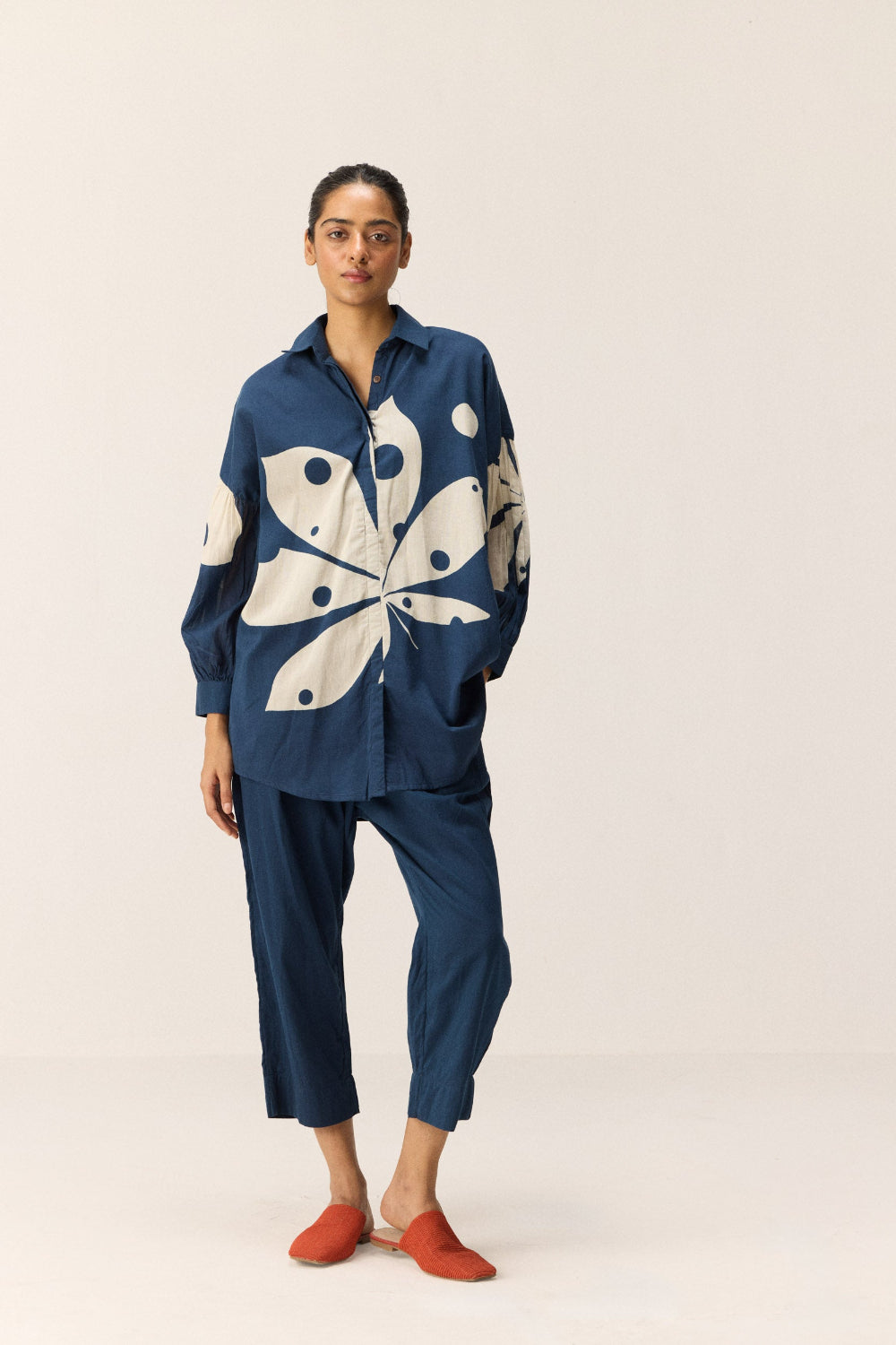 A navy blue co-ord set featuring an off-white abstract leaf print on the front and sleeves of the top. Designed with lapel collars and two front buttons, it pairs with solid navy pants that include a front button opening, an elasticated back, and practical side pockets.