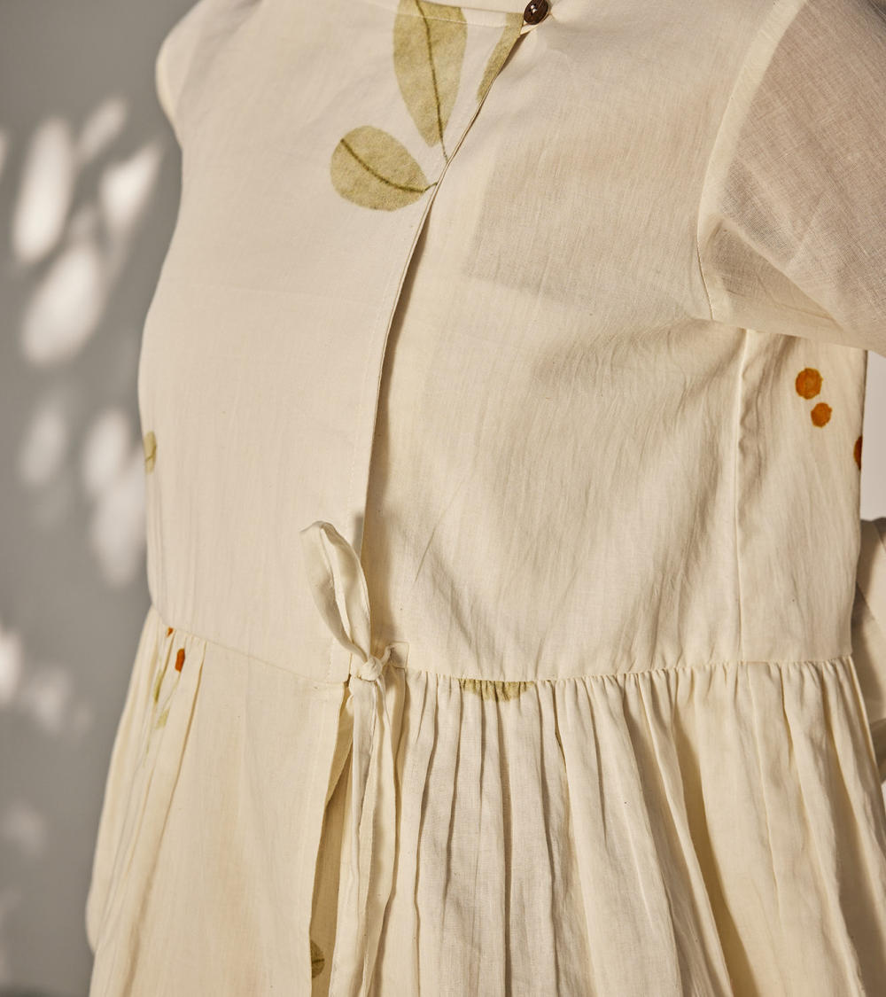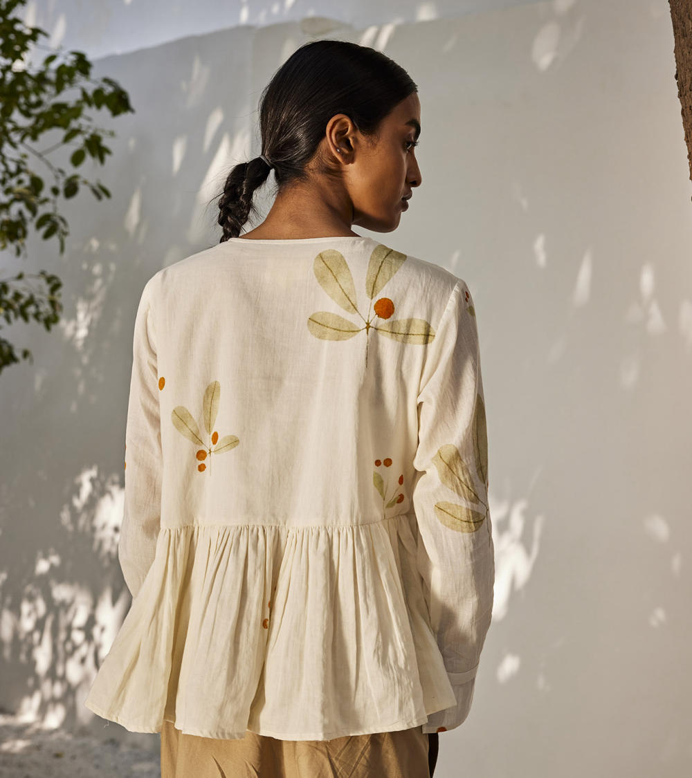 An ecru mulmul cotton top with an overlap front knot, gather detailing and full sleeves with buttoned cuff.