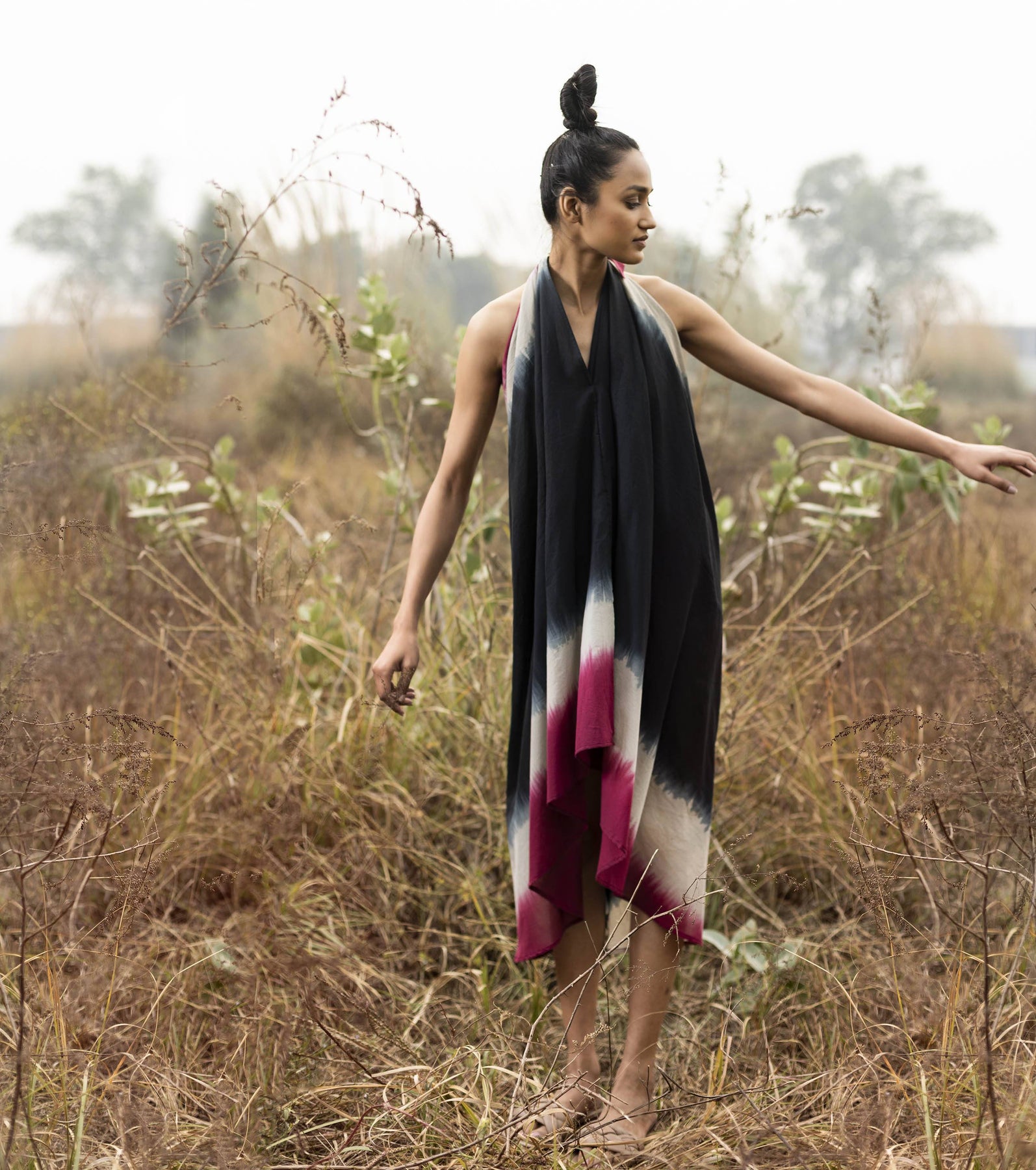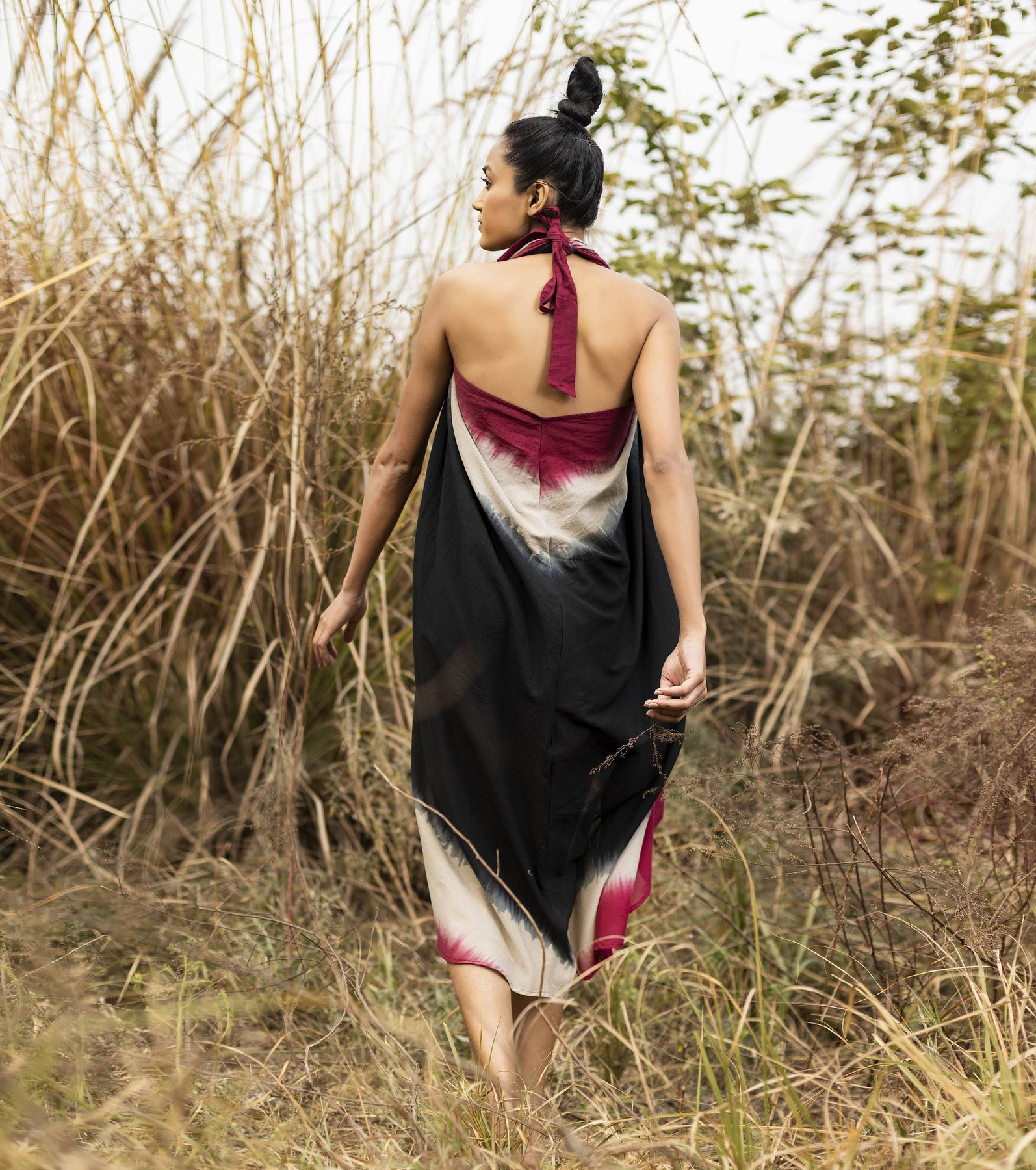 Unusual, yet alluring in its unconventional silhouette, trace the patterns of wayward shadows amidst patches of light that filters through the woods. Halter neck mulmul dyed with shibori, this dress comes with an attached lining and self tie back.
