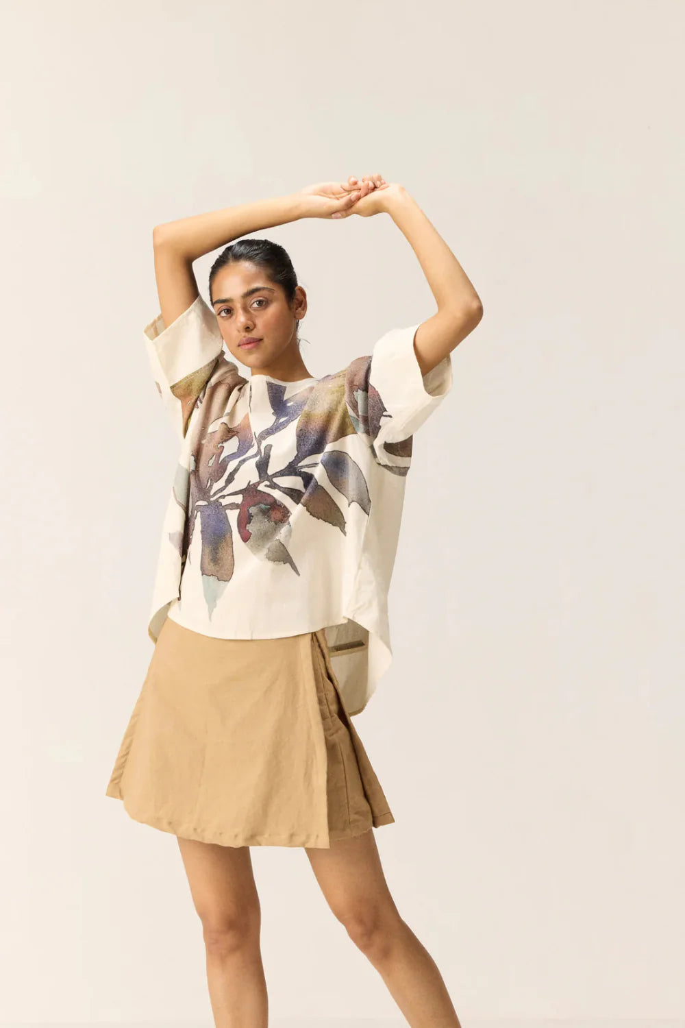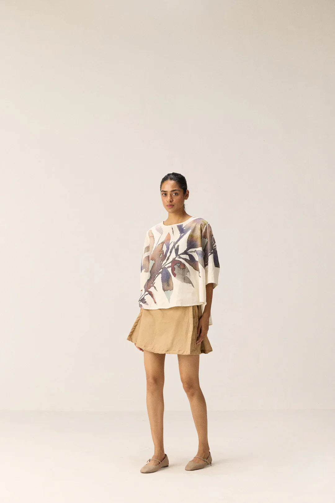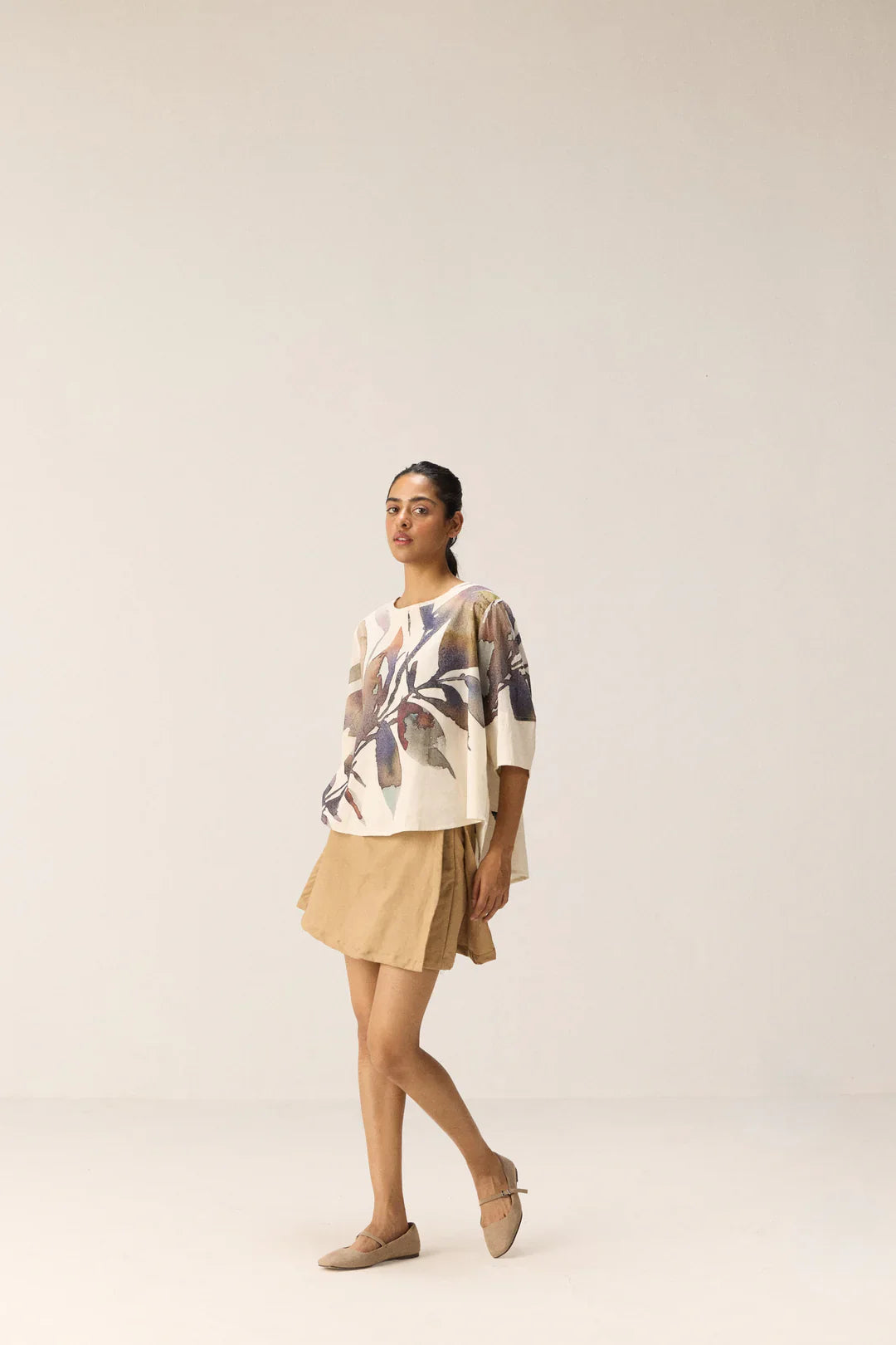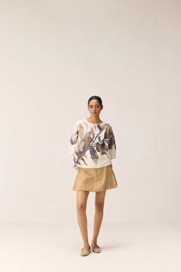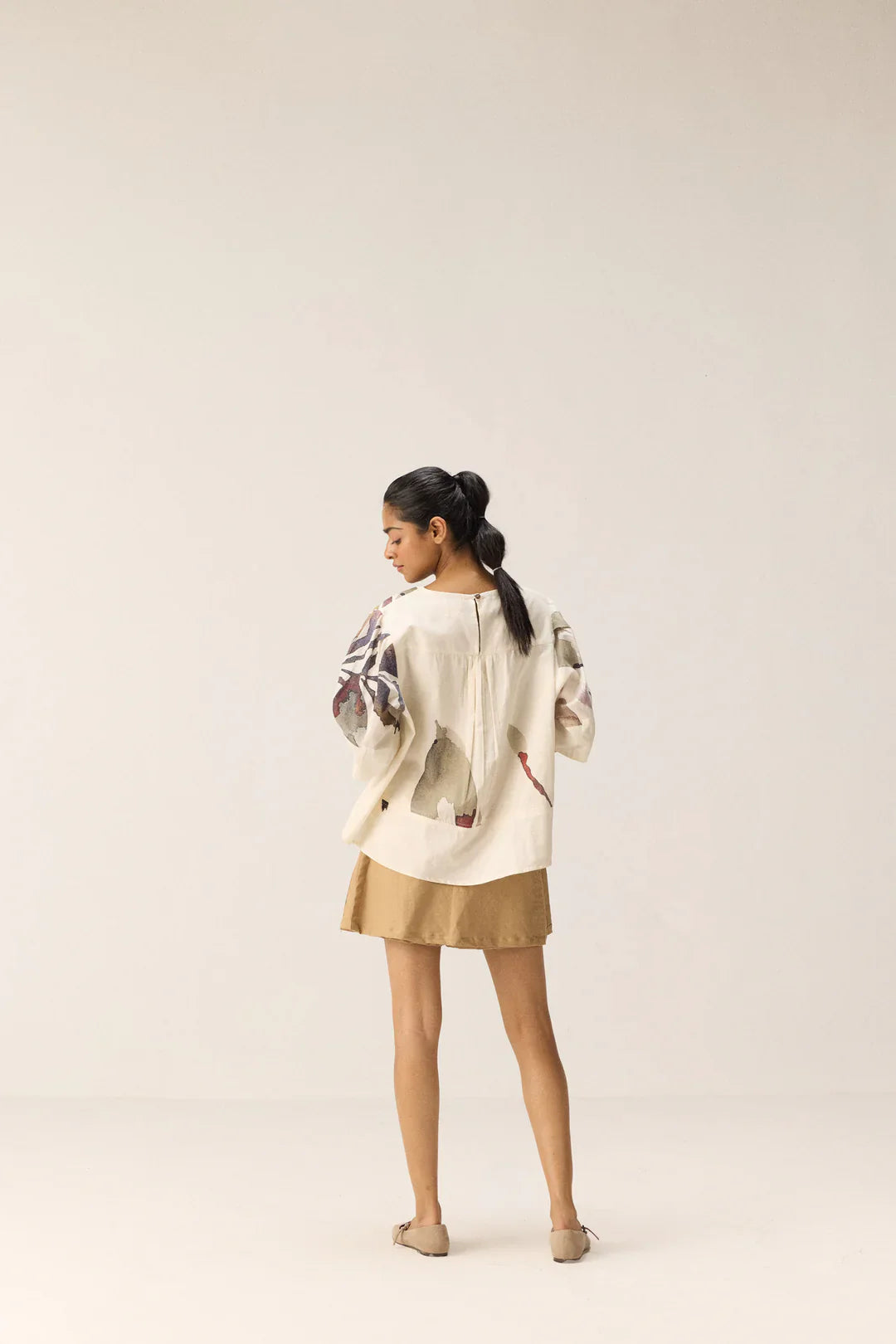 An off-white floral printed mul top in earthen tones with back button opening and gathers at the back.