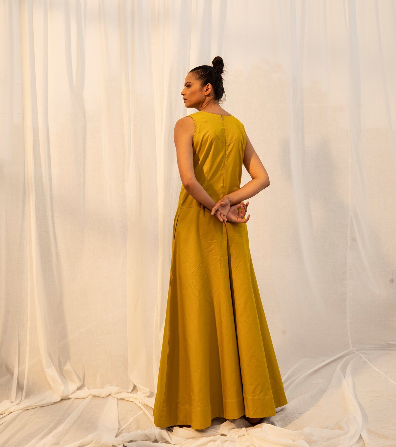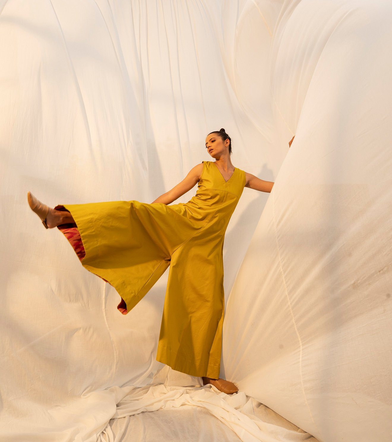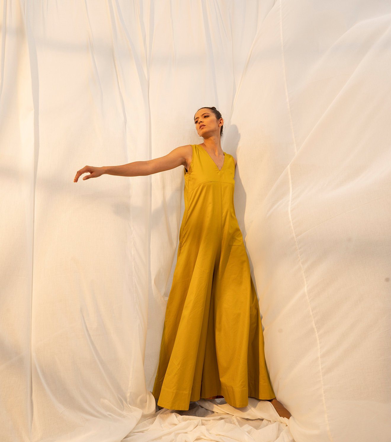 The golden princess has arrived to reflect on the time gone by, and the time to come, but most importantly the time that's golden, seeking nowness in everything. A lime yellow coloured sleeveless jumpsuit for all your momentary pleasures. Comes with a V neckline, empire yoke, flared bottoms, and ikat detailing on the inside. No lining.