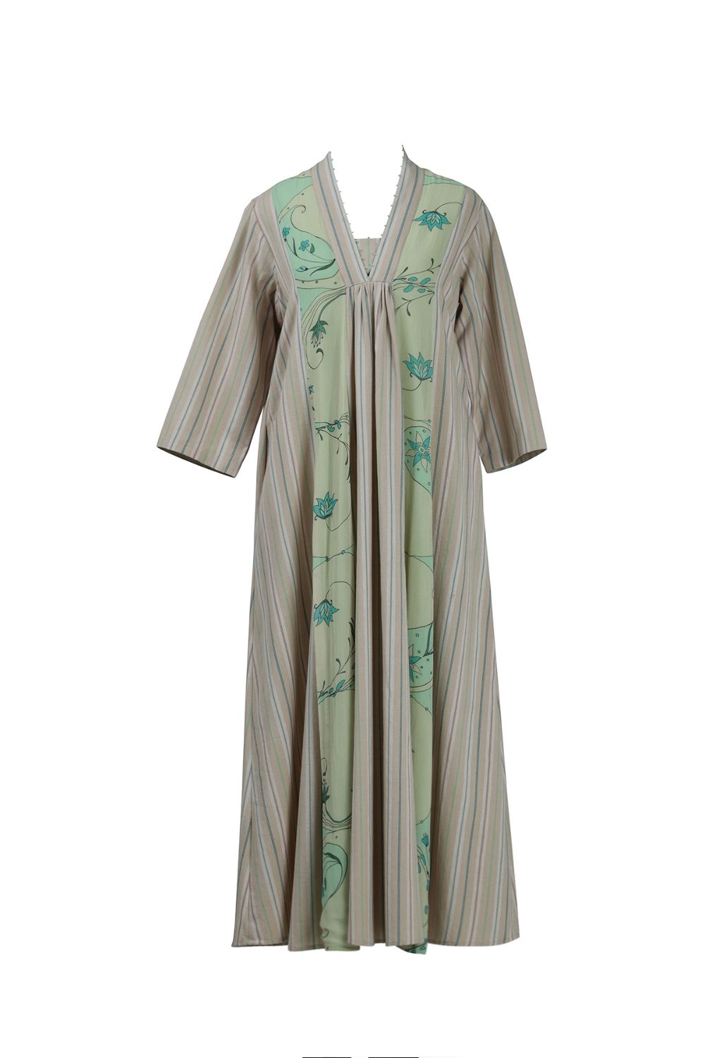 stitched V-neckline and accents are crafted in contrasting striped cotton,