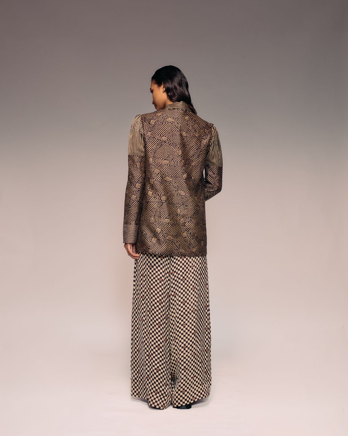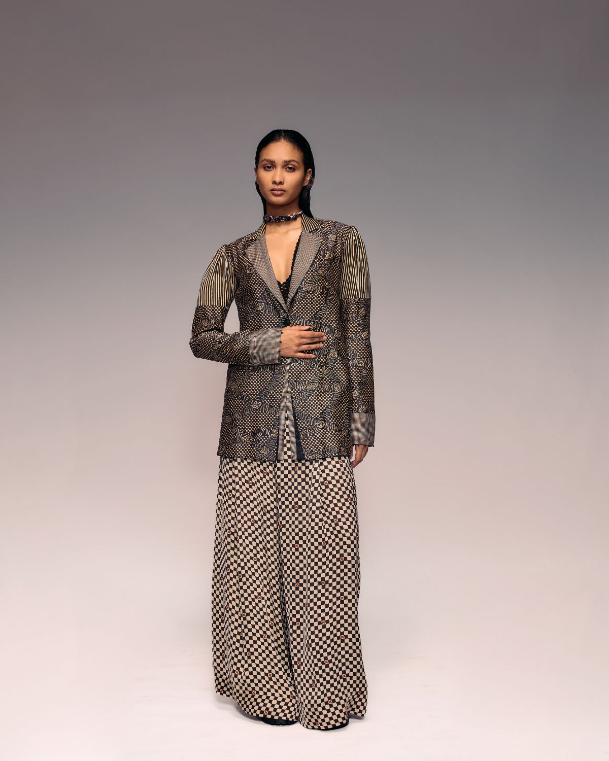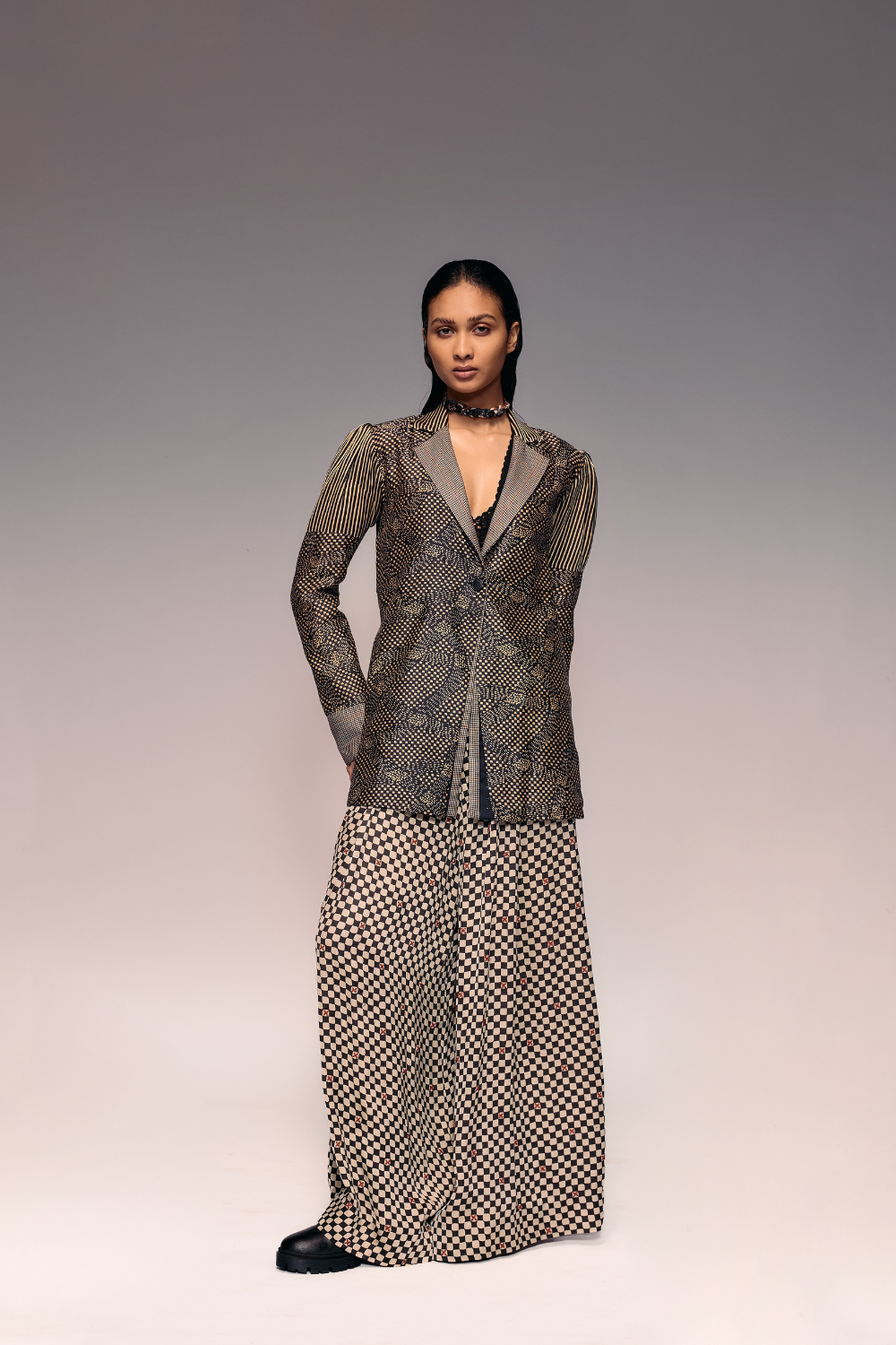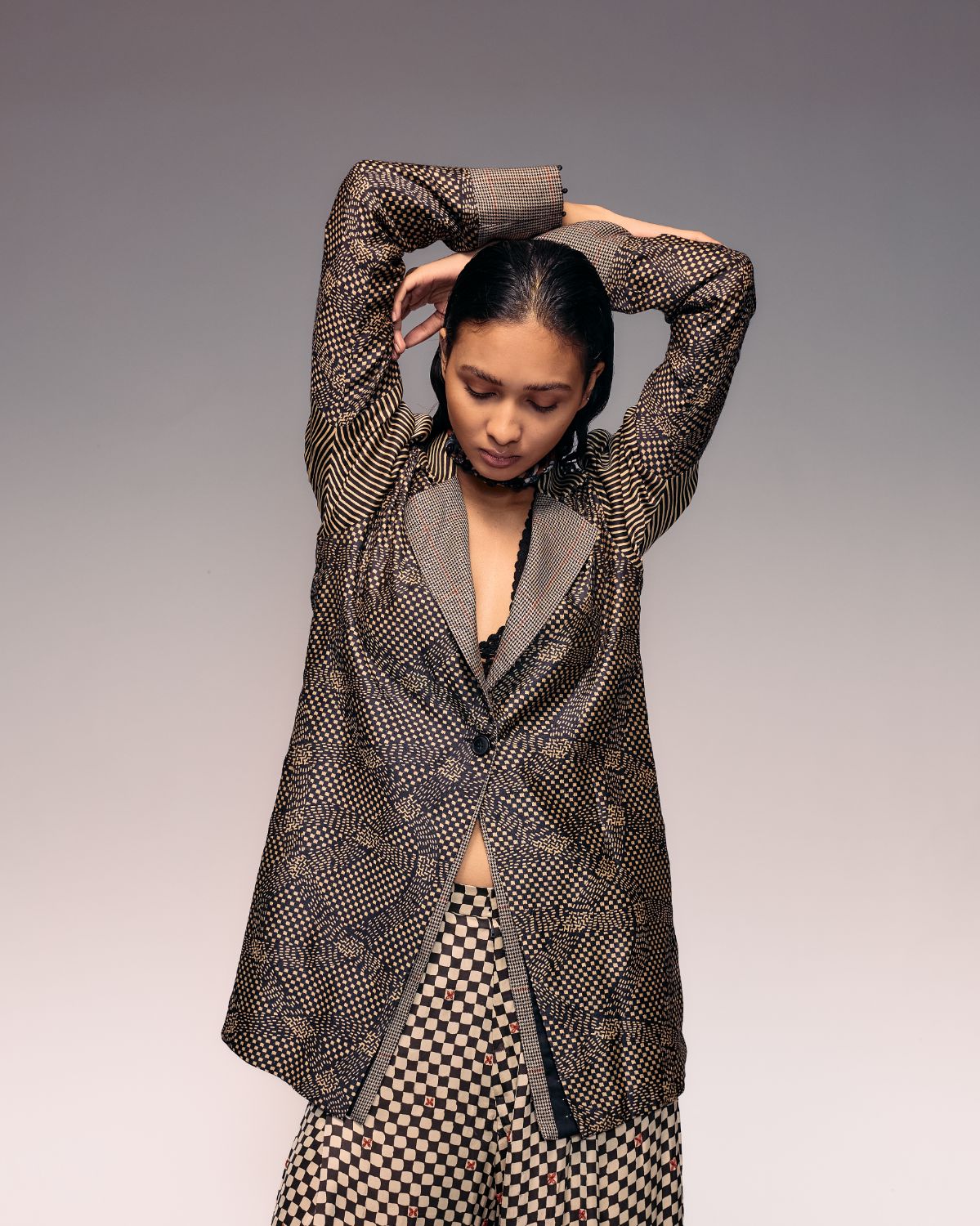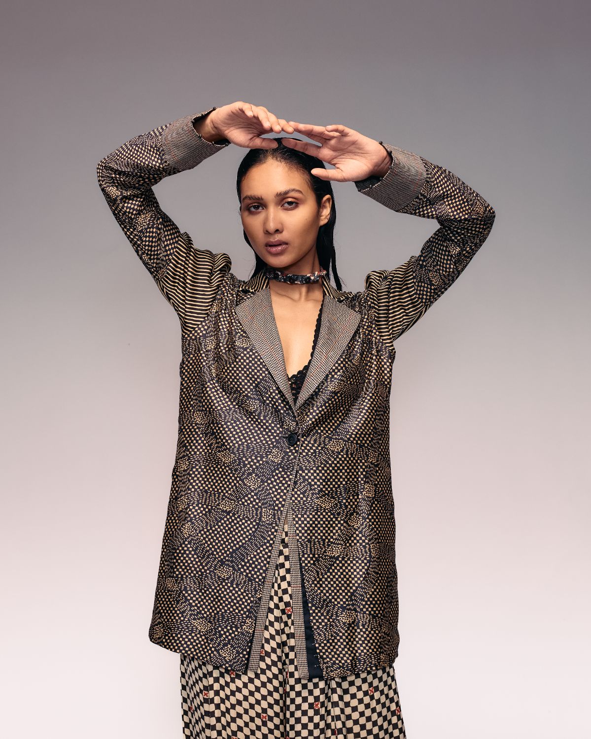 A statement of luxury craftsmanship, the Munga Silk Patch Blazer features panels of Ajrakh stripe, houndstooth, and checkered silk seamlessly joined with impeccable tailoring. The subtle sheen of munga silk adds richness, while fine stitching ensures structure and comfort. The patchwork artistry creates a bold yet elegant appeal. Pair with the matching dress or handloom skirt for a refined ensemble. Perfect for winter soirées, or art-inspired events.