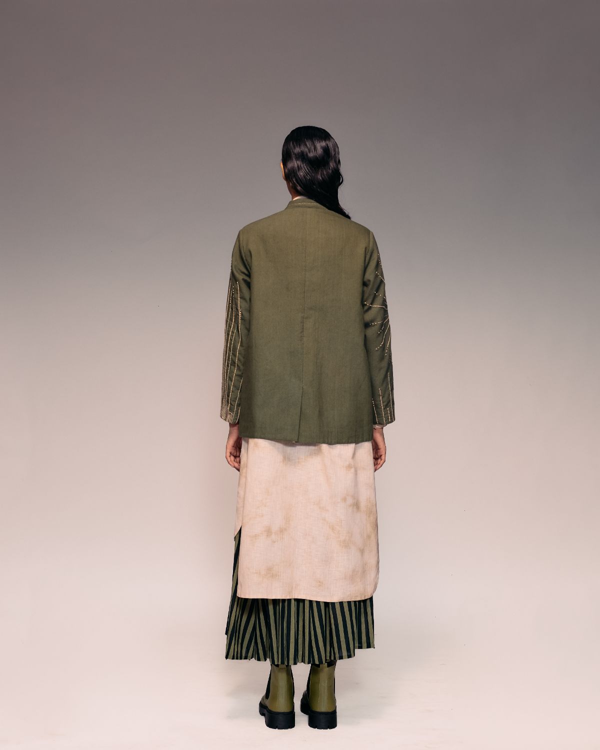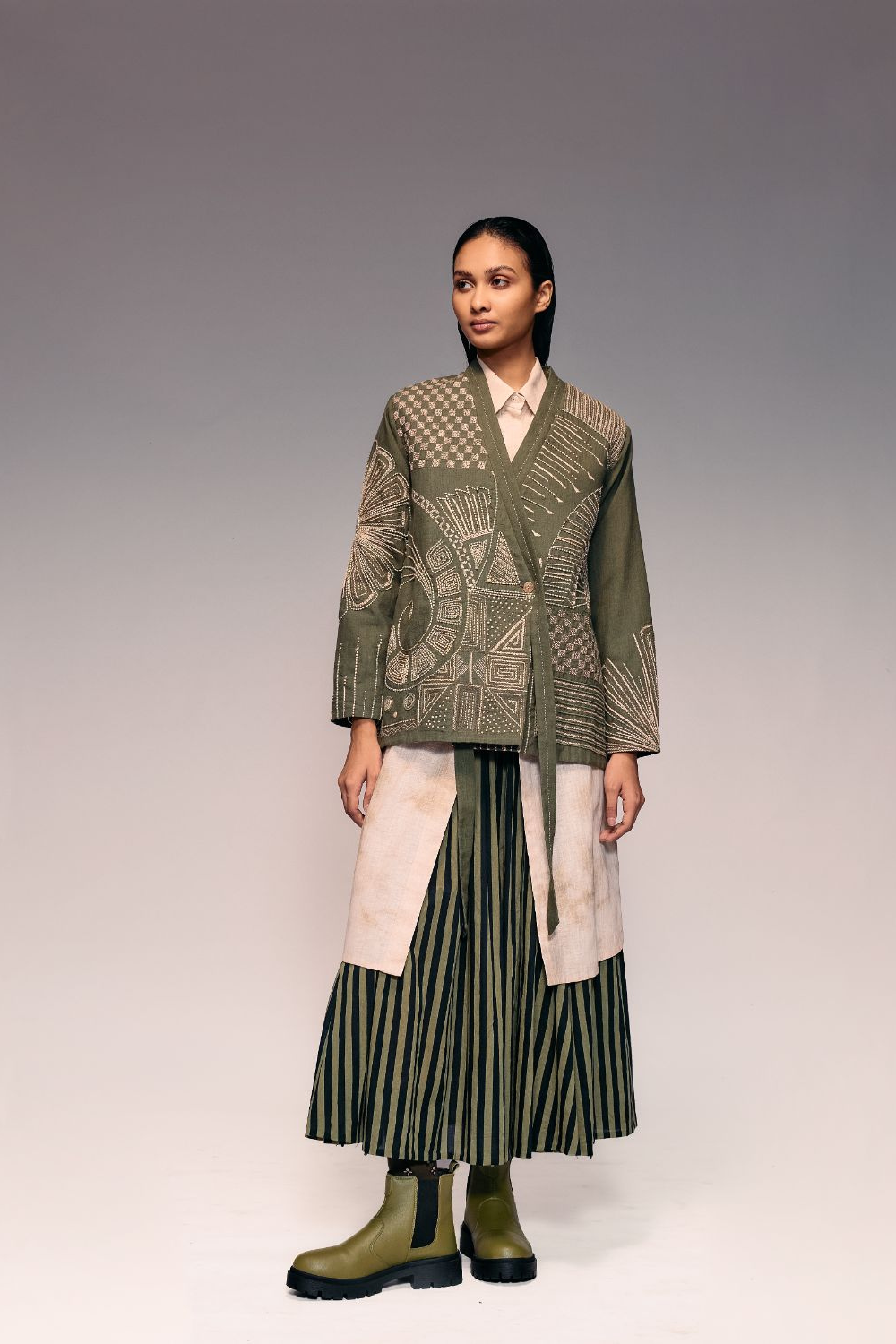 An artisanal masterpiece, the Olive Khadi Kantha Jacket features all-over kantha embroidery on an olive-dyed khadi base, blending heritage craft with modern tailoring. Its kimono-inspired overlap silhouette, structured with shoulder pads and a single-button closure, offers a refined yet relaxed look. Each stitch reflects meticulous handwork and craftsmanship. Style it with trousers, dresses, or skirts for layered elegance. Ideal for transitional seasons, art events, or sophisticated gatherings where tradition meets contemporary design.