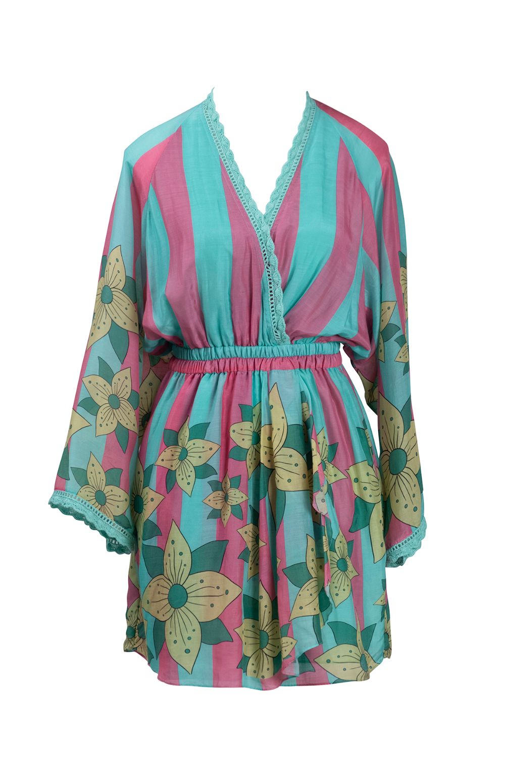 Youthful and breezy, this short jumper in pink-blue cotton silk stripes is your go-to outfit for carefree summer moments. The soft sheen of silk meets breathable comfort, while lace-trimmed neckline details add a sweet, romantic touch. The cinched elastic waist flatters the figure, making it perfect for resort lounging, brunches, or sightseeing under the sun. Pair with sandals and a straw hat for an effortlessly chic look.