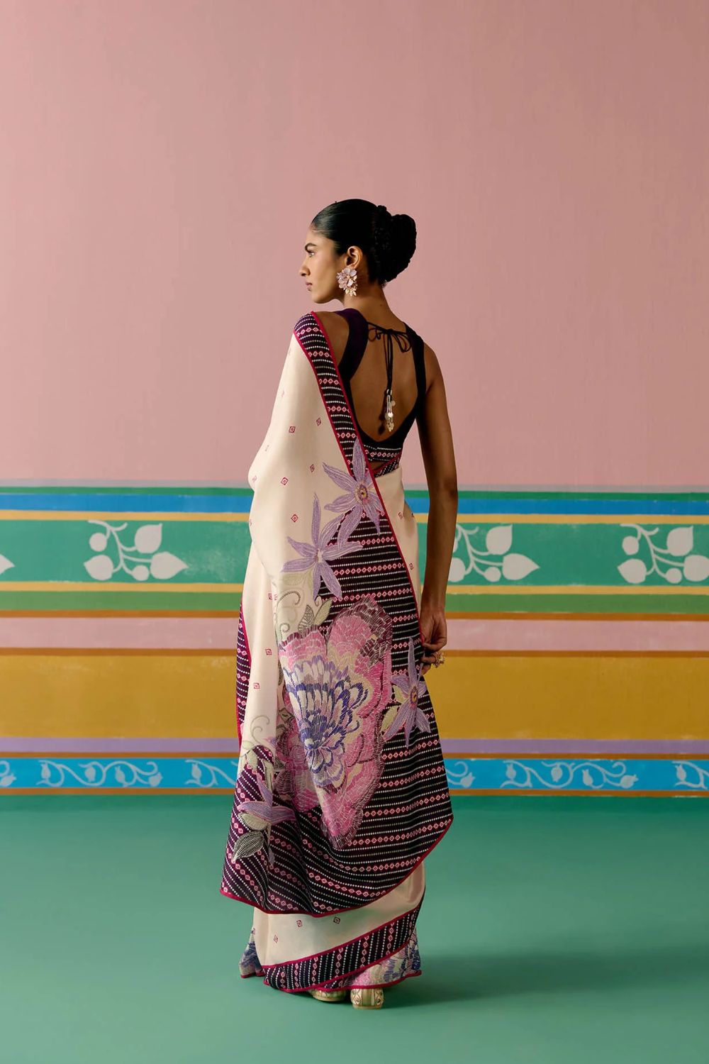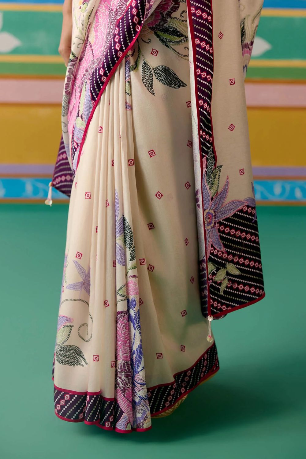Set on an ecru base with a striking purple ikkat print, the saree is elevated with delicate pearl tassels adorning the pallu for a graceful finish. A contrast facing along the border adds depth and definition, making this drape a perfect balance of tradition and modern charm.