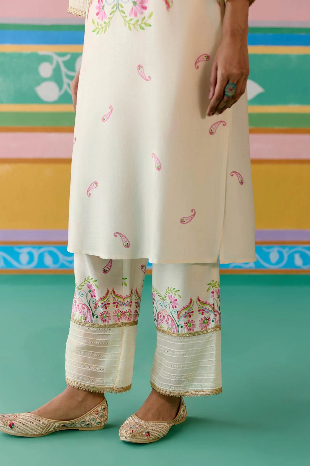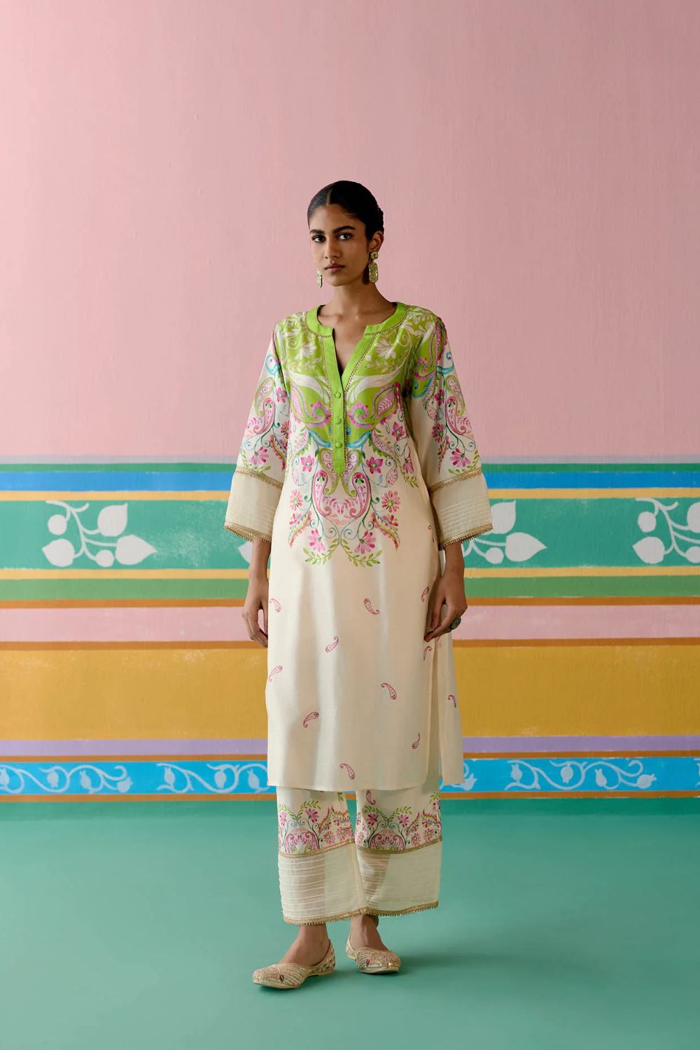 Elegant yet contemporary, the Lime Green Paisley V-neck Kurta Set is a true festive standout. Crafted in airy Chanderi with delicate organza detailing on the sleeves and pants, the kurta is elevated with lace inserts along the neckline and sleeves. Fine pintucks on the organza sleeves and pants add subtle texture, while the elasticated back on the pants ensures effortless comfort. Paired with a organza dupatta edged in a full lace border, this set strikes the perfect balance of sophistication and ease—ideal for celebrations that call for understated glamour.