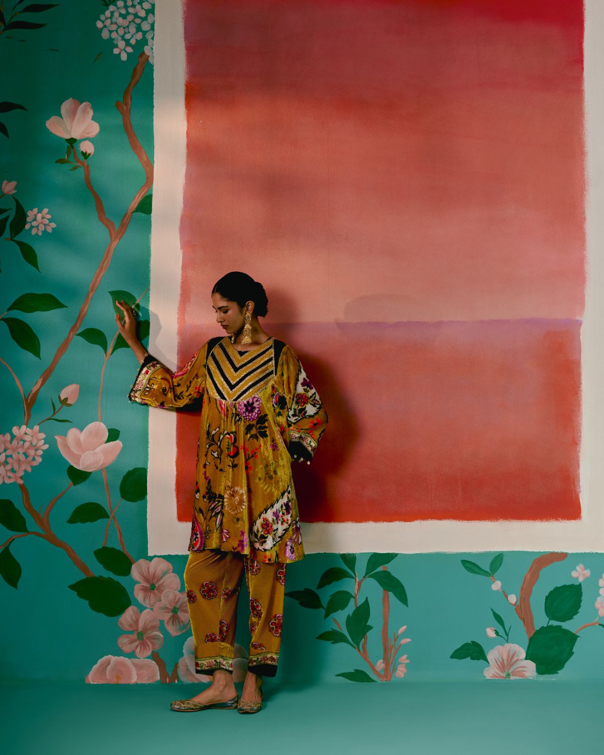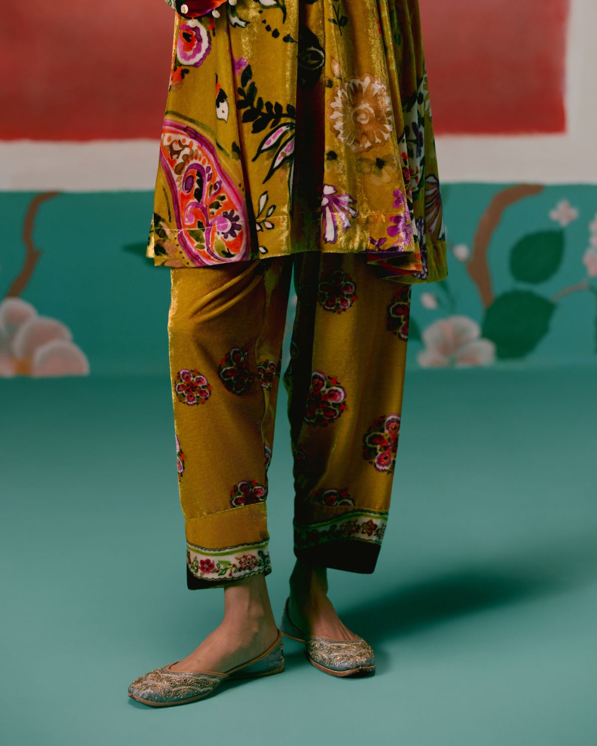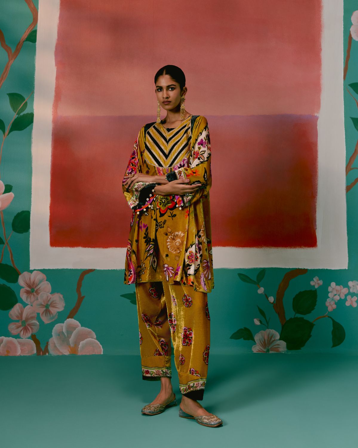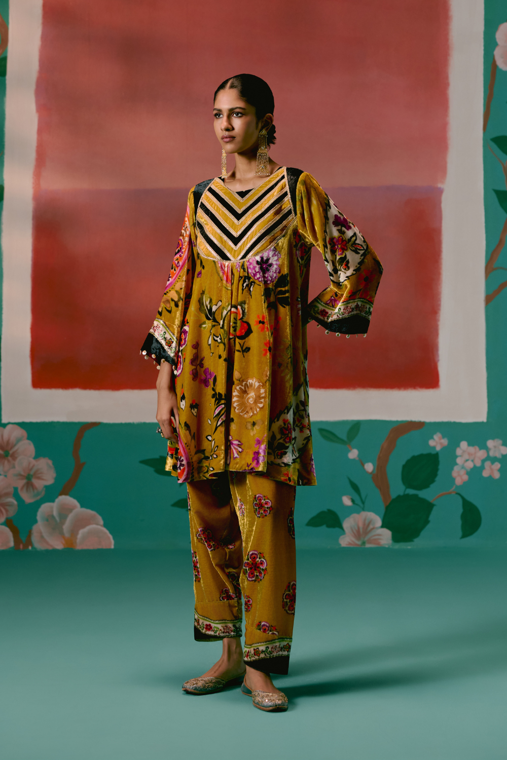 Lush and festive, the Mustard Floral Velvet Kurta Set exudes regal elegance with a modern touch.