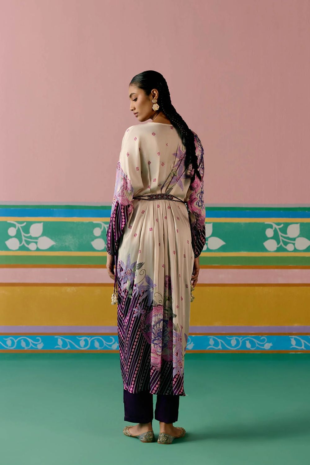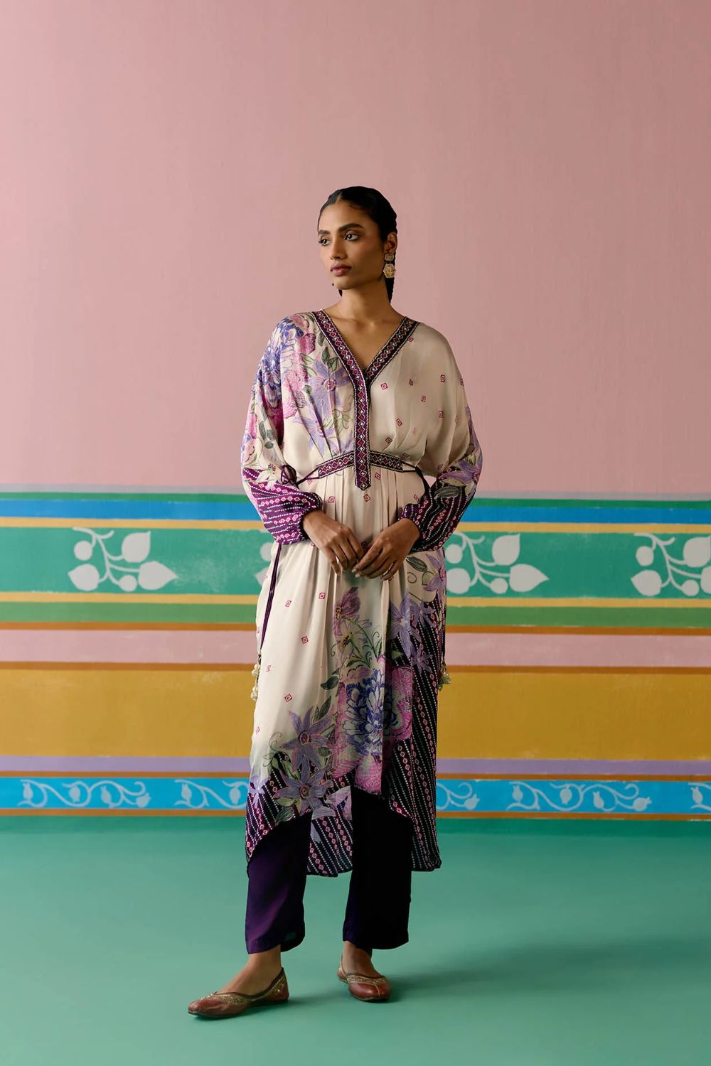 Effortlessly elegant, the Purple Ikkat Kaftan Set is crafted in fluid Viscose Satin Georgette for a luxe festive feel. The kaftan is highlighted with intricate hand-embroidered gota patti work on the neckline and waistband, bringing a touch of traditional artistry to the silhouette. Dori tie-up details with tassels on the sides add playful movement, while the elasticated sleeves and pants with an elasticated back ensure comfort without compromising on style. A perfect balance of ease and grandeur, this set is made to shine at every celebration.