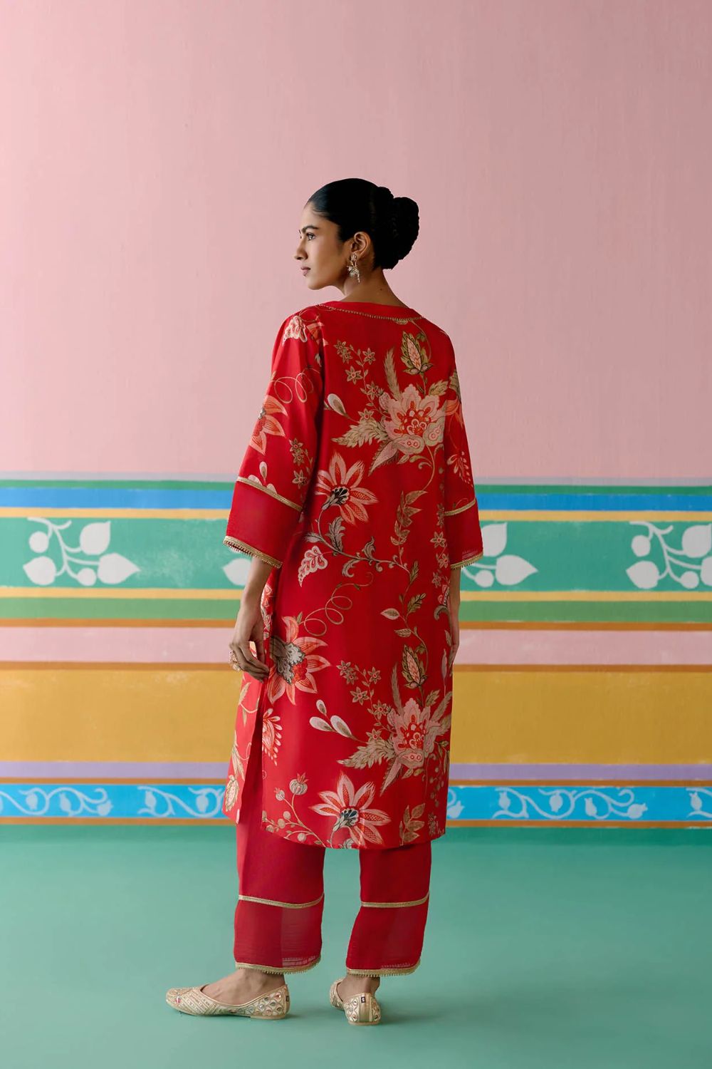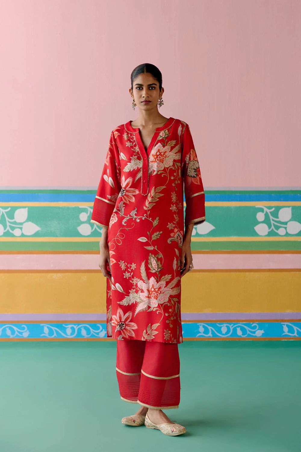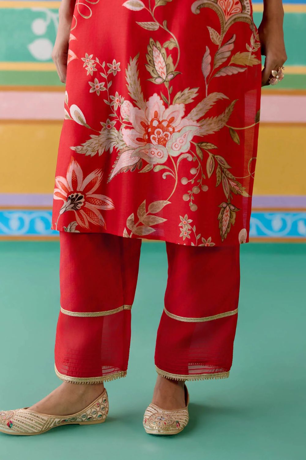 Elegant yet contemporary, the Red Chintz V-neck Kurta Set is a true festive standout. Crafted in airy Chanderi with delicate organza detailing on the sleeves and pants, the kurta is elevated with lace inserts along the neckline and sleeves.