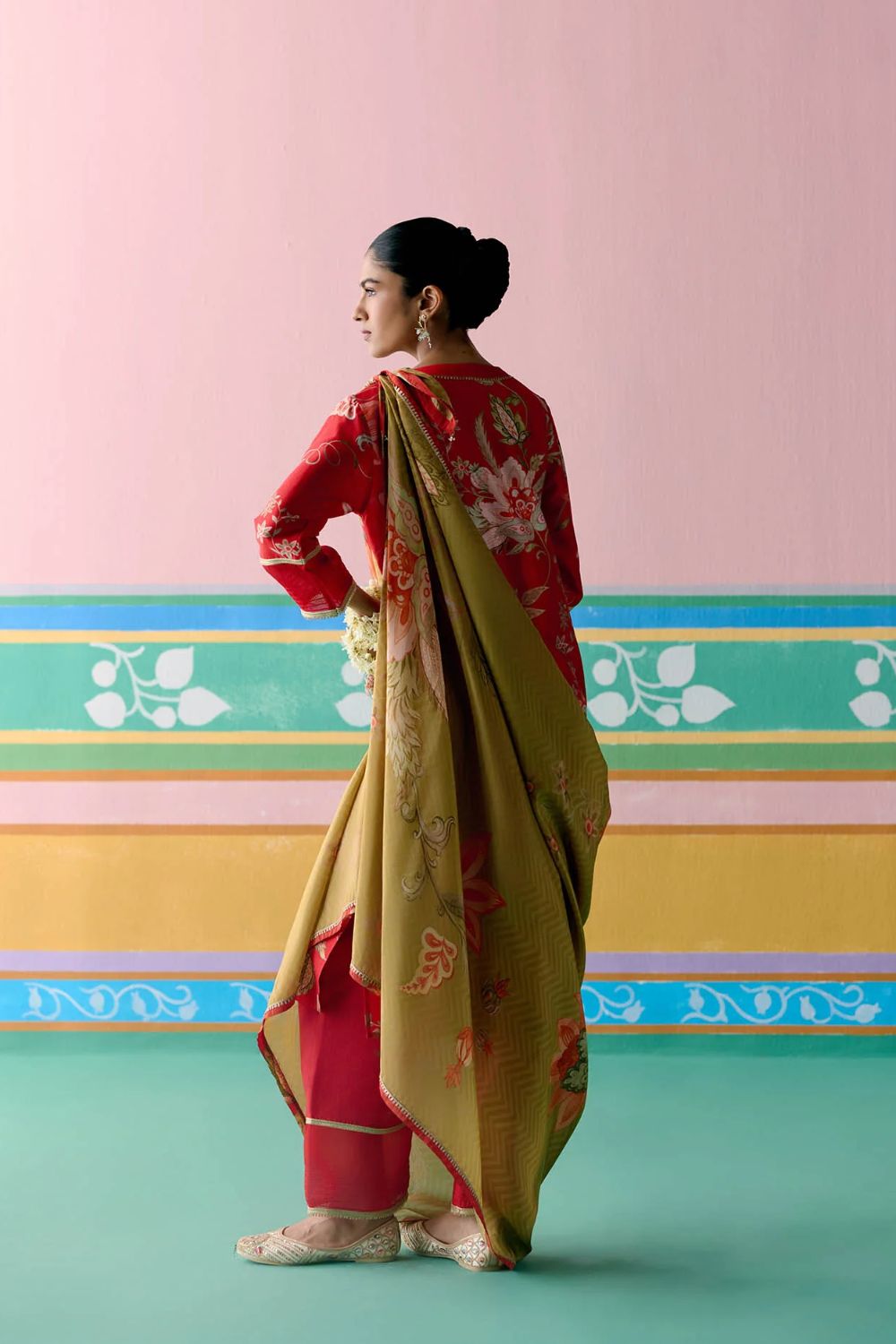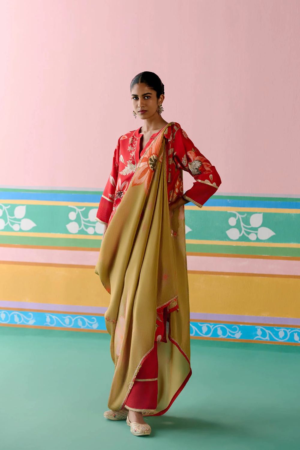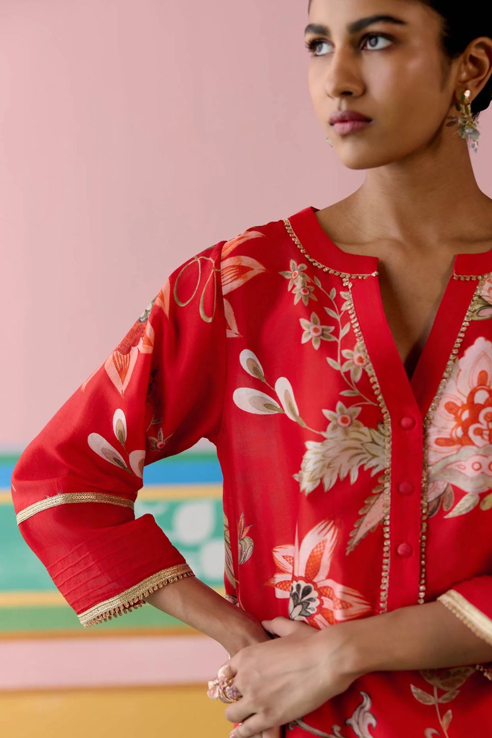 Elegant yet contemporary, the Red Chintz V-neck Kurta Set is a true festive standout. Crafted in airy Chanderi with delicate organza detailing on the sleeves and pants, the kurta is elevated with lace inserts along the neckline and sleeves.