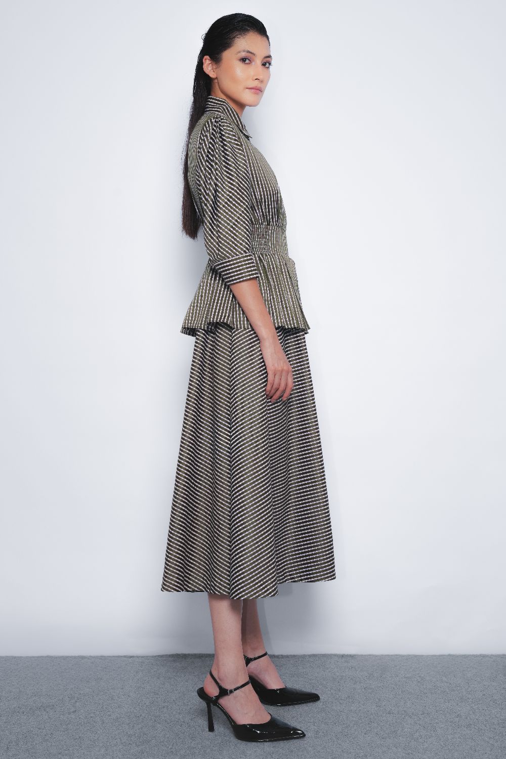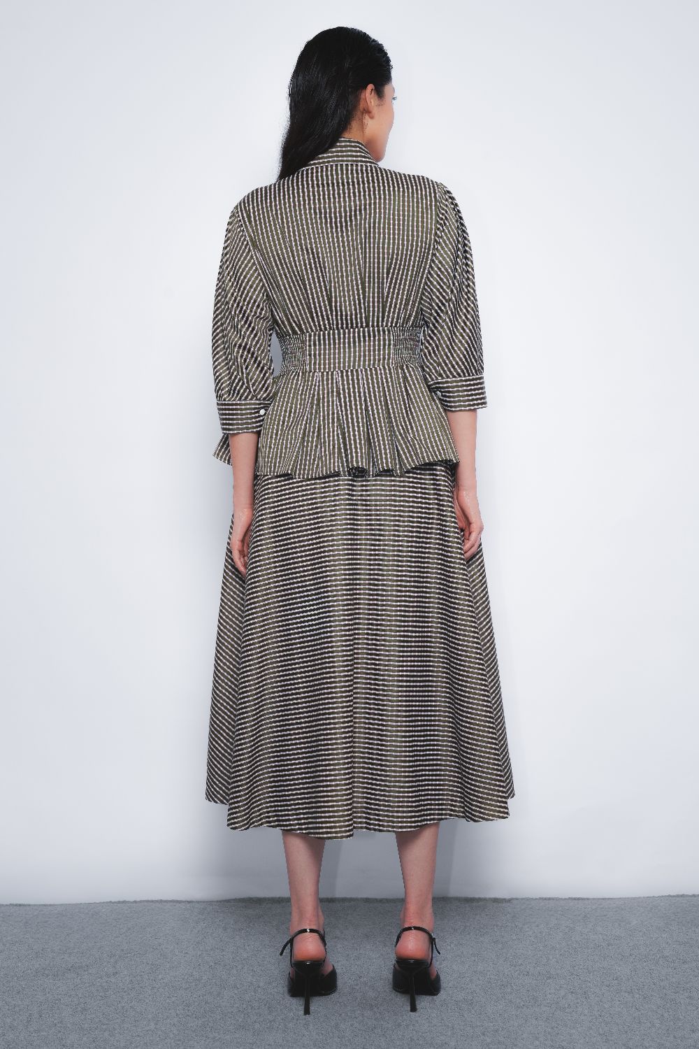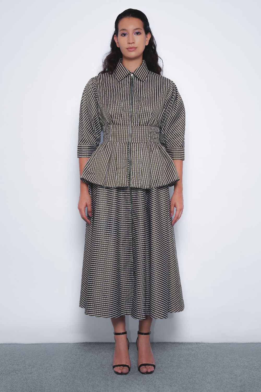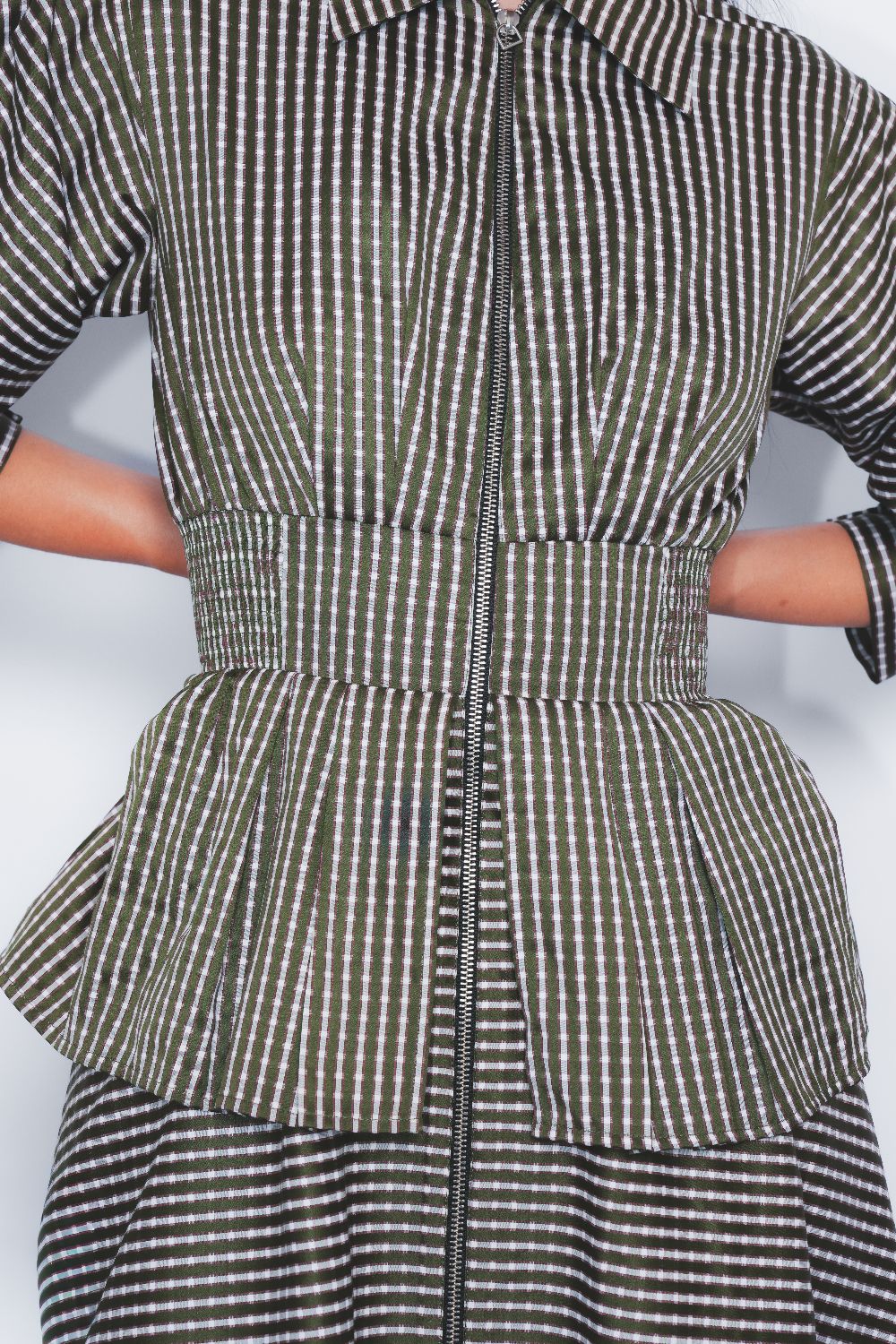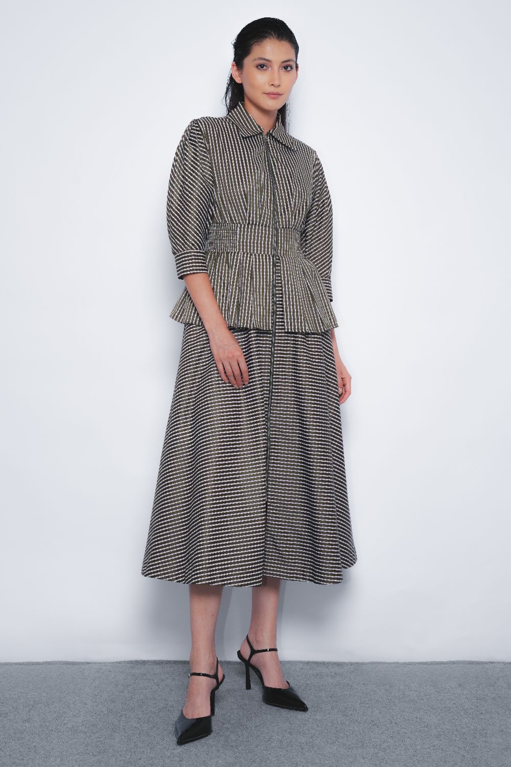 A classic dress silhouette cinched with an elasticated waistline elevated with a utilitarian update with a full front zipper opening. A tailored construction with a feminine touch. pleated detail at the sleeves adding to it and a flared skirt adding volume to it.