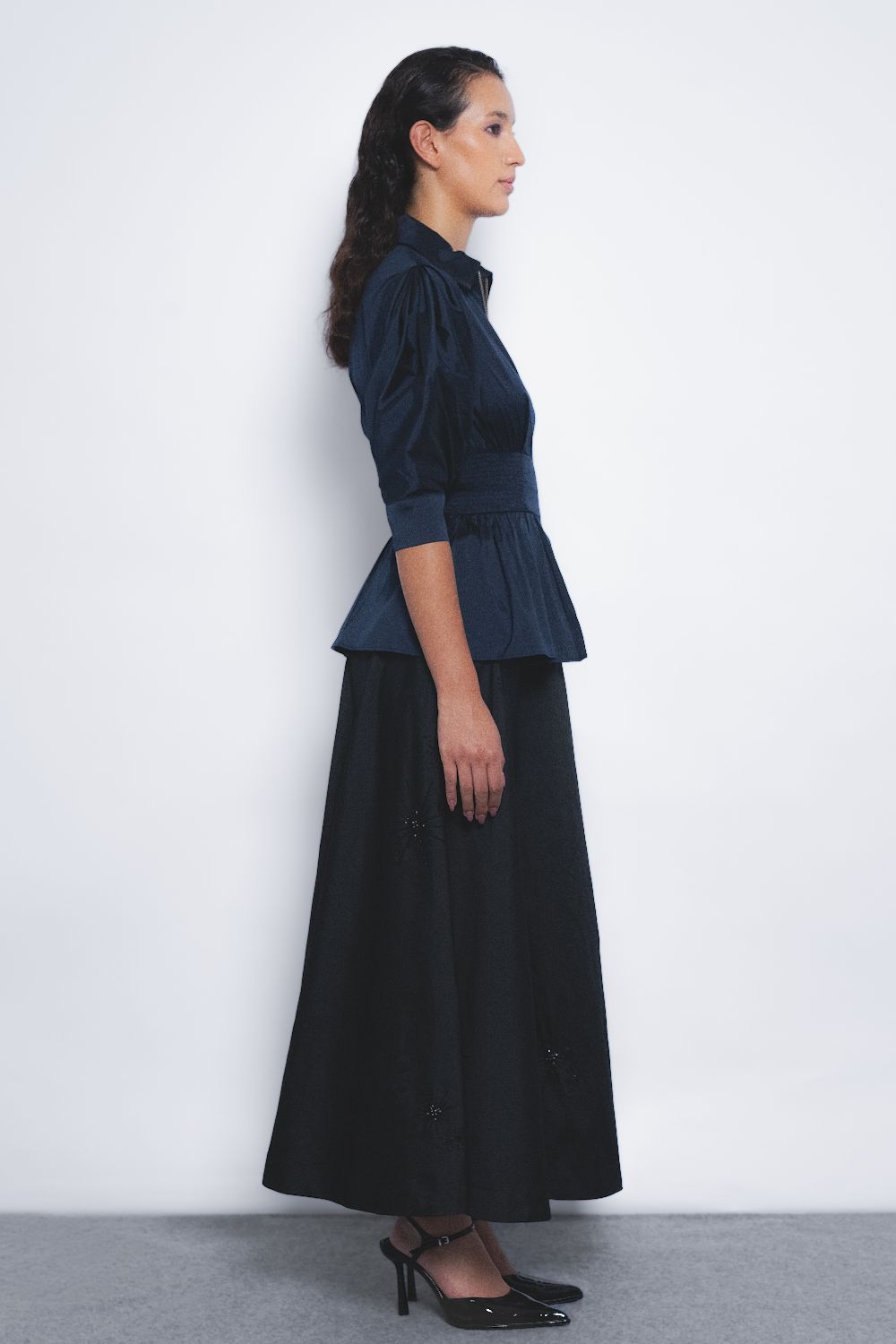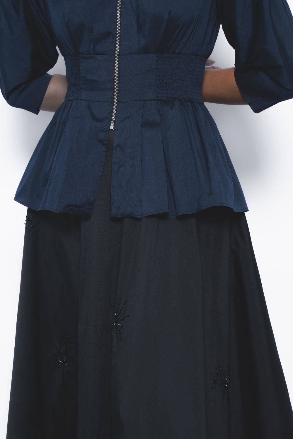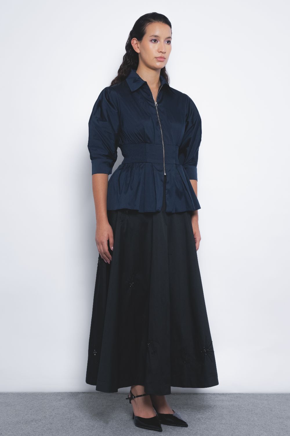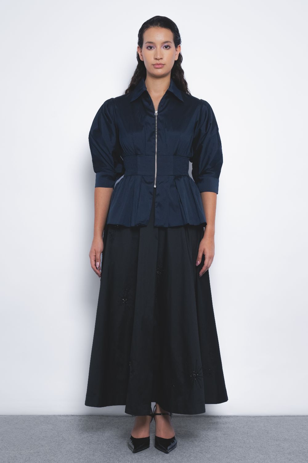 This playful silhouette, tailored in taffeta, presents a modern yet graceful take on the hourglass fit. Pleated sleeves add a soft, voluminous touch to the design.