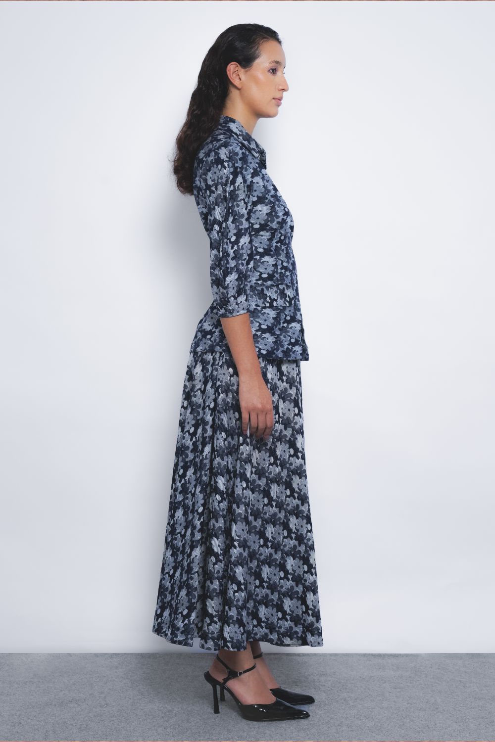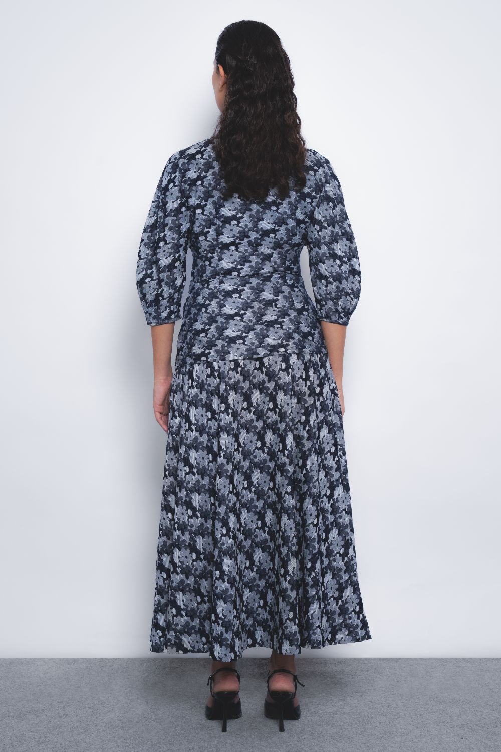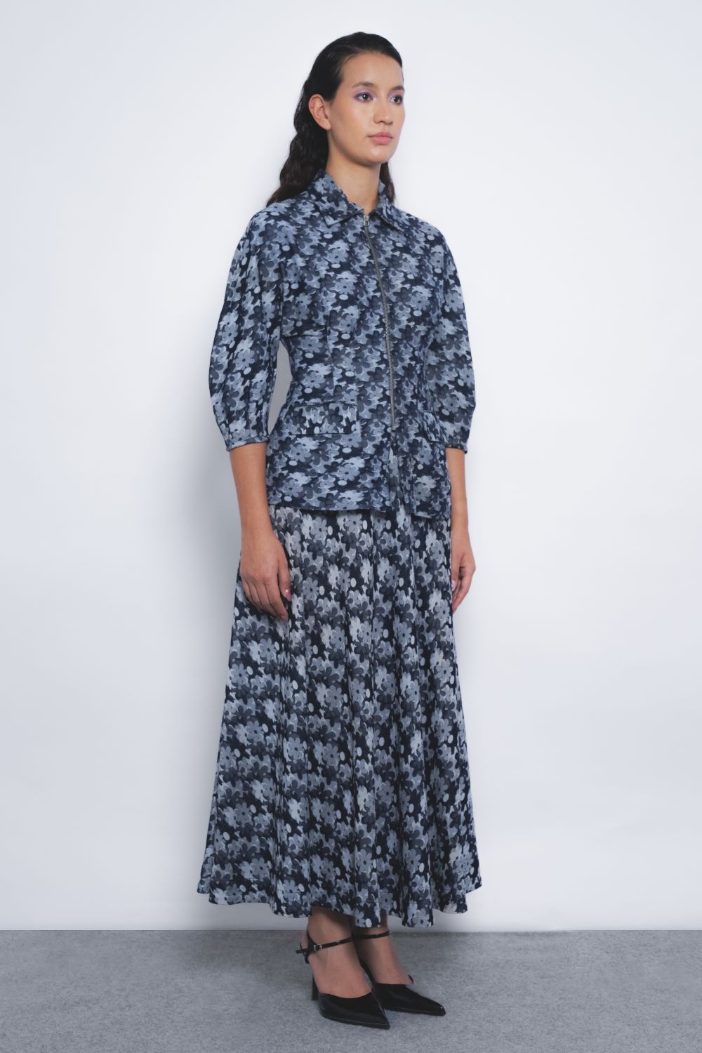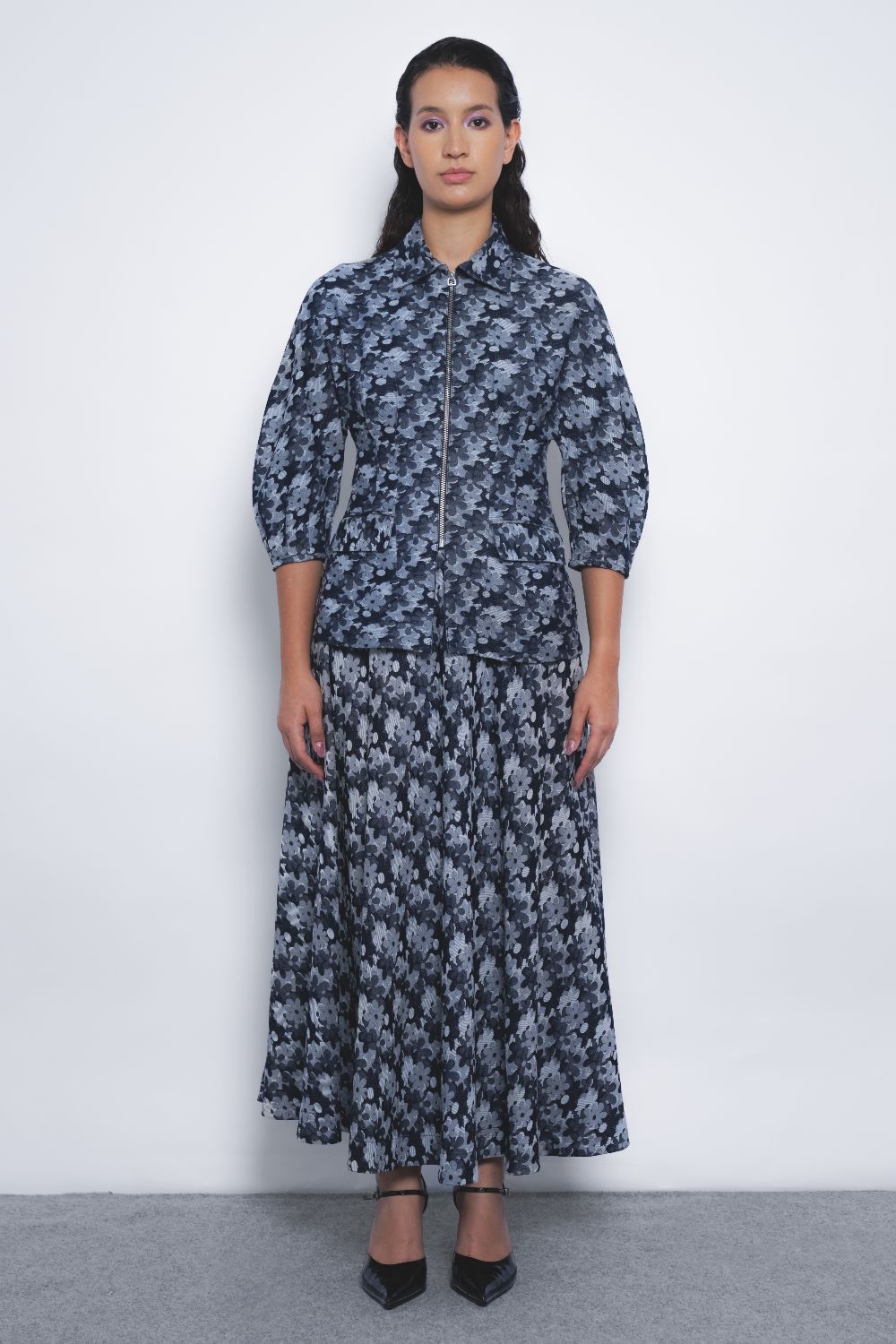 This tailored silhouette in floral denim jacquard features a strategic play of darts at the waistline and sleeves, creating a sculpted form defined by precise, clean lines.