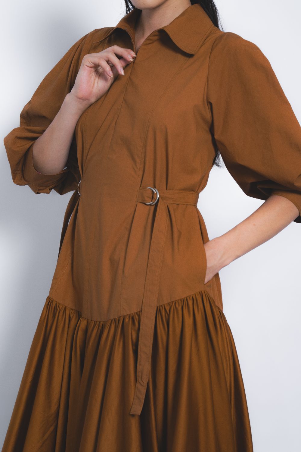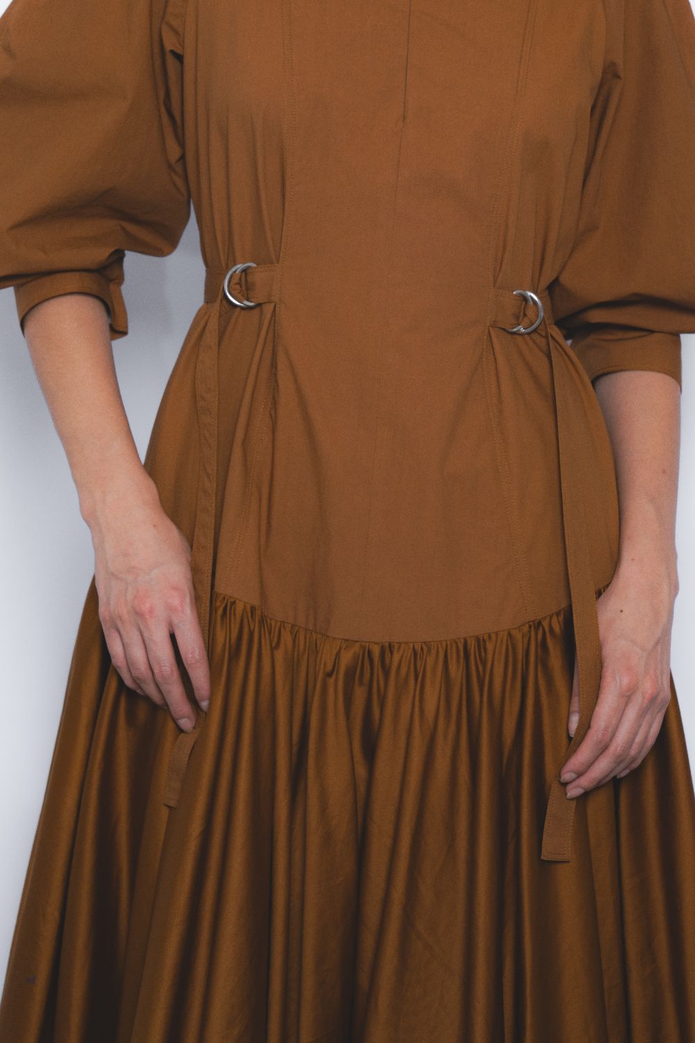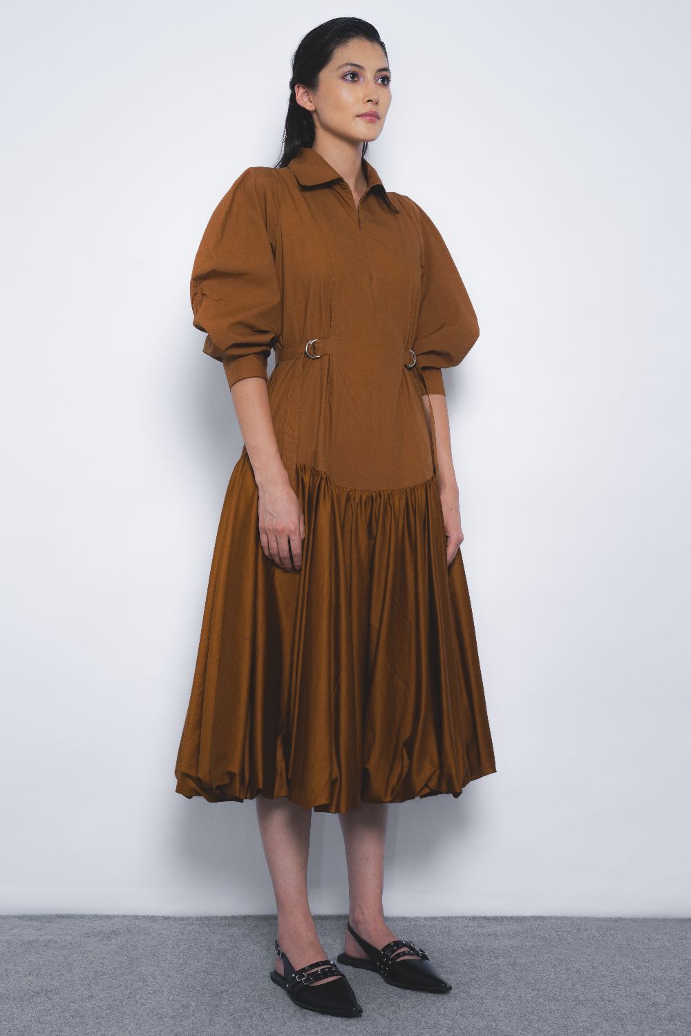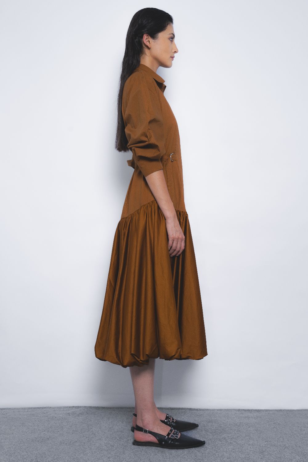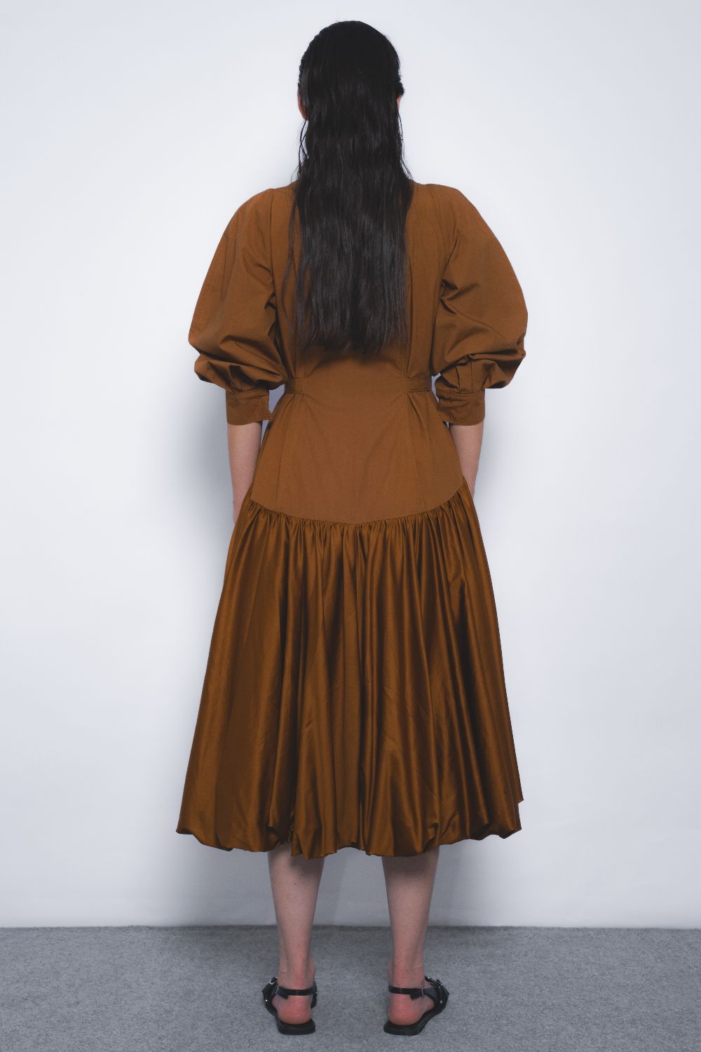 This soft, structured silhouette explores textile manipulation to create a voluminous bubble hemline, complemented by gently sculpted shoulders, a look that is elegant yet playful.