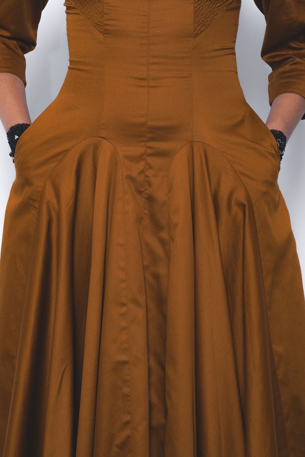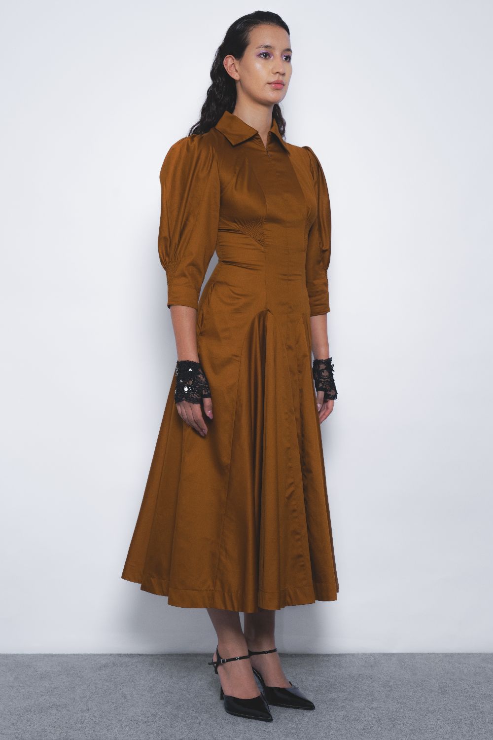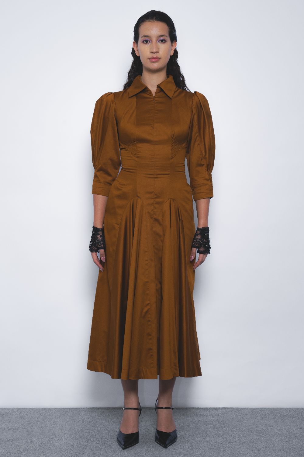 Crafted in rich cotton satin, this garment exudes the feminine form in a soft sculptural silhouette.Panelled construction contours the body, complemented by a voluminous hemline and softly structured sleeves.