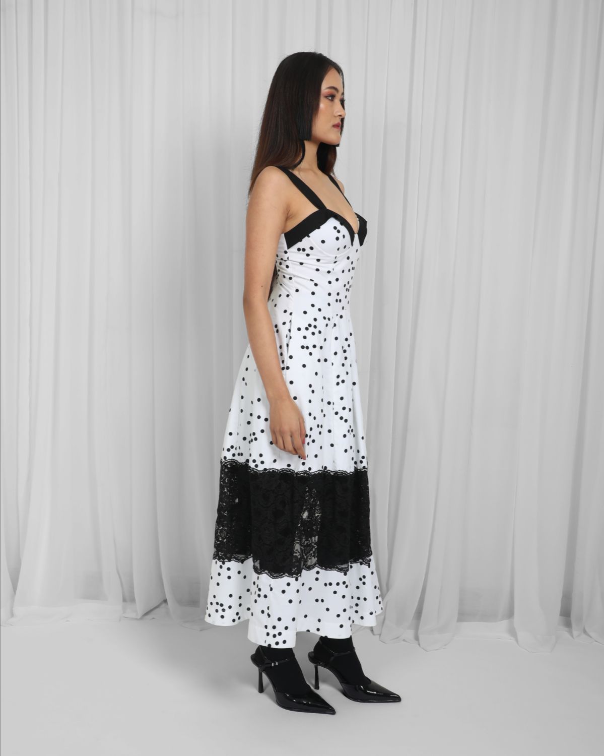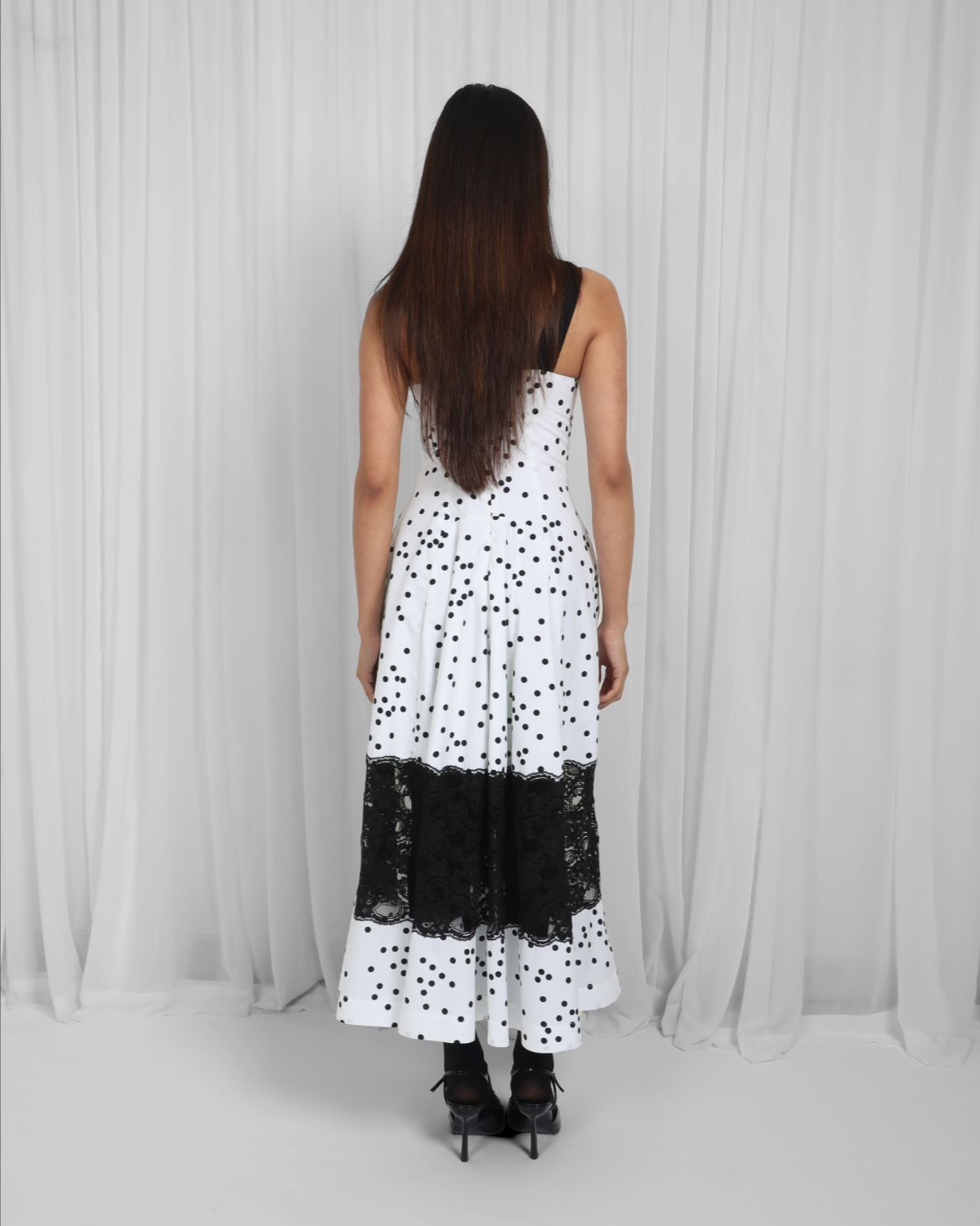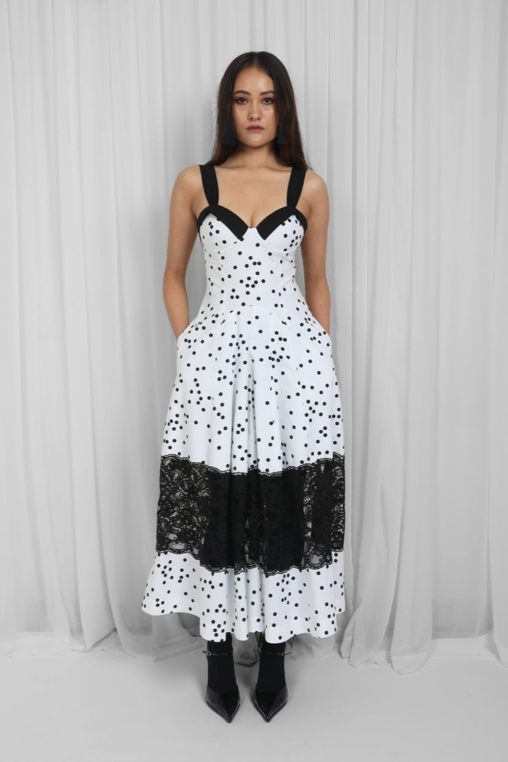 Made with 100% cotton fabric, this elegant midi dress has a paded cup with black panel detailing, curved waistline, strap detail and intricate lace panel. Contoured around the waist to fit and flatter, with a circular cut skirt. Model Height is 5'8". Model wear size S. Garment length is 50"