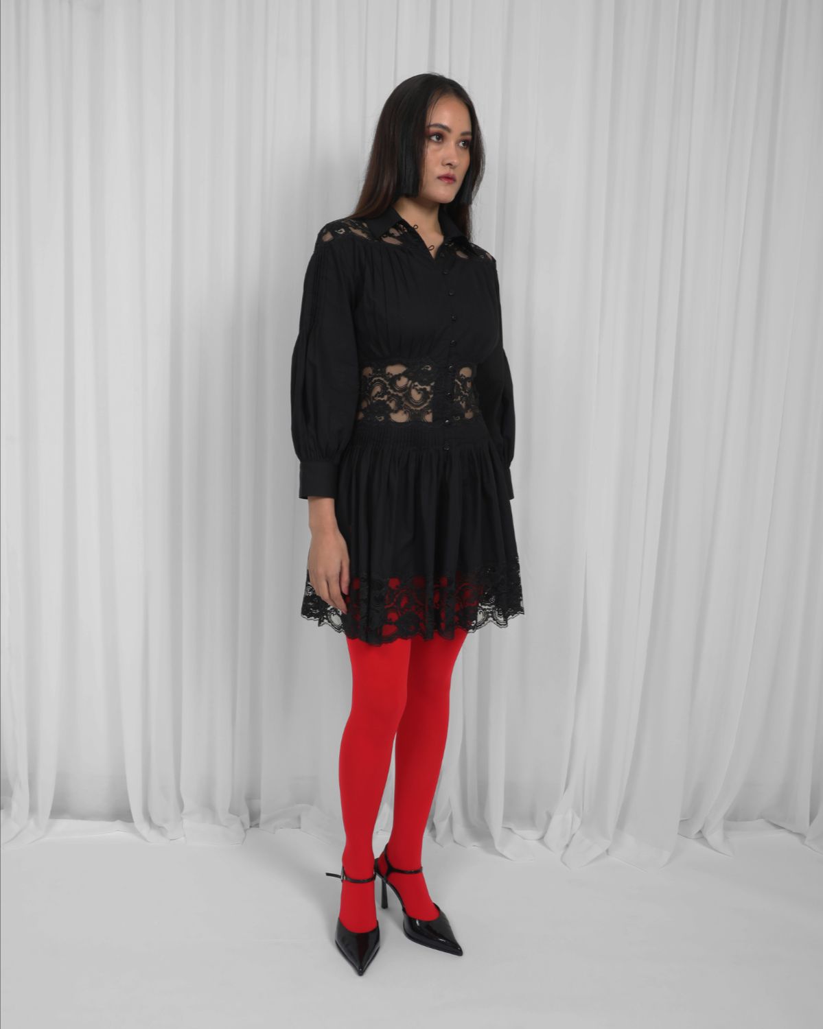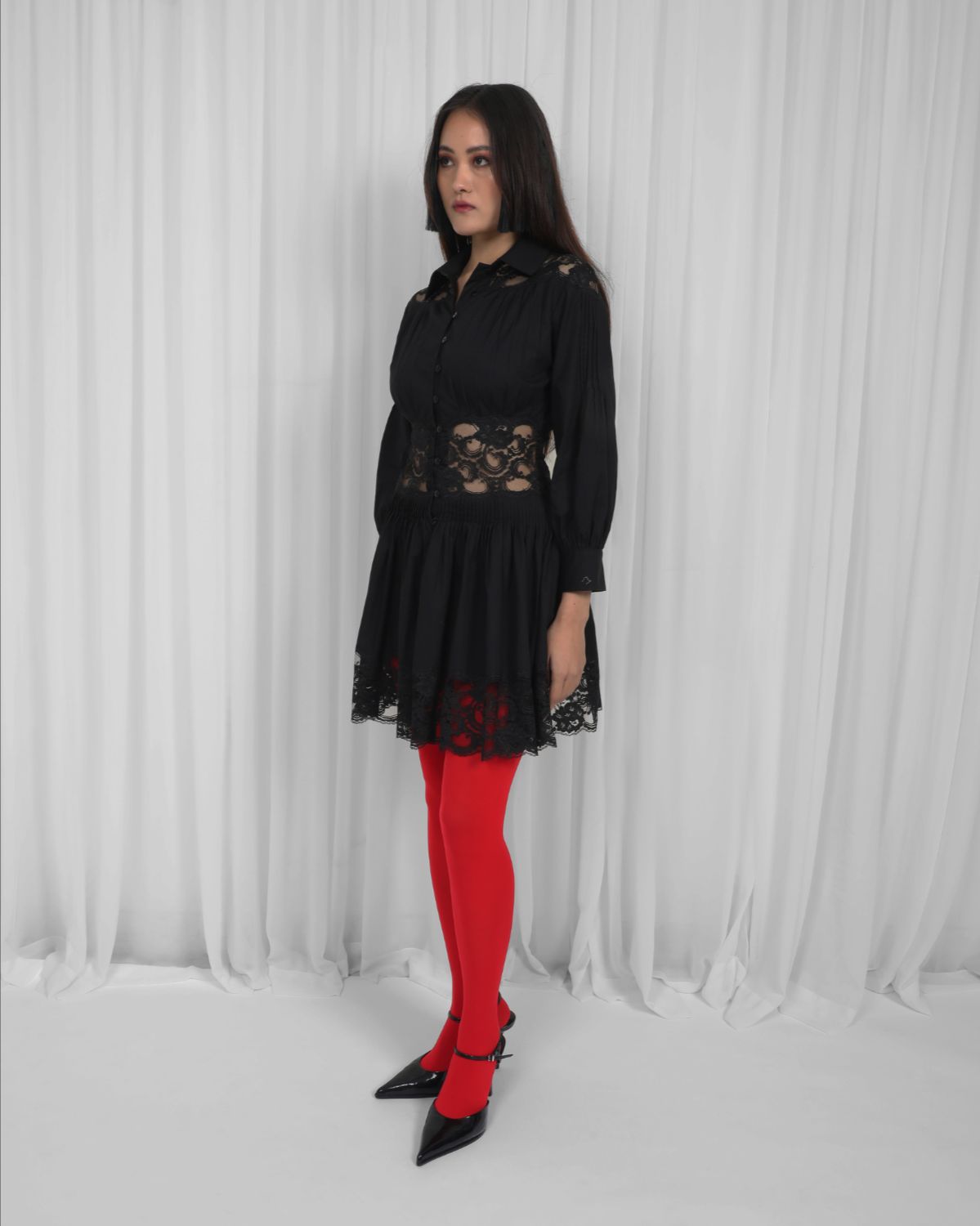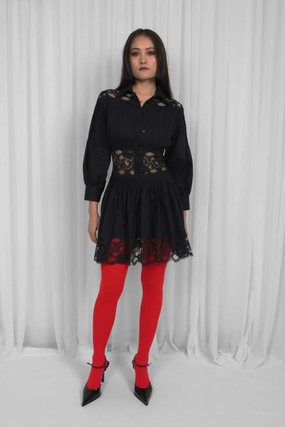 Panelled with lace and 100% cotton fabric, this dress is intricately hand pleated to detail featuring front placket with elastic button loops. Model height is 5'8" Model wear size S garment length is 34"