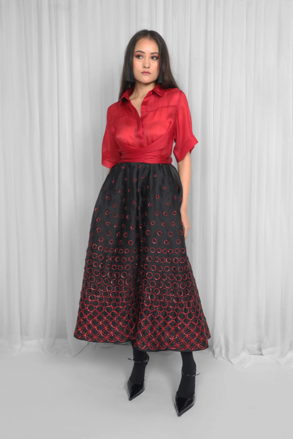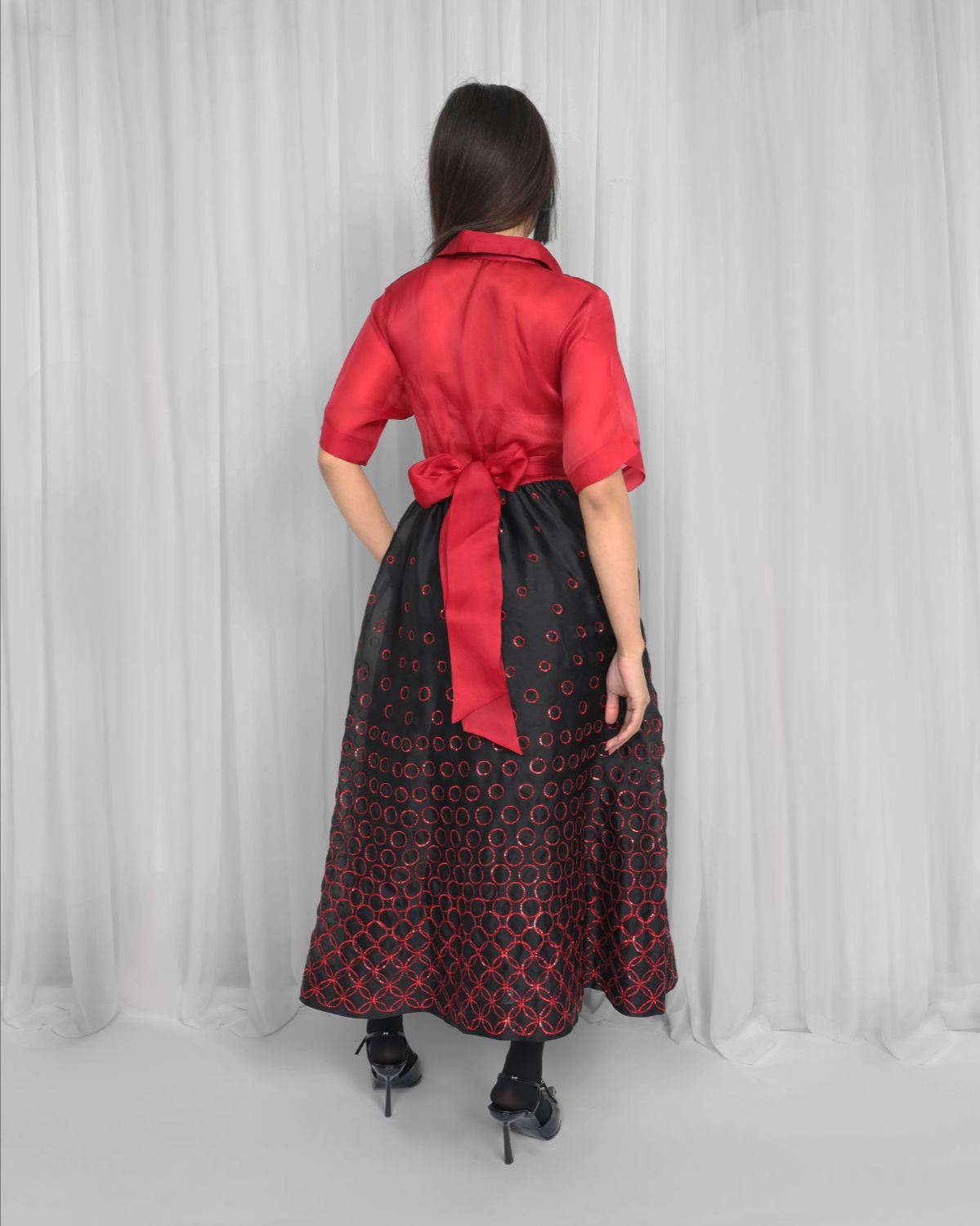 Delicately crafted from silk organza and intricately hand embellished with sequins, a new take on this classic leh studios silhouette, features a tie up from the front bodice at waist with back elastic for style and comfort. Model height is 5'8" Model wear size S garment length is 50"