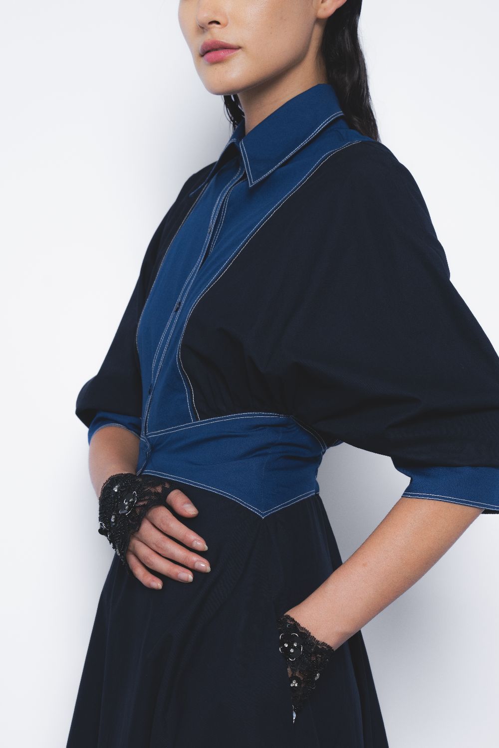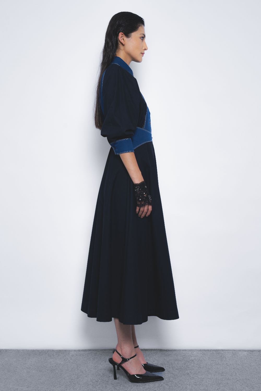 A tailored dress with a classic feminine silhouette, reimagined with a contemporary twist. The garment infuses formal style with a modern sensibility, balancing timeless elegance with subtle, playful refinement.