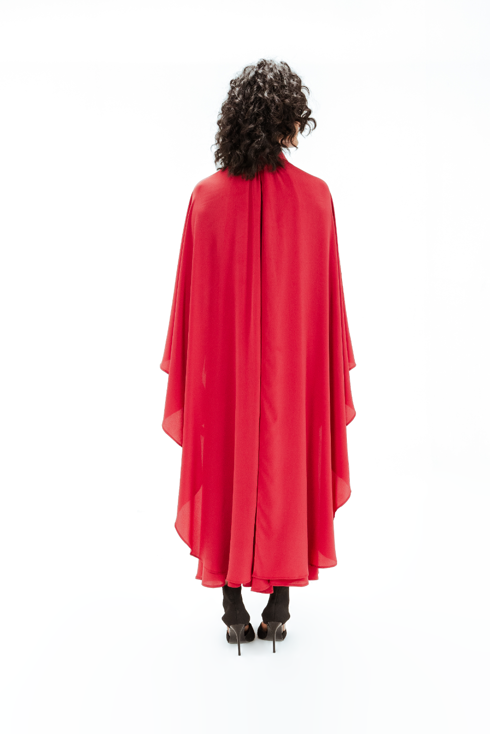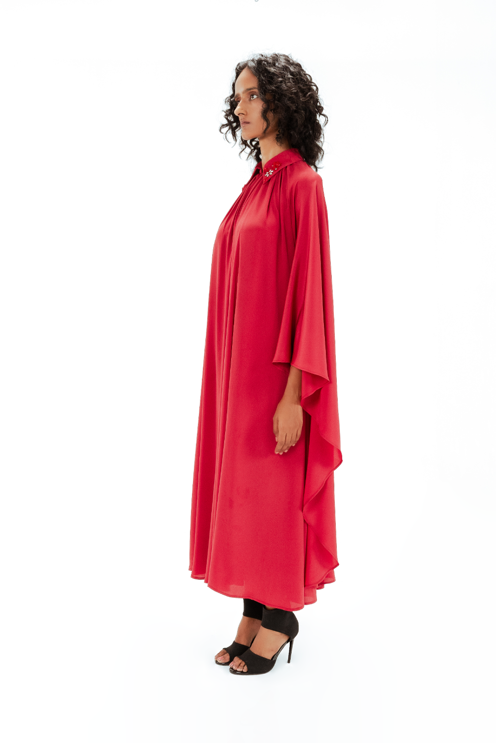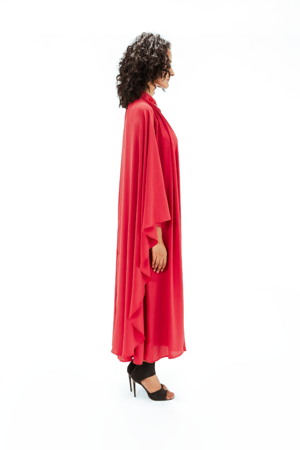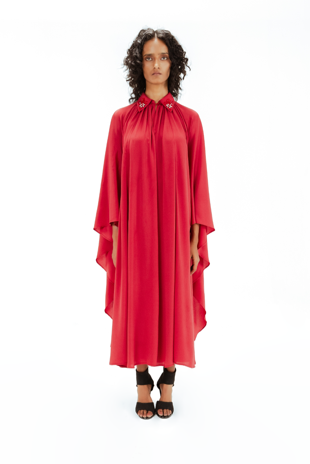 A reimagined kaftan in fluid crepe, this dress features playful shawl-style sleeves that drape effortlessly for a sense of movement and ease. Finished with delicate collar embellishments. Model Height is 5'9". Model wears size S. Garment length is 50"