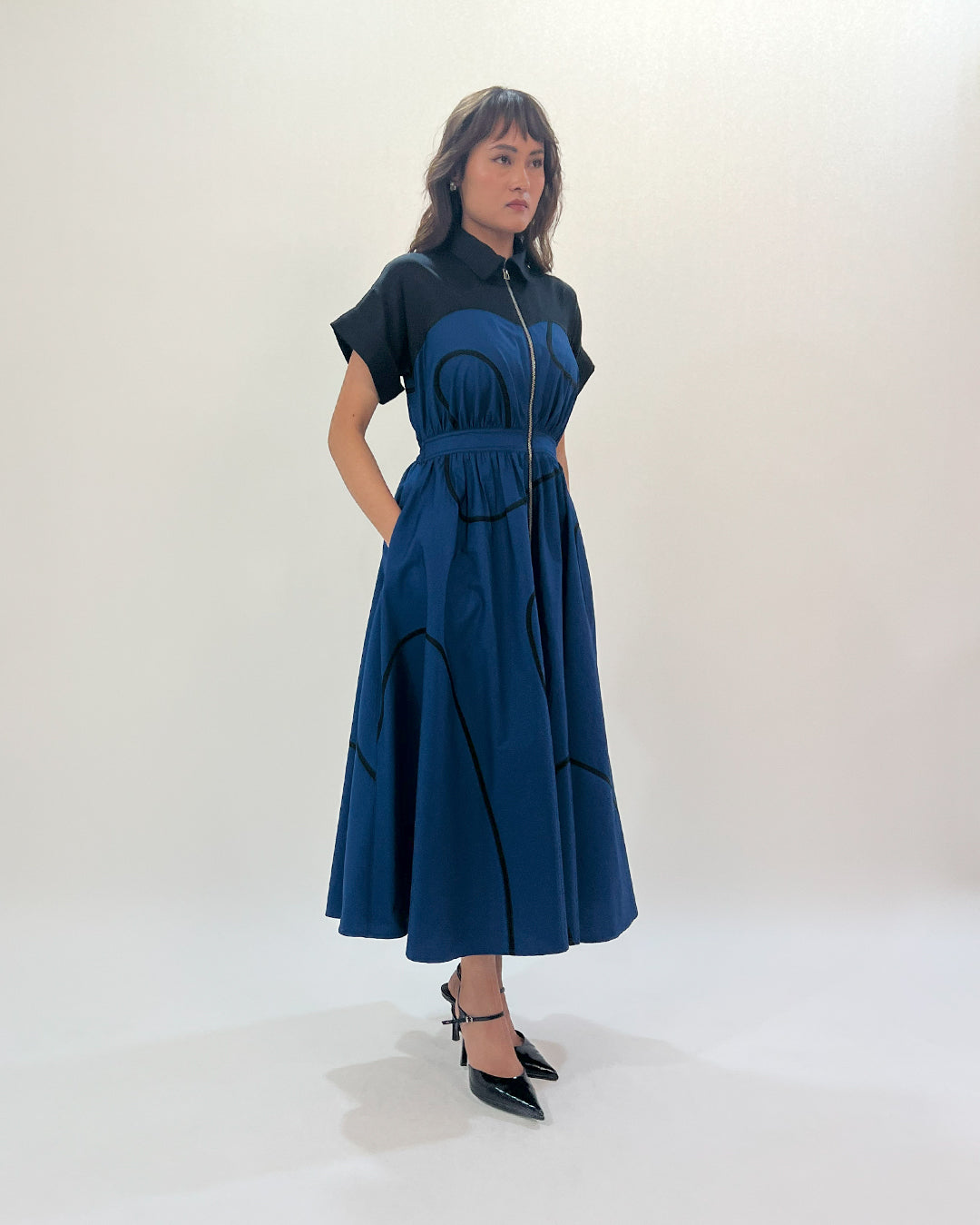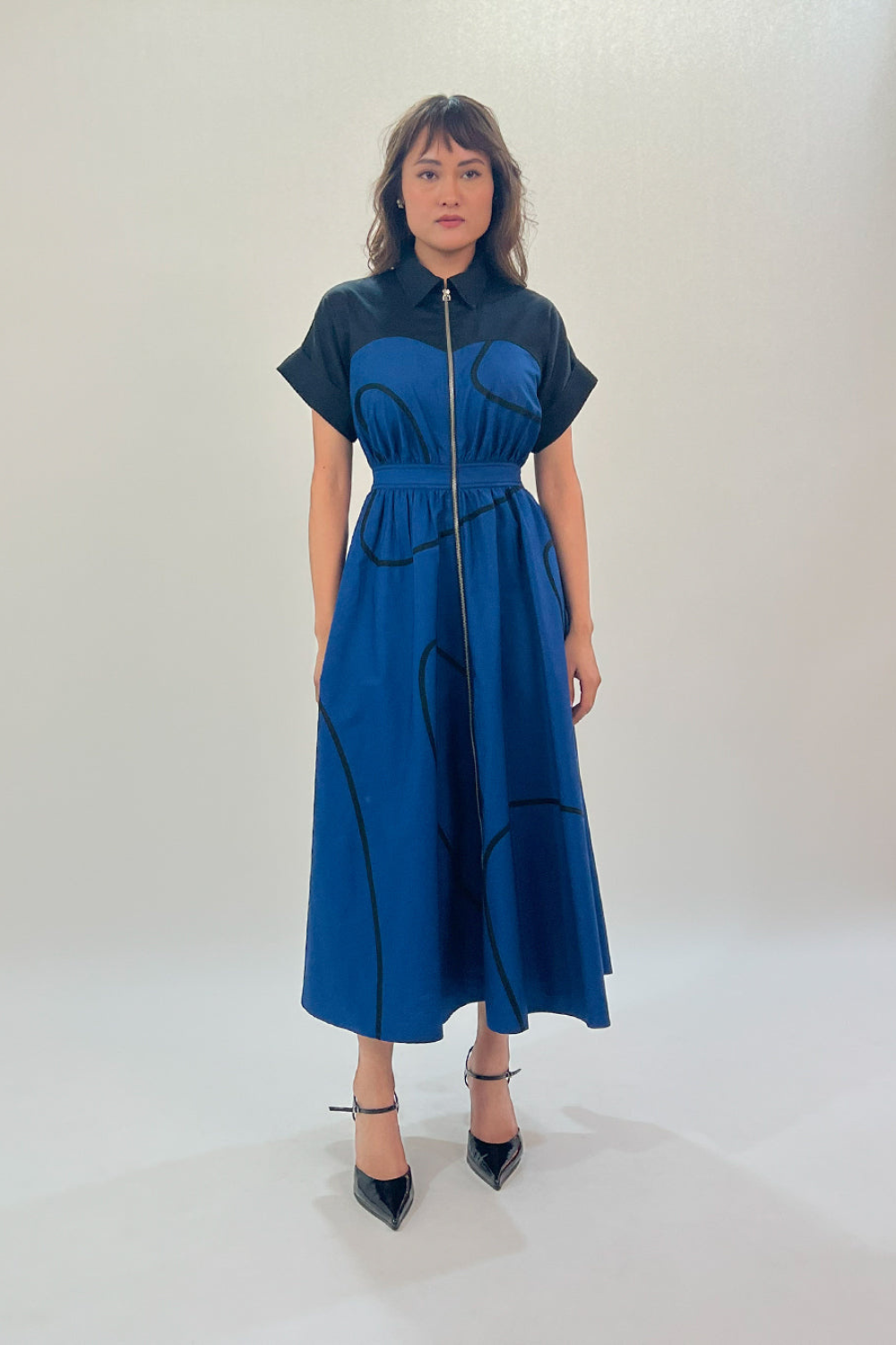 Exuding a perfect mix of style and comfort, this dress features a contrasting upper body with a flattering sweetheart cut. Contrast stem tapes adding a refined touch of detail, while a cinched waistband accentuates the waistline with back elastic ensuring both a comfortable fit and a smooth, structured look. The full frontal zip opening gives the dress a modern, functional edge, making it easy to wear and a dropped shoulder kimono-cuffed sleeves for the relaxed fit. Model wear size S model height is 5'8 garment length is 51"