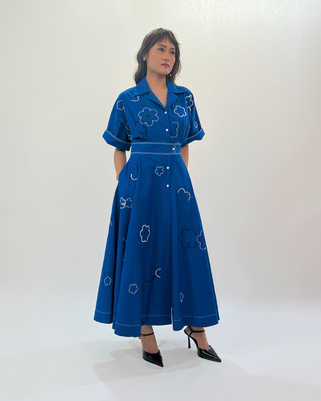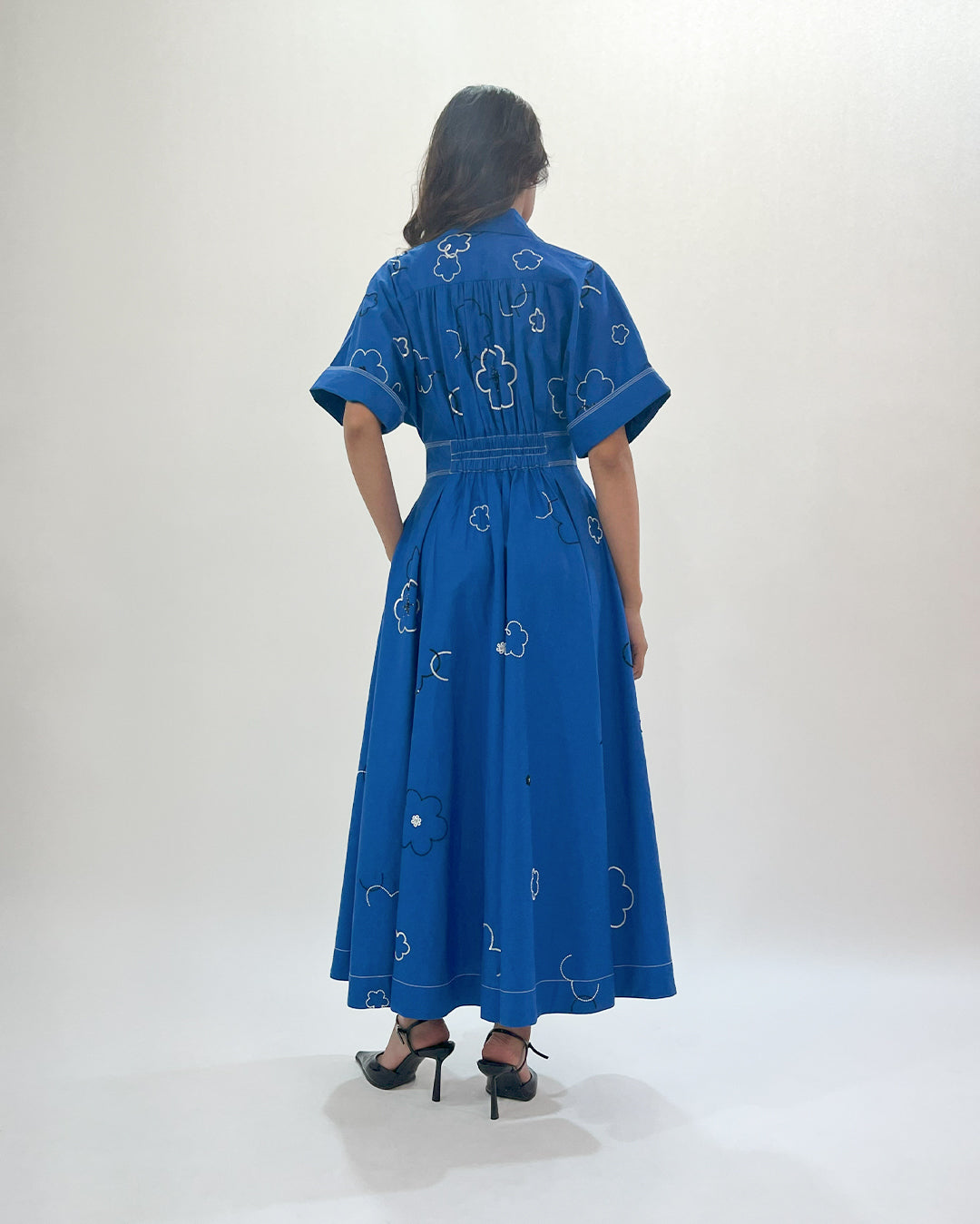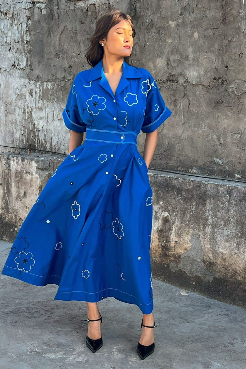 Made of 100% cotton fabric, this dress features intricate bead and sequin floral embellishments. The short kimono cuffed sleeves with contrast top stitching adds visual interest and detail. The back features curved yoke at bodice and an elasticated section at waist for a flexible and comfortable fit, and a cinched waistband accentuates the shape of the dress. The front half opening with button closure provide easy wearability, complementing the flowy circular skirt. Model wear size S model height is 5'8 garment length is 50"