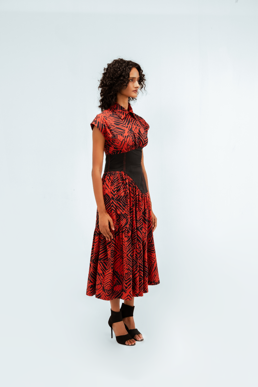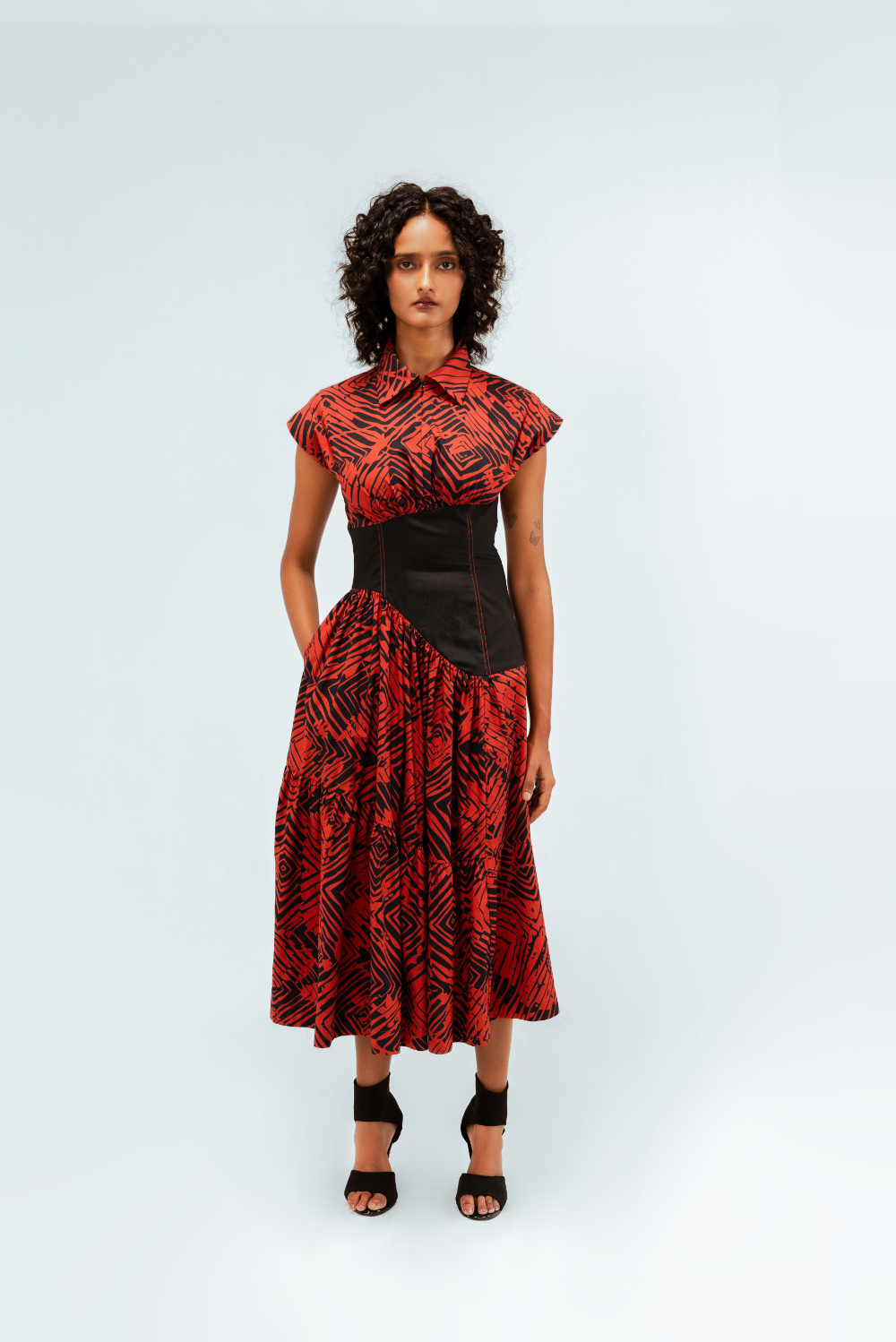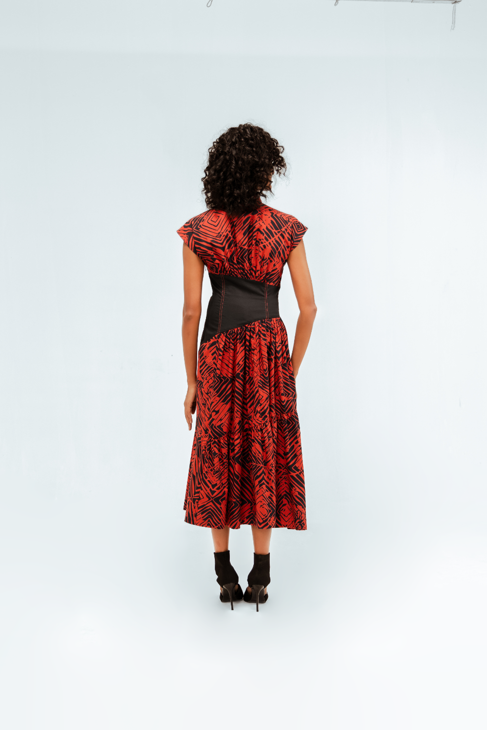 This tiered midi dress in printed cotton features the Florix pattern. The cap-sleeved bodice is sharply collared and is contrasted by a sculpted black waist panel with contrast stitching that accentuates the curves. The tiered skirt adds volume and movement, creating a dramatic yet balanced silhouette. Model Height is 5'9". Model wears size S. Garment length is 50"