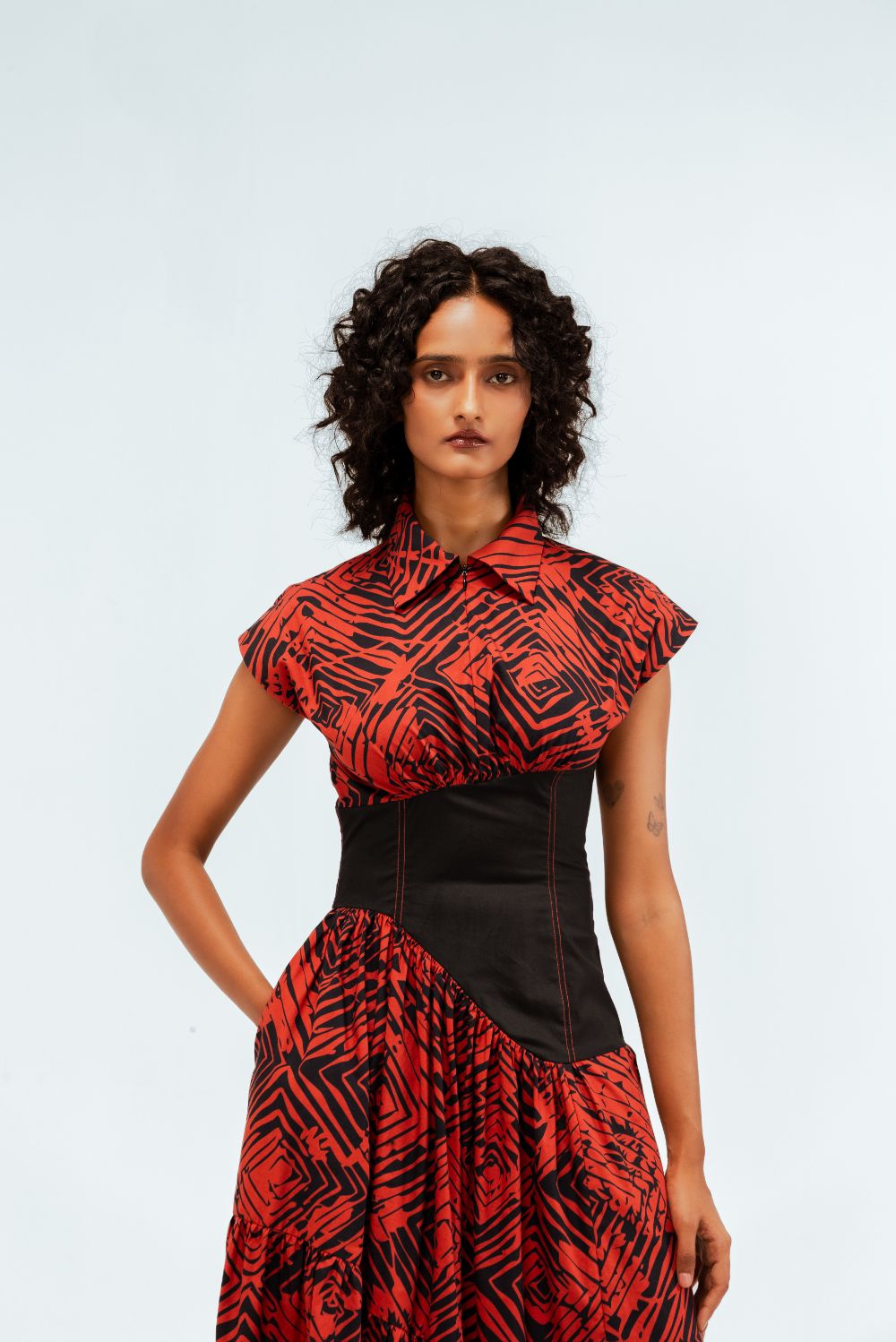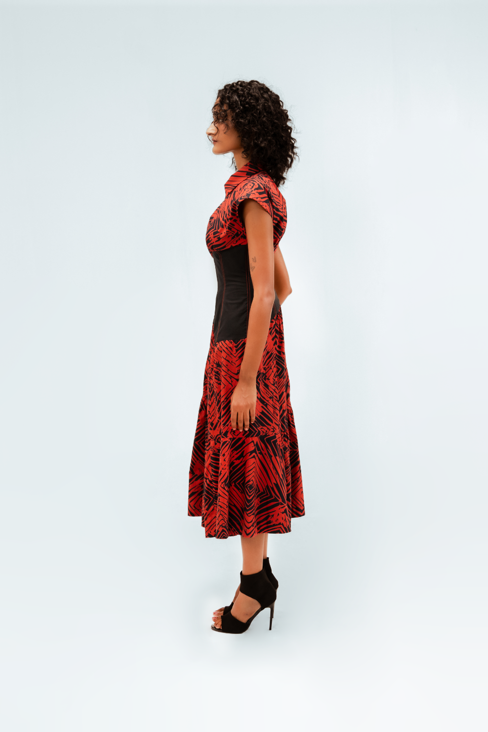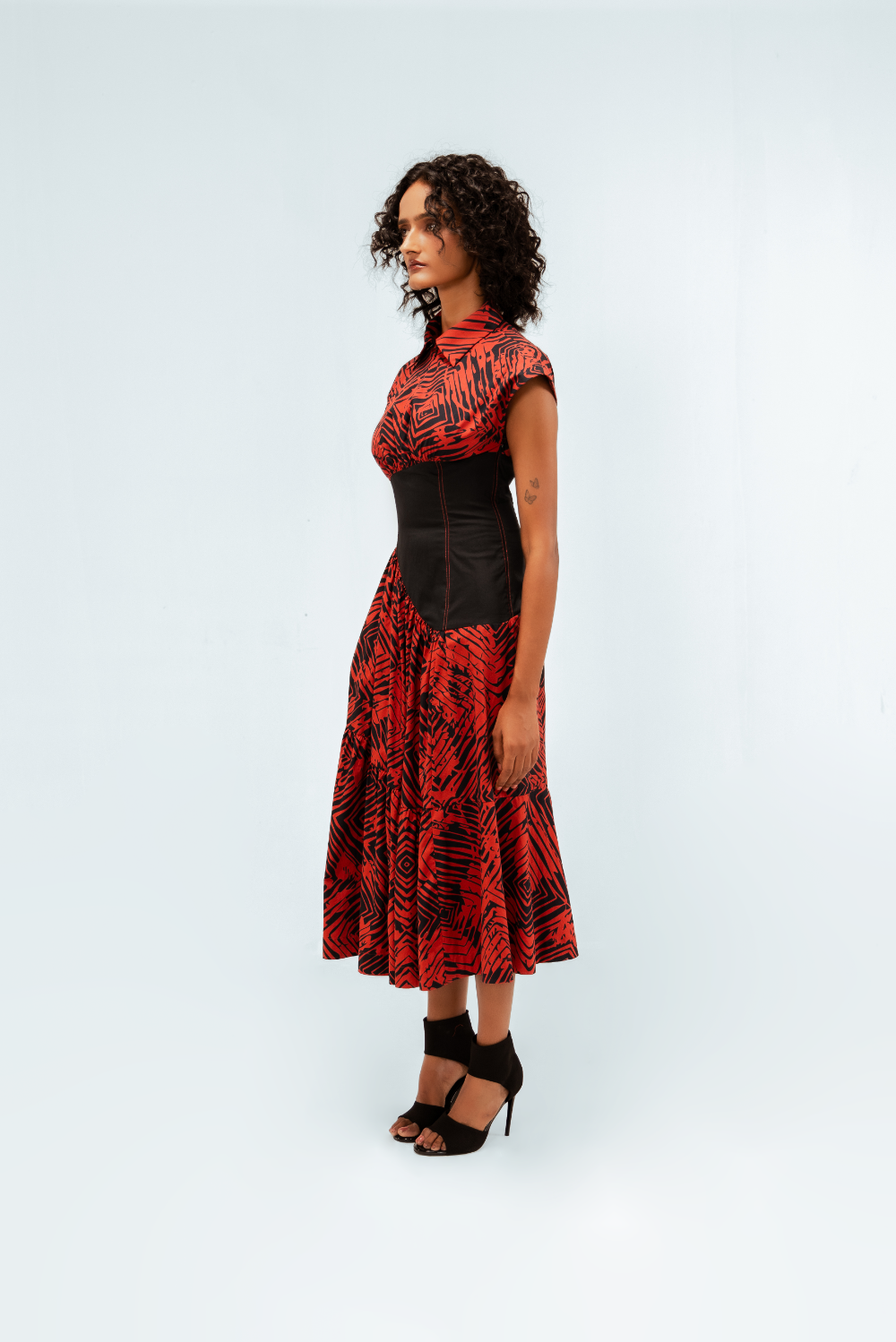 This tiered midi dress in printed cotton features the Florix pattern. The cap-sleeved bodice is sharply collared and is contrasted by a sculpted black waist panel with contrast stitching that accentuates the curves. The tiered skirt adds volume and movement, creating a dramatic yet balanced silhouette. Model Height is 5'9". Model wears size S. Garment length is 50"